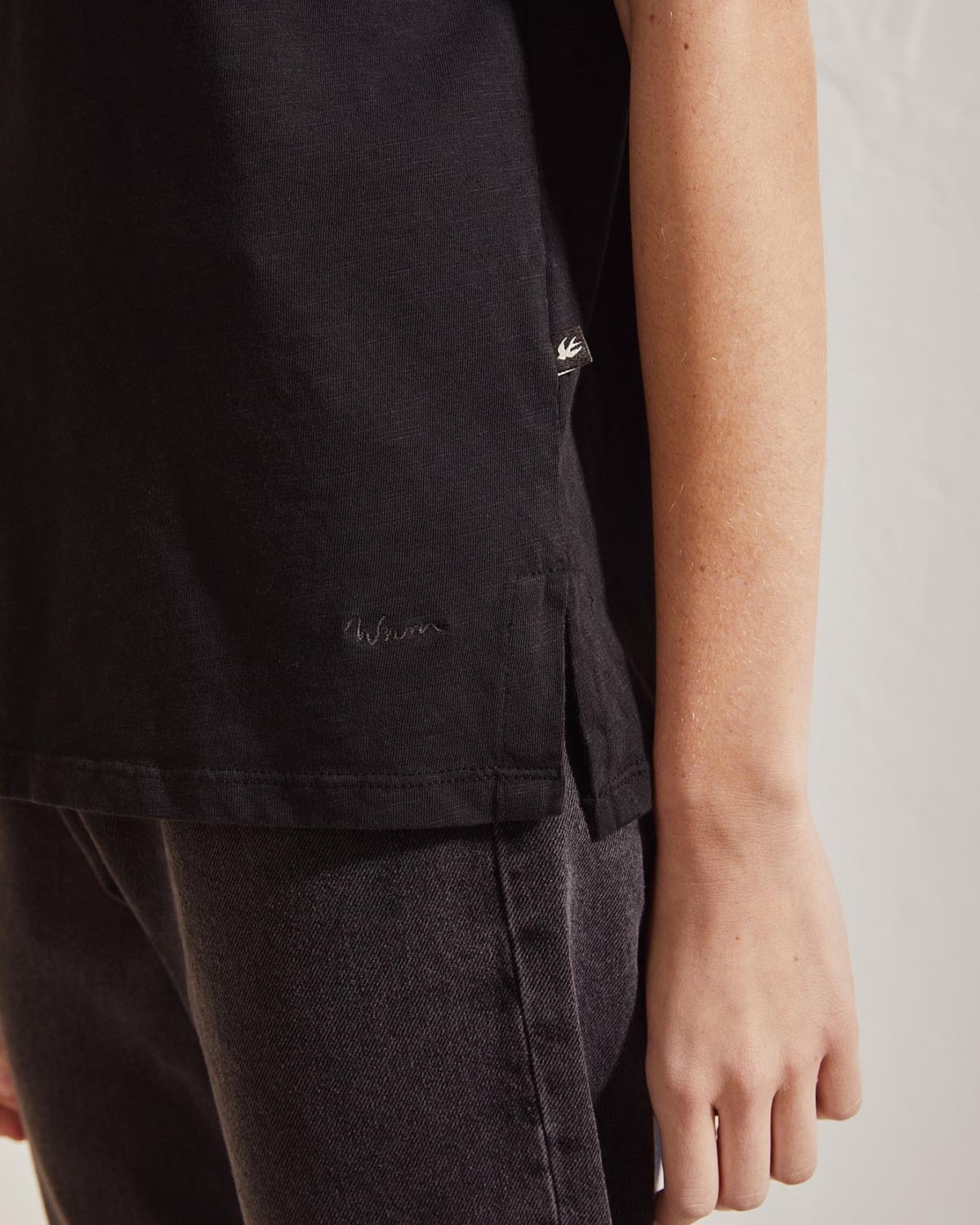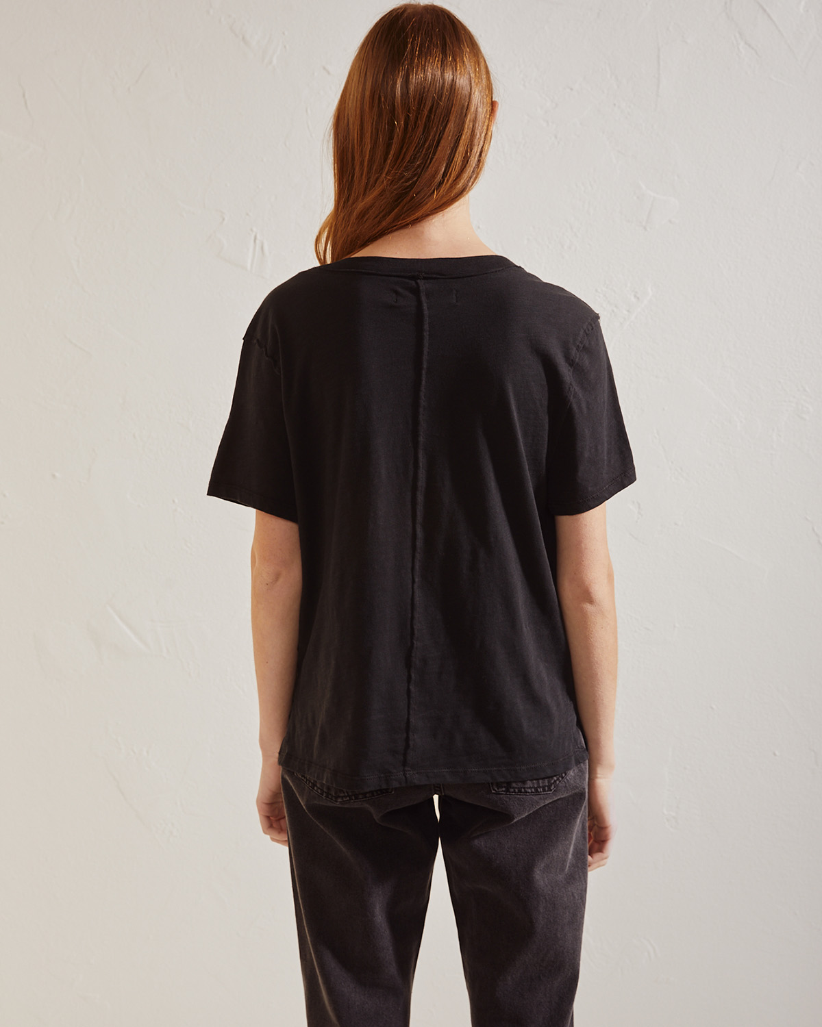 REMERA ESCOTE V MANGA CORTE DE CALCE HOLGADO. TIENE BORDADO EN DELANTERO