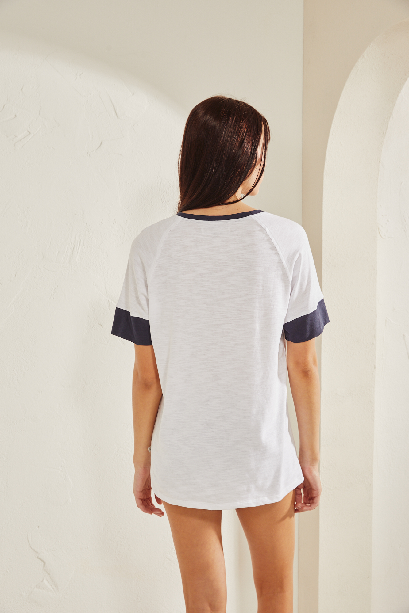 REMERA CONFECCIONADA EN JERSEY FLAMÉ CON ESTAMPA EN SU DELANTERO.