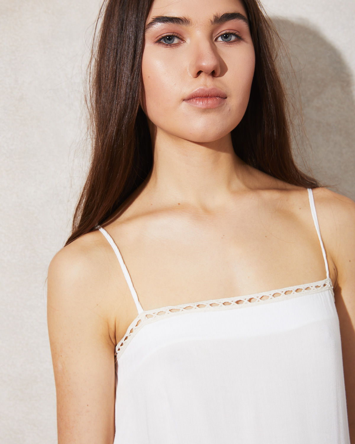 TOP BRETELERO CONFECCIONADO EN VOILE 100% VISCOSA, ESCOTE RECTO Y DETALLE DE TERMINACIÓN DE PUNTILLA DE ALGODÓN.
