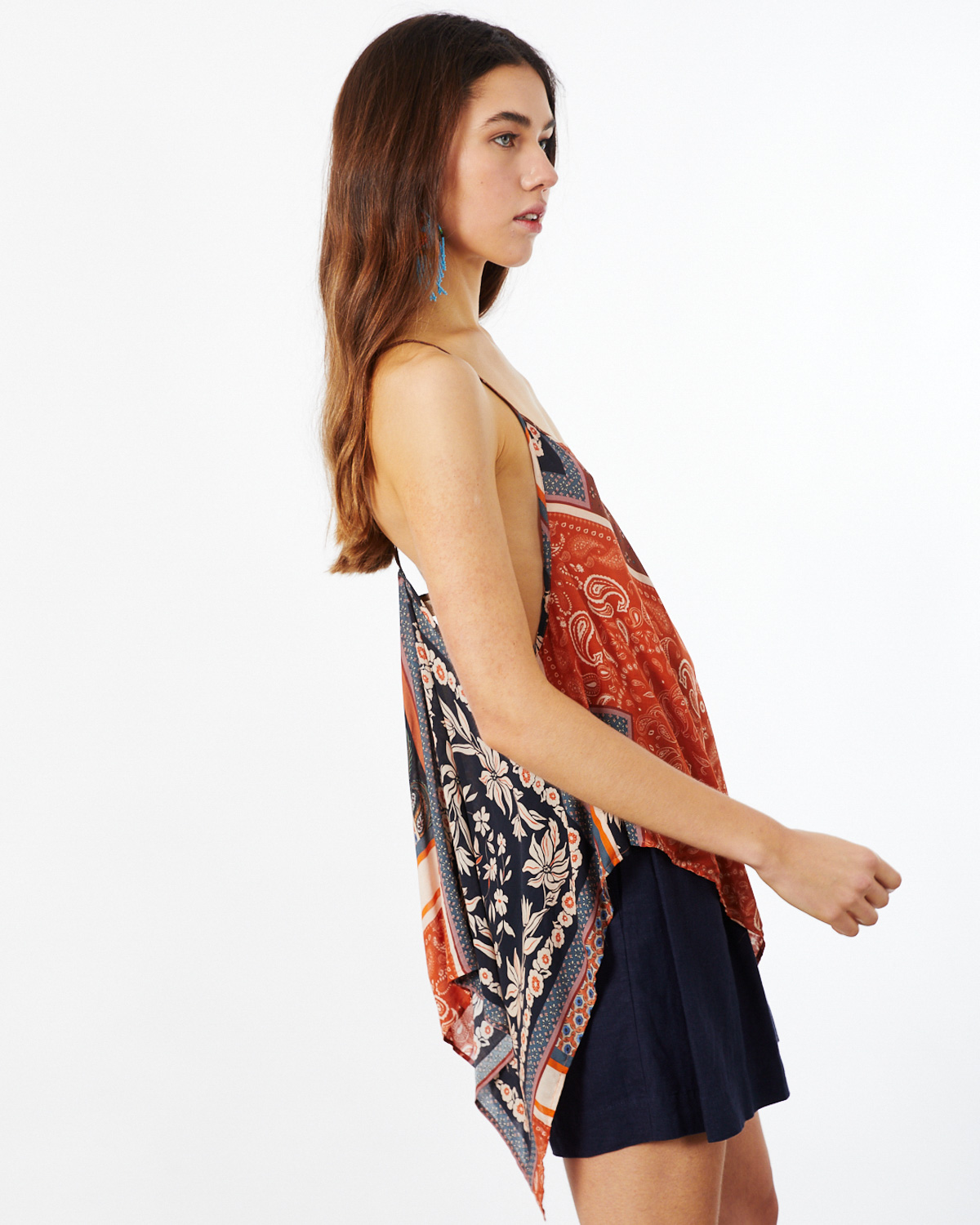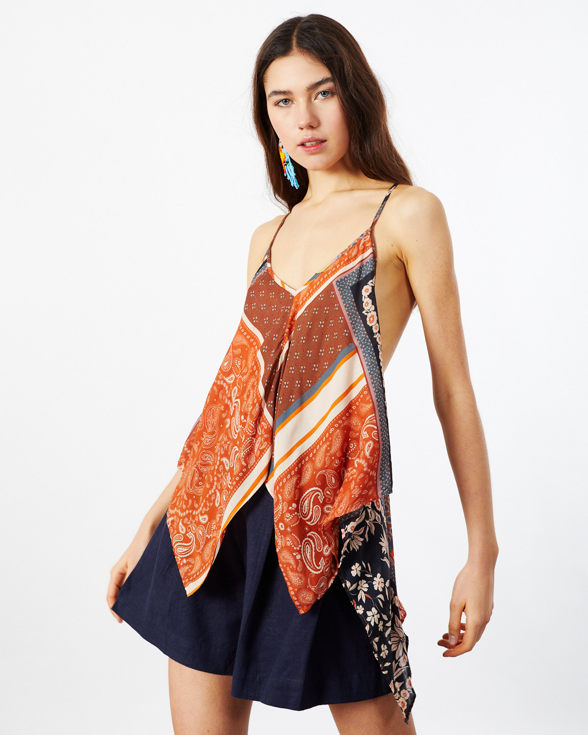 TOP CONFECCIONADO EN VOILE DE VISCOSA ESTAMPADA CON TERMINACIÓN EN PICOS, CON BRETELES REGULABLES Y ARANDELA DE CAREY EN LA ESPALDA.