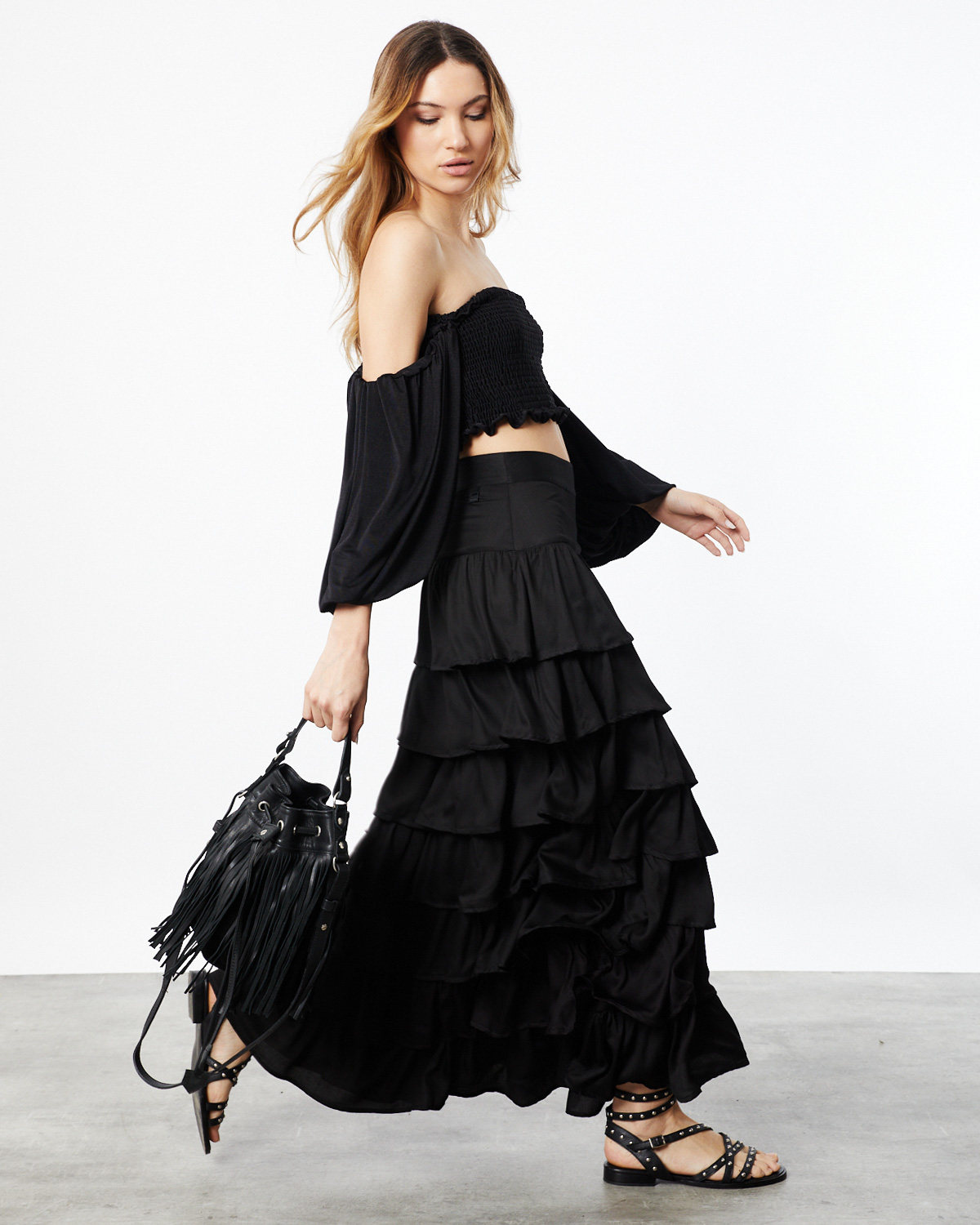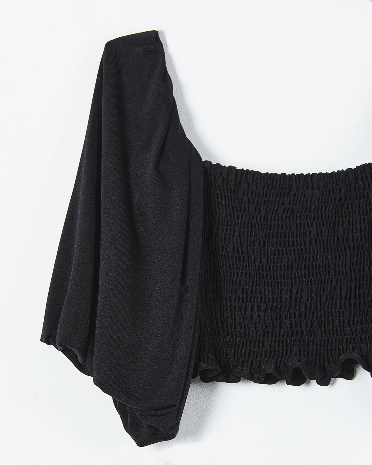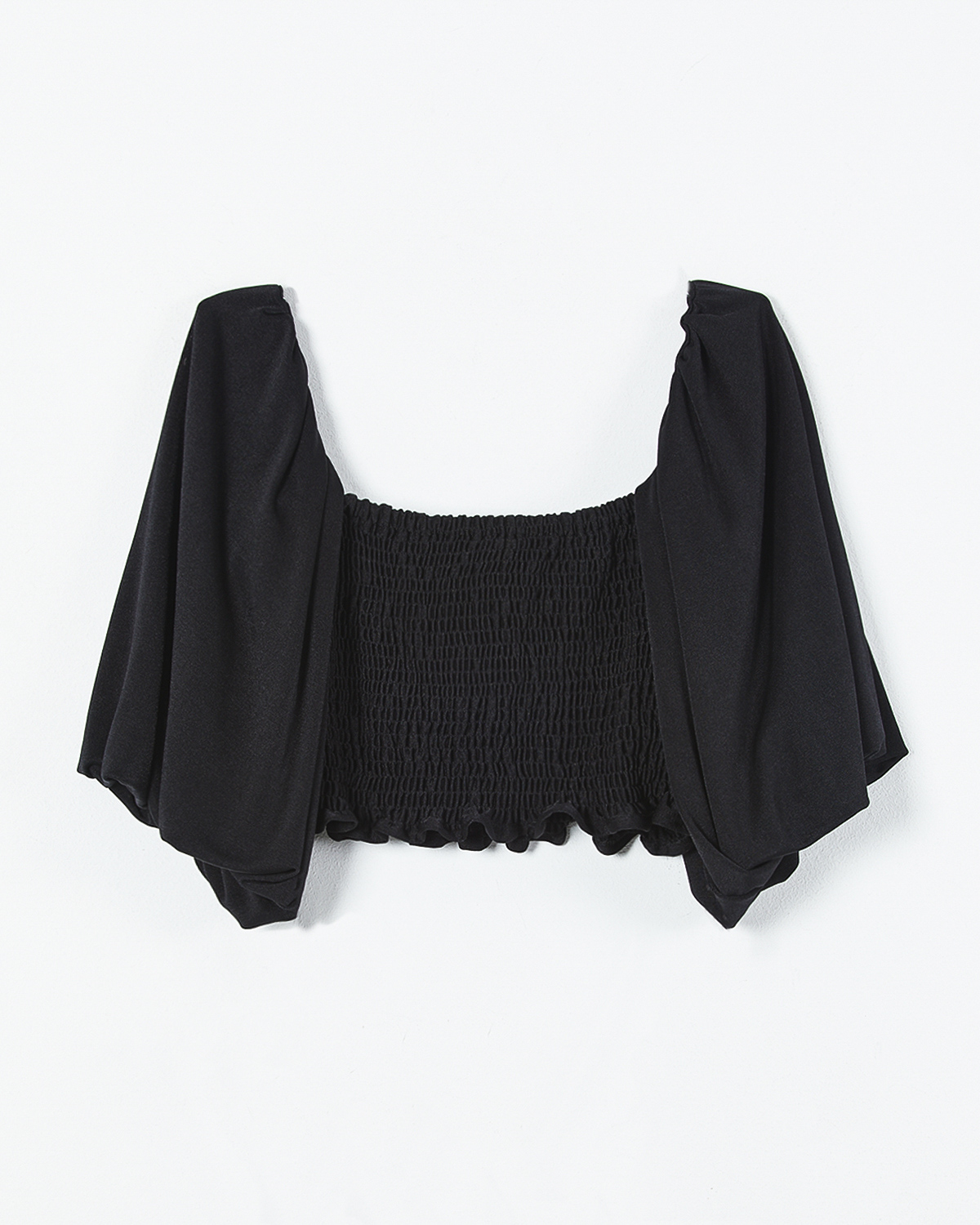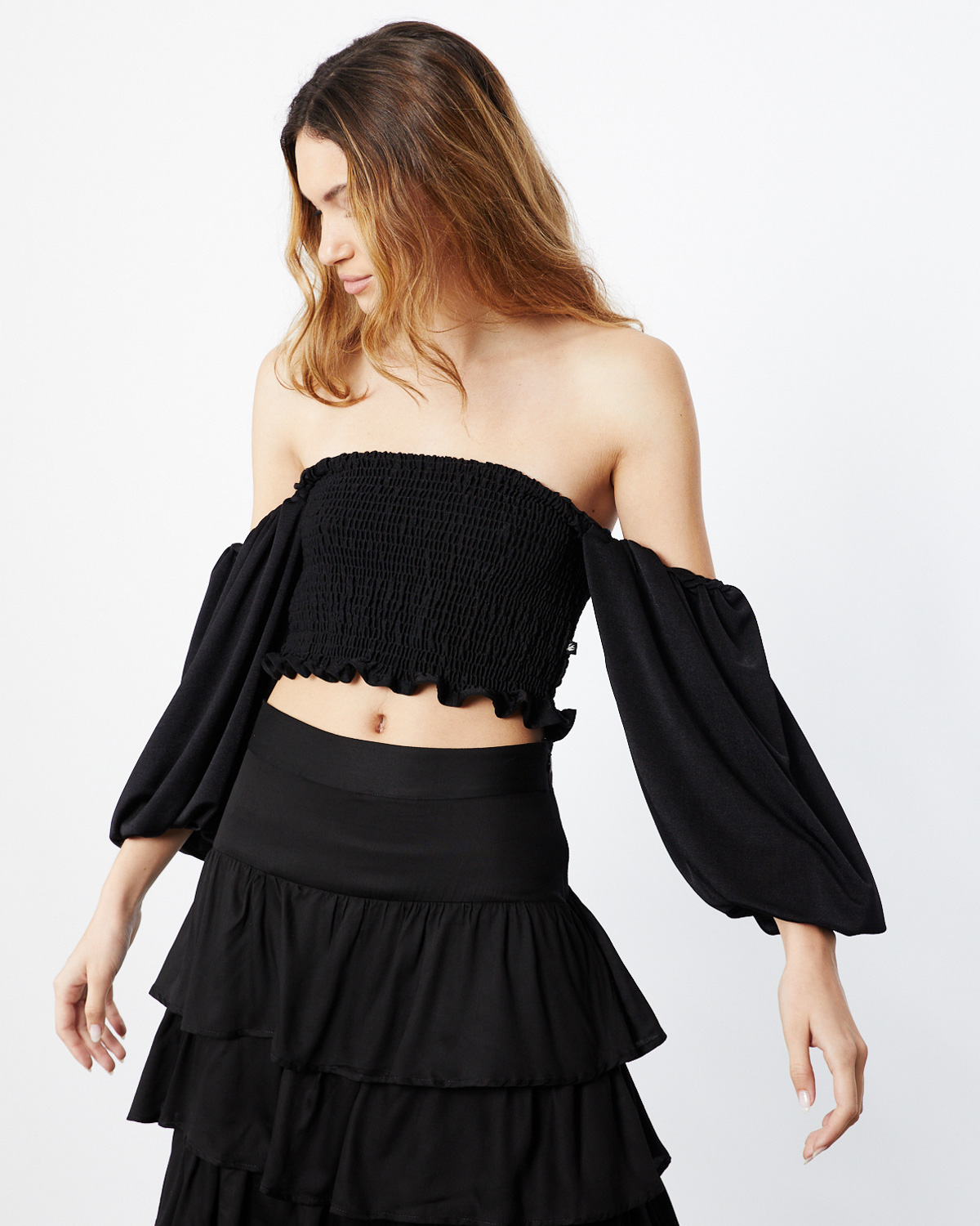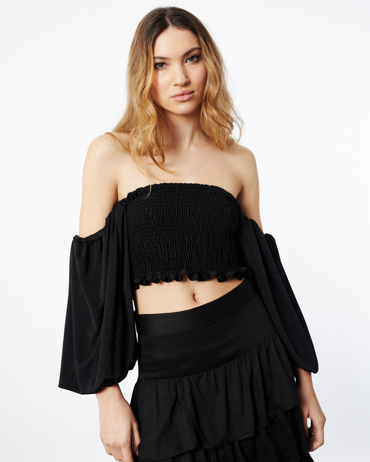 TOP REALIZADO EN KNITTING NIGHT 92% POLIESTER 8% SPANDEX, CON MANGAS BALOOM Y PUNTO SMOCK EN DELANTERO Y ESPALDA.