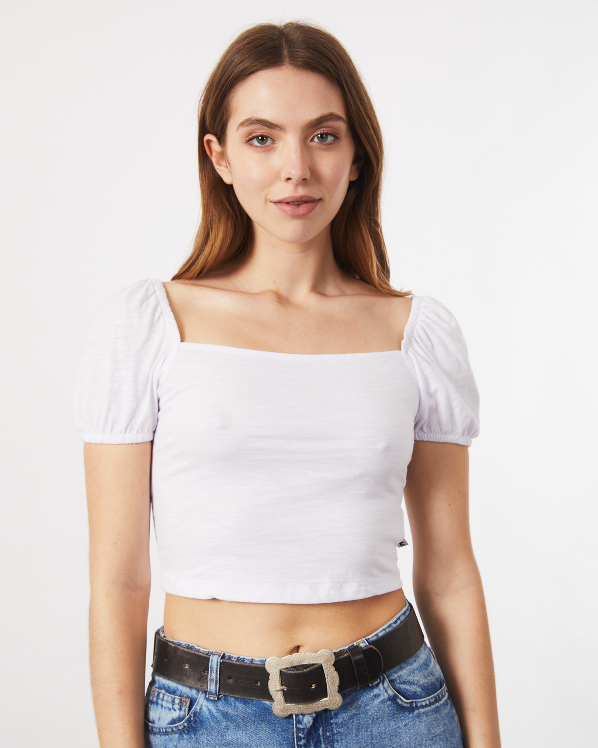 ESCOTE CUADRADO Y MANGAS CON ELASTICO INTERNO.