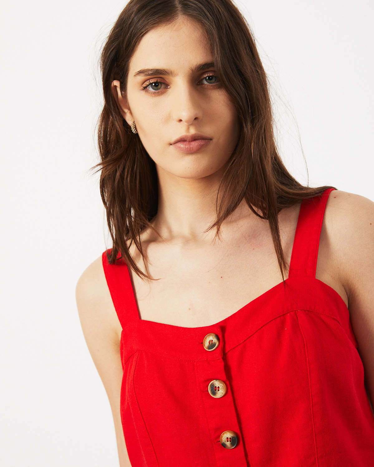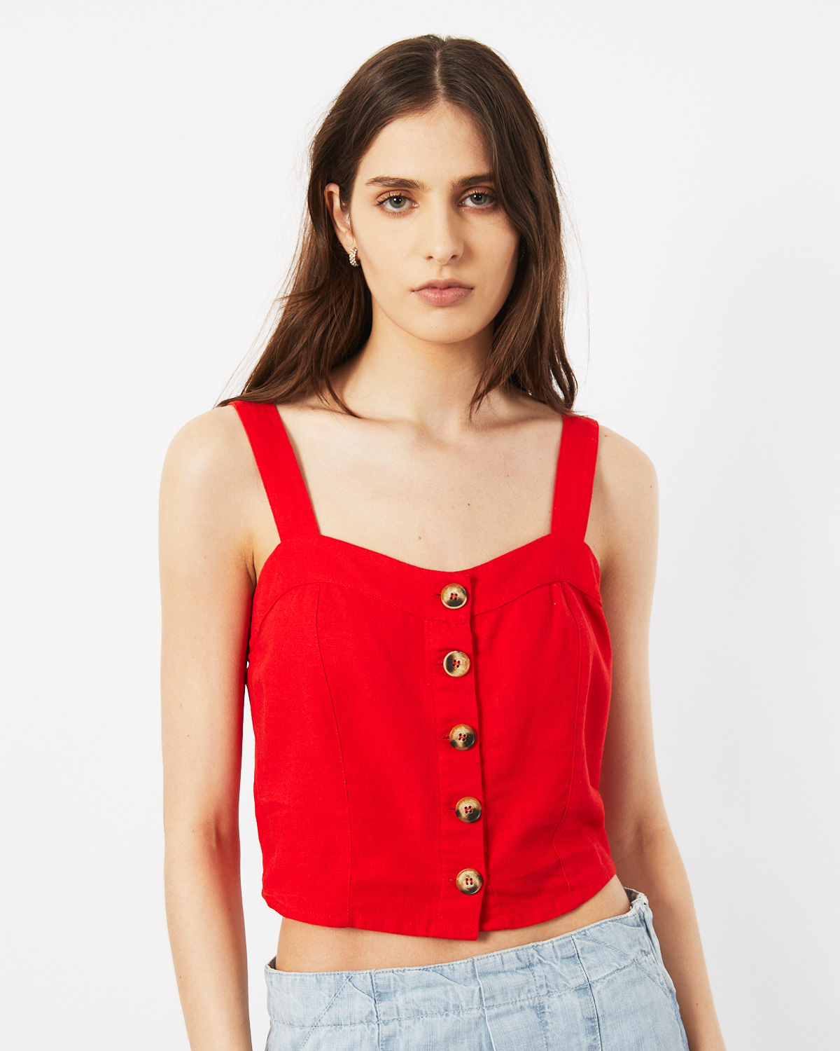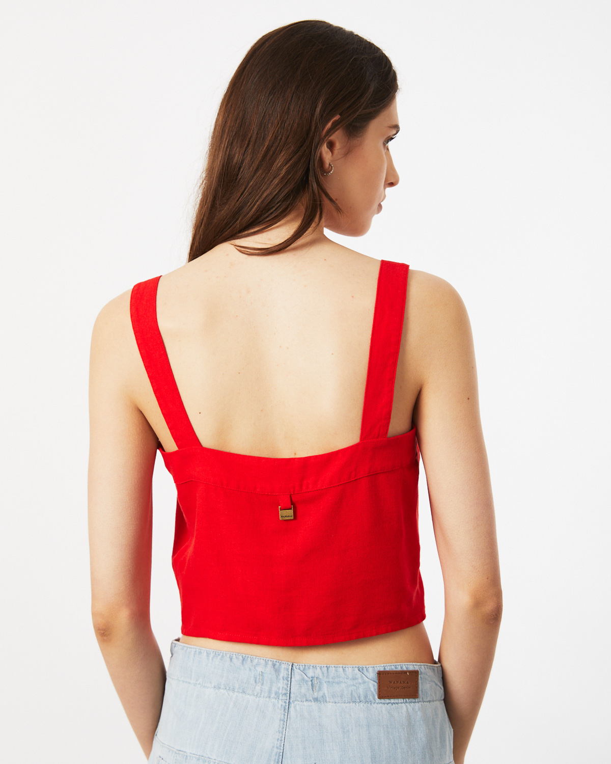 TOP CONFECCIONADO EN LINO RAYON CON PINZAS EN DELANTERO DE ENTALLE Y BOTONES VETEADOS.