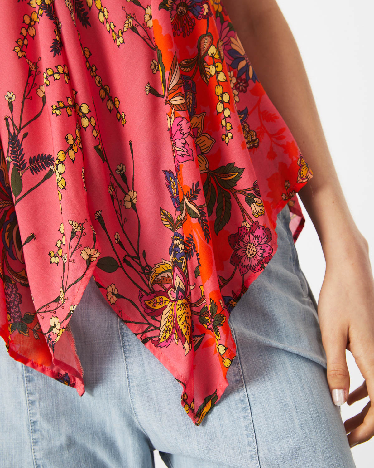 TOP CONFECCIONADO EN VOILE DE VISCOSA ESTAMPADA CON TERMINACIÓN EN PICOS, CON BRETELES REGULABLES Y ARANDELA DE CAREY EN LA ESPALDA.