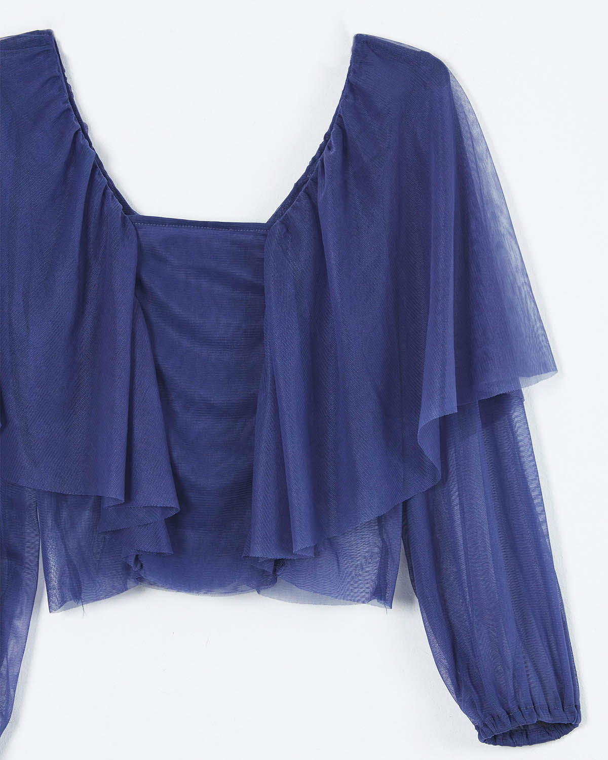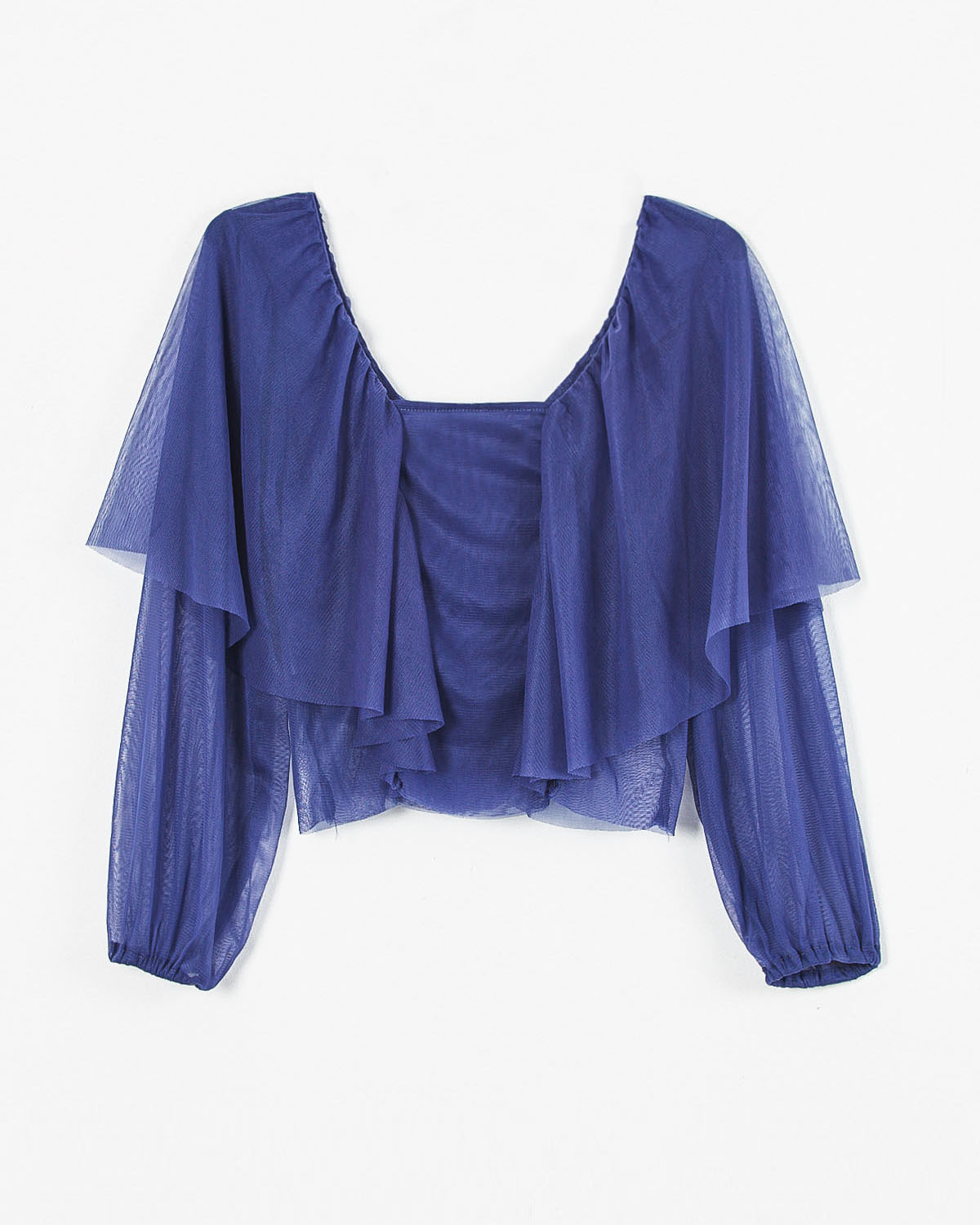 TOP REALIZADO EN MICROTUL, CONTIENE VOLADOS EN EL FRENTE Y LA ESPALDA. LAS MANGAS SON BALLOON CON TERMINACIÓN AL CORTE.
