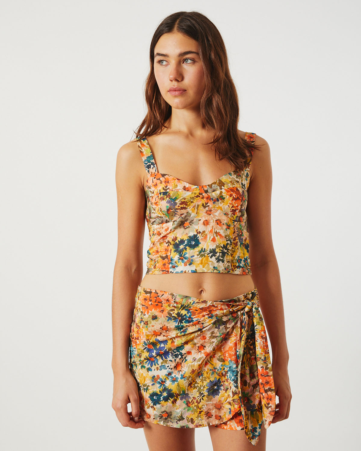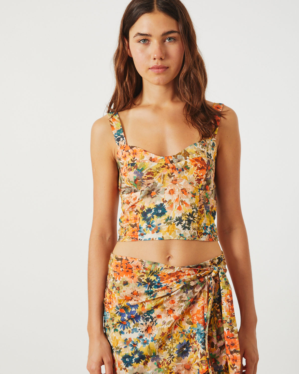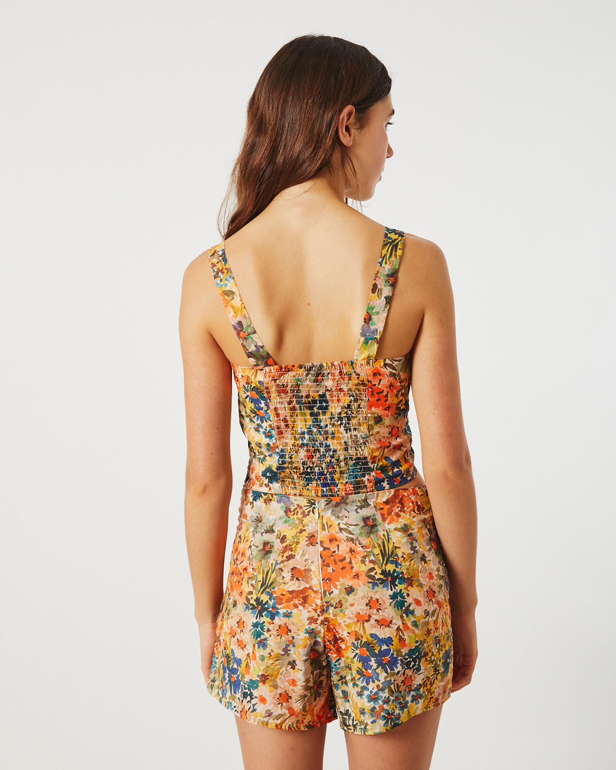 TOP TIPO BUSTIER CONFECCIONADO EN VISCOSA ESTAMPADA. ESCOTE CORAZON, CON PUNTO SMOCK EN ESPALDA Y BRETELES ANCHOS.