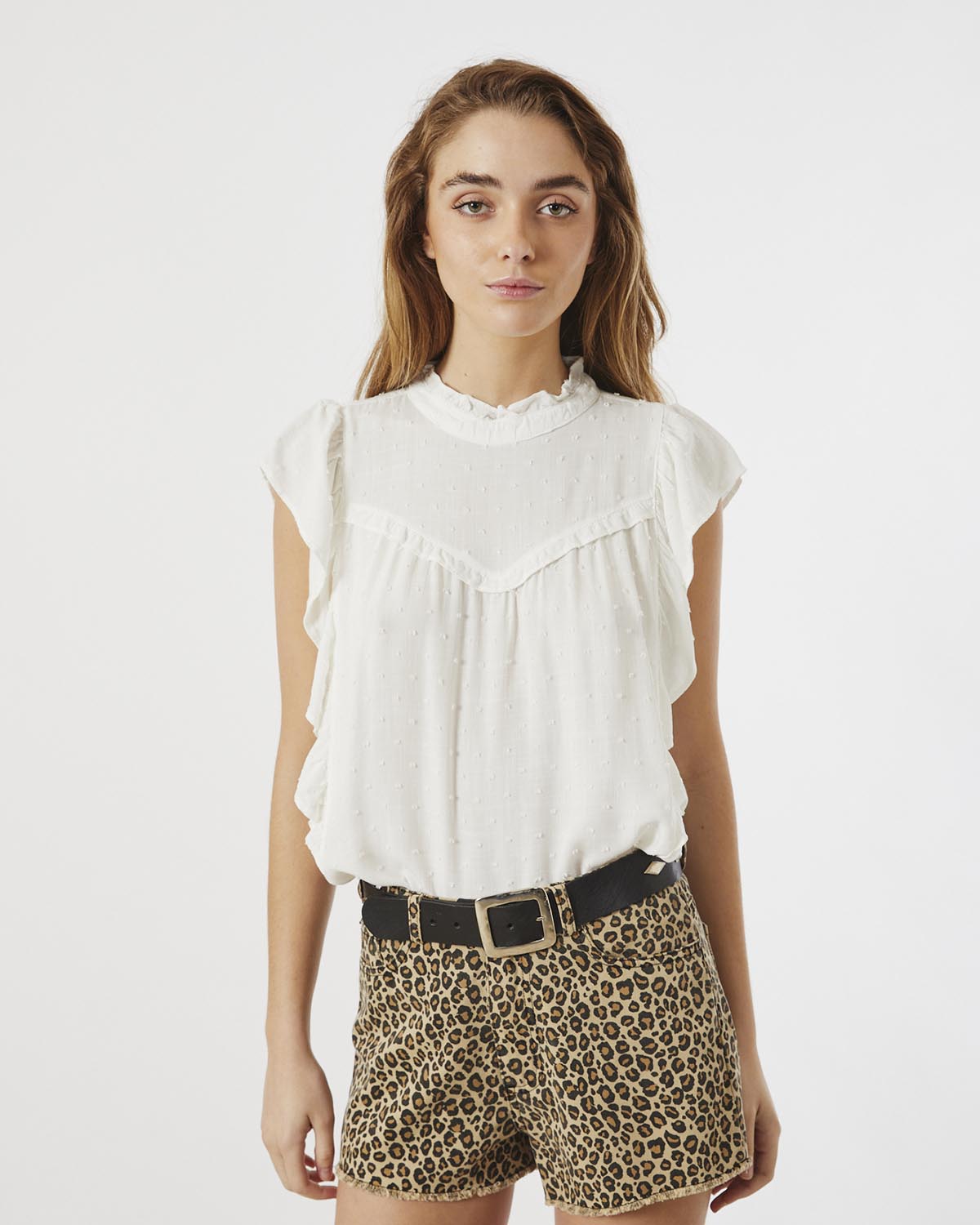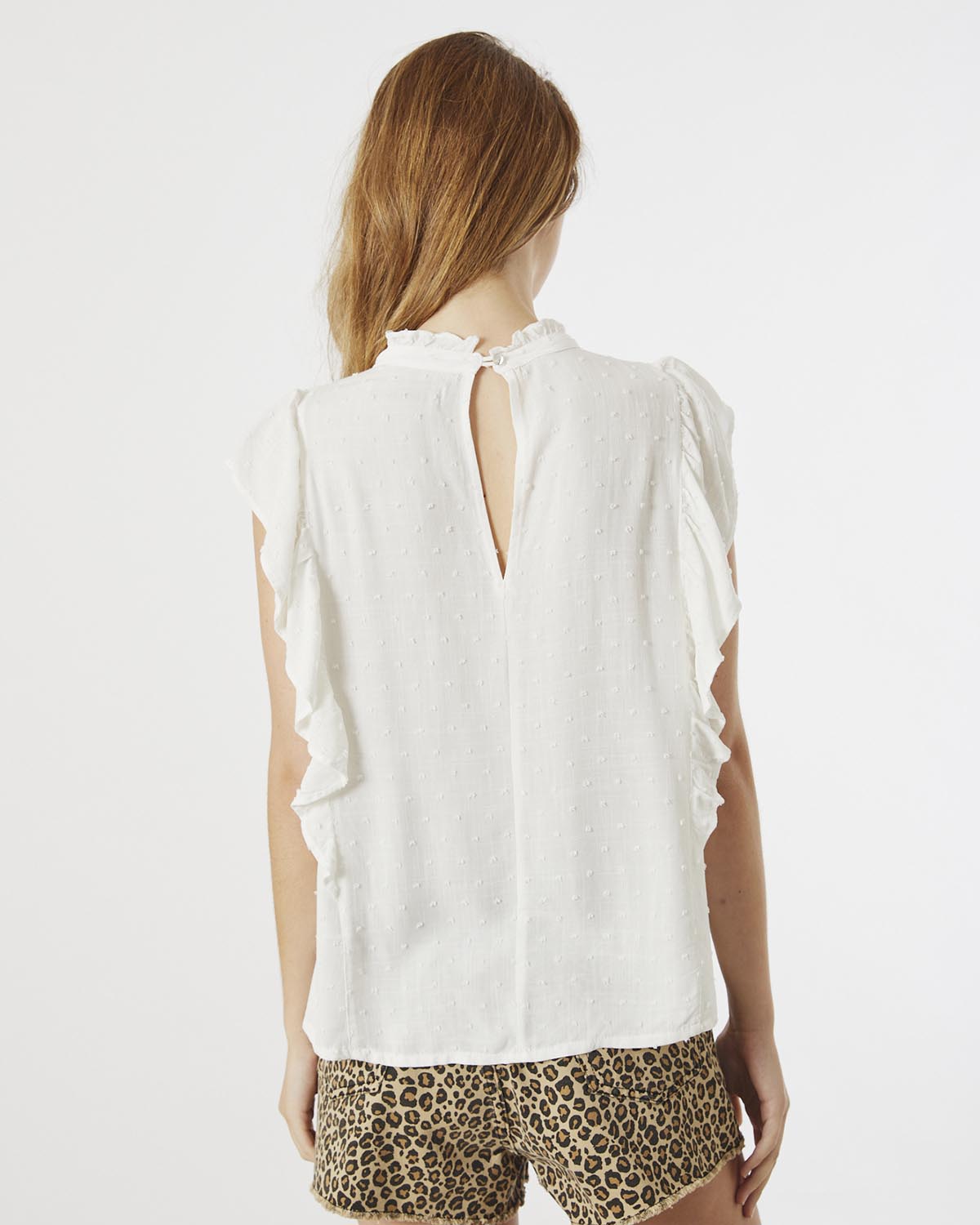 TOP CONFECCIONADO EN PLUMETTI DE RAYON. VOLADITOS EN CUELLO FRENTE Y MANGAS.