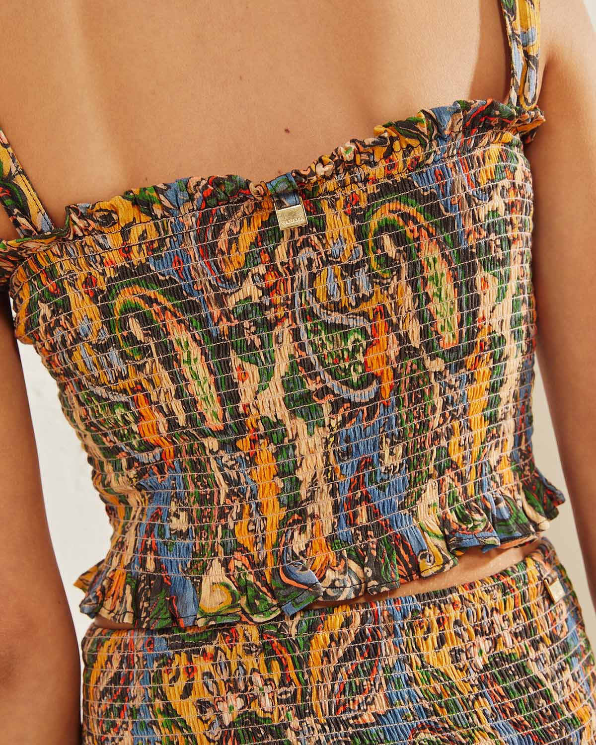 TOP AL CUERPO CONFECCIONADO EN VISCOSA ESTAMPADA. CON PUNTO SMOCK Y BRETELES ANCHOS.