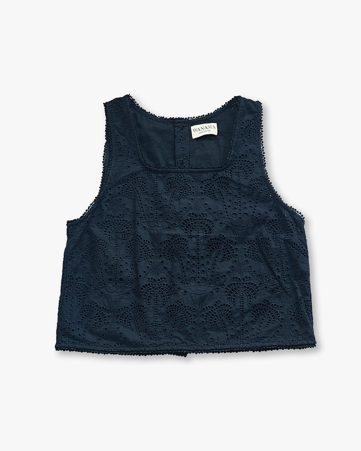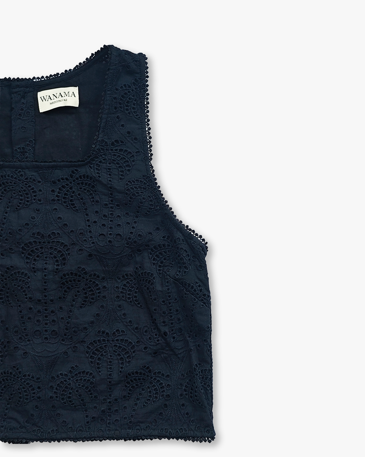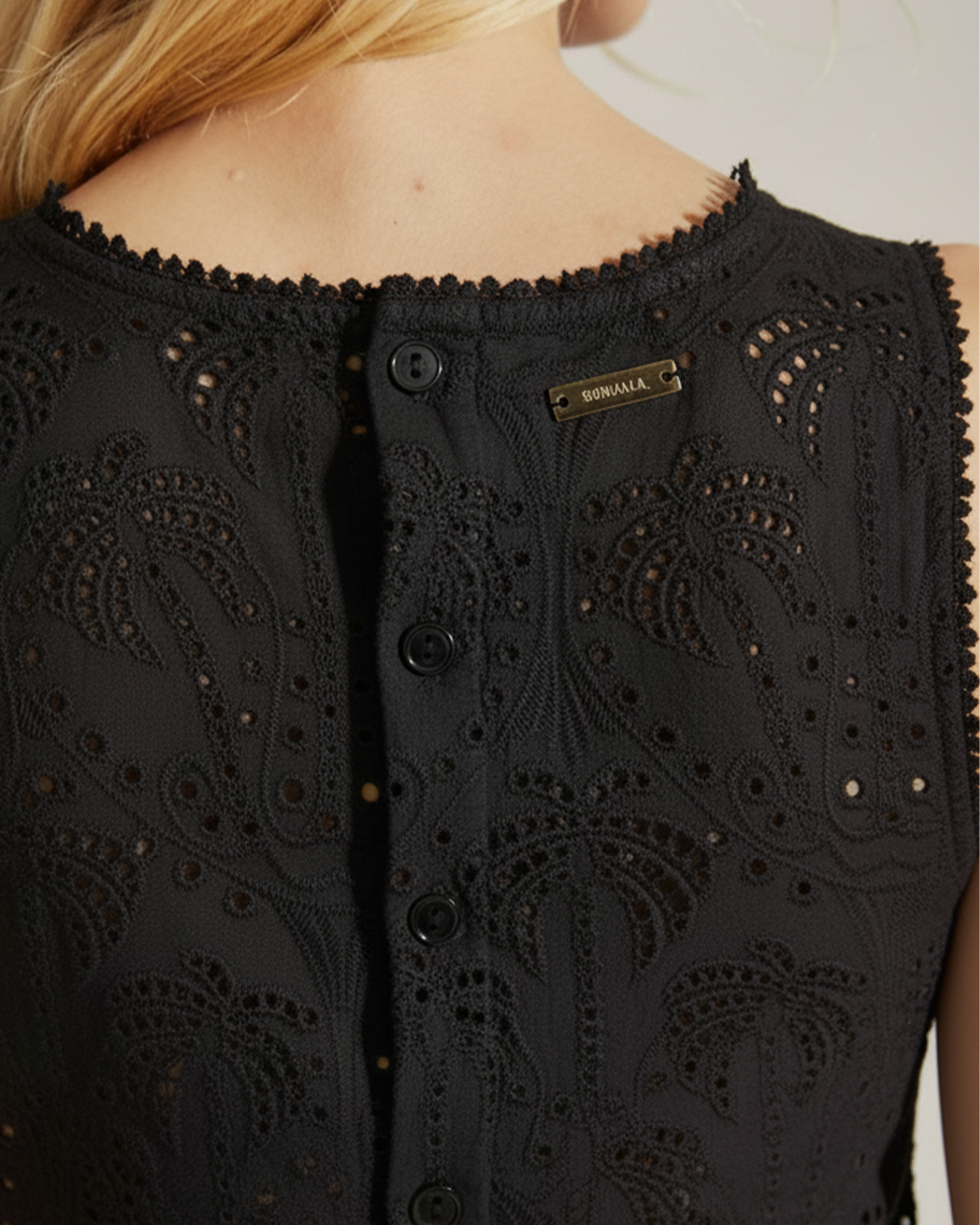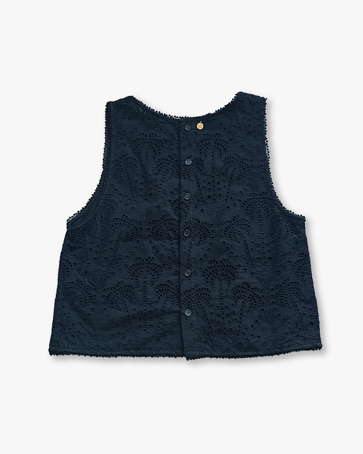 TOP RECTO CON CARTERA DE BOTONES EN LA ESPALDA CONFECCIONADO EN BRODERIE DE ALGODON 100%