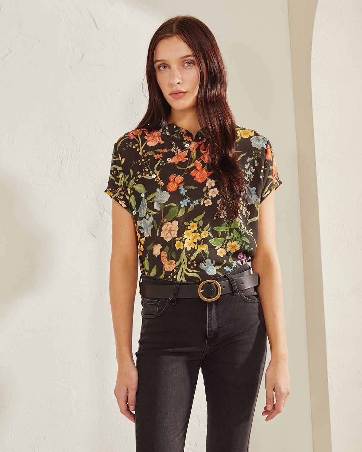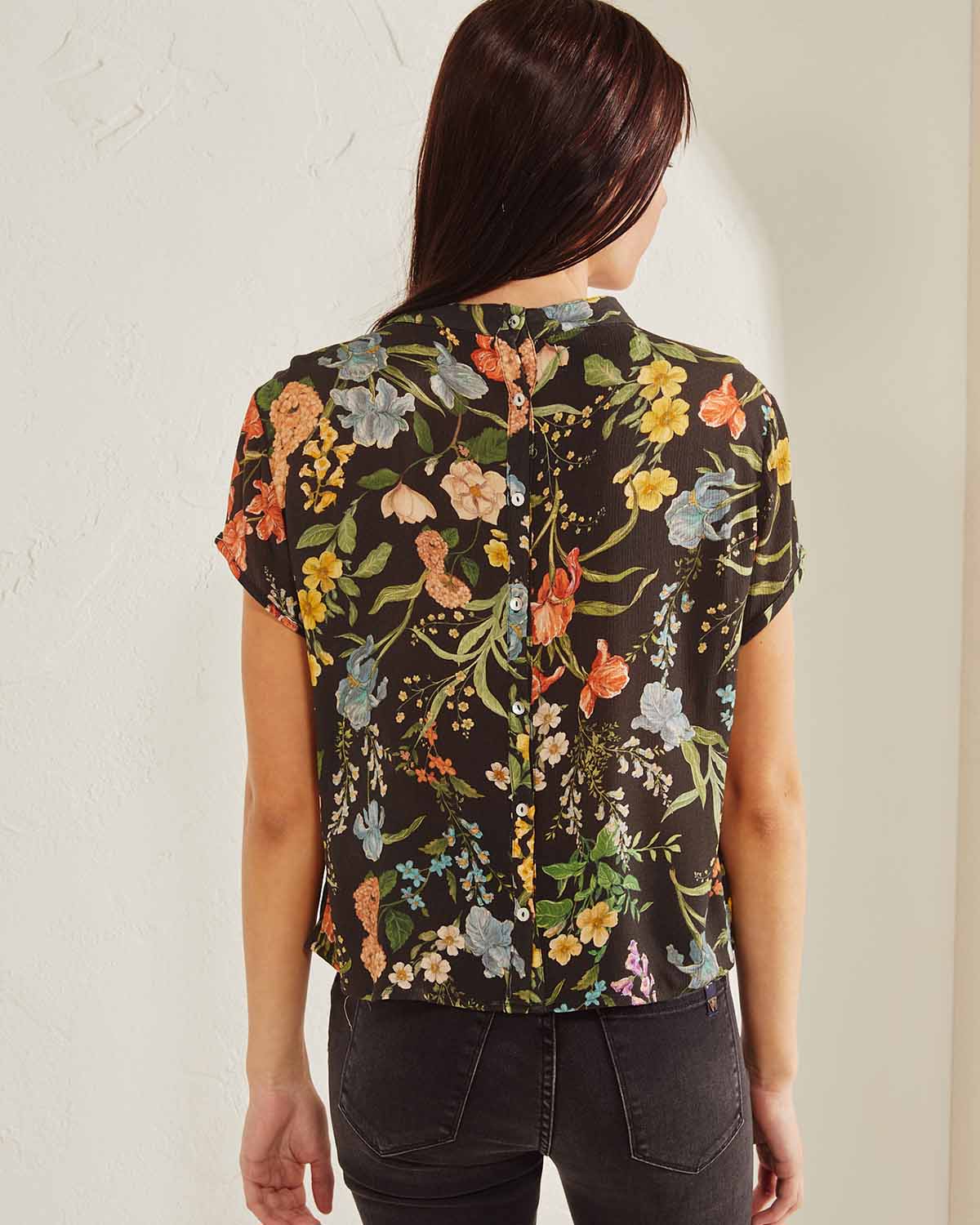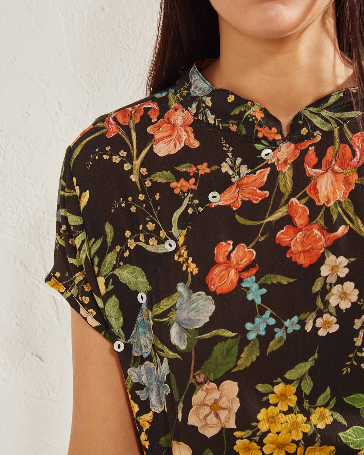 TOP DE CALCE REGULAR CONFECCIONADO EN BAMBULA DE VISCOSA ESTAMPADA. CON CUELLO MAO Y ACCESO POR CARTERA ABOTONADA EN ESPALDA.
