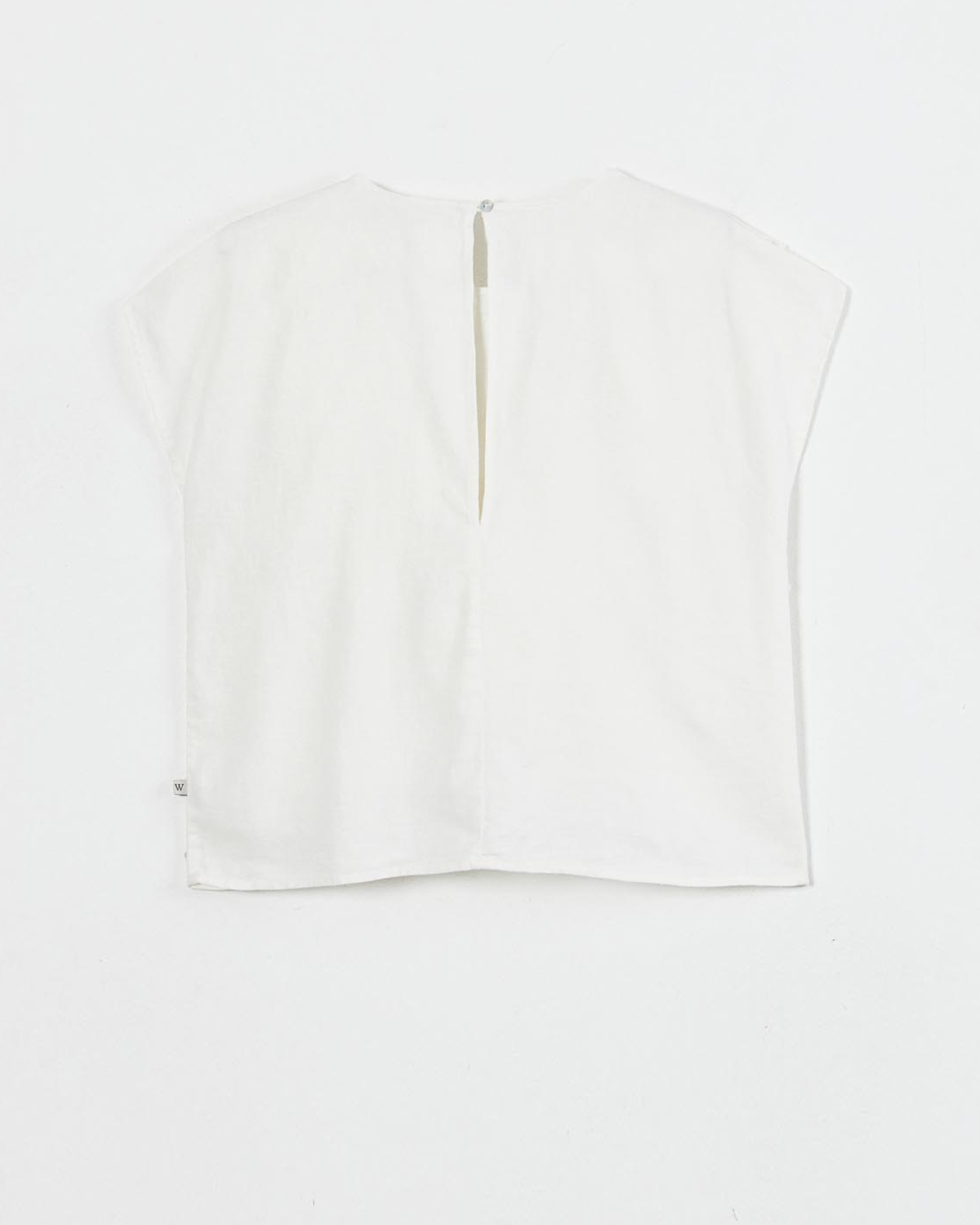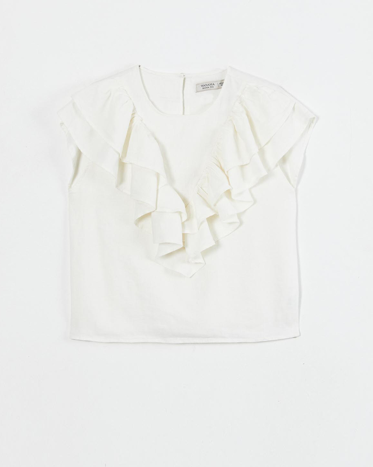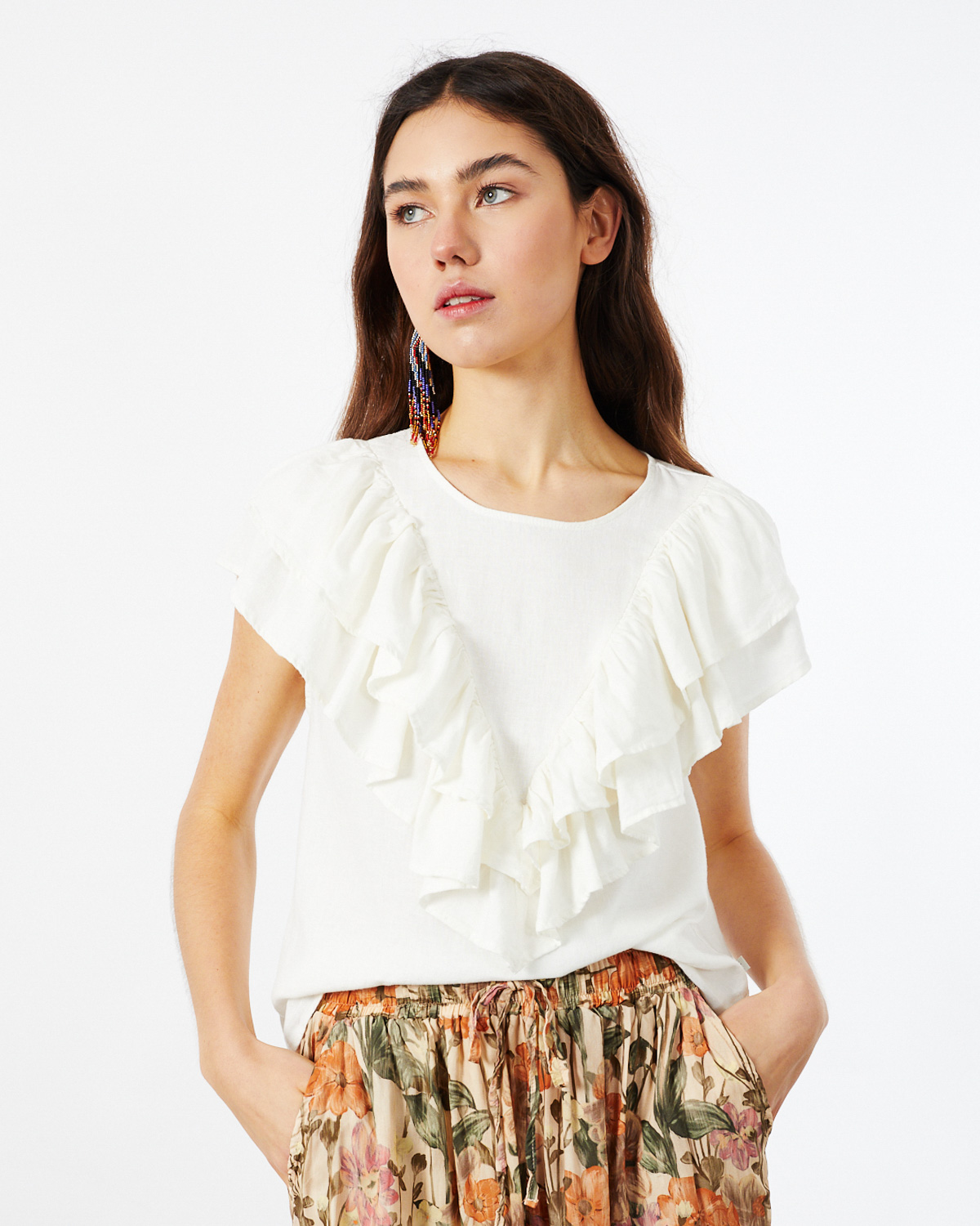 TOP REALIZADO EN LINO CAMISERO, CON DETALLE DE VOLADOS EN DELANTERO Y ACCESO A LA PRENDA POR LA ESPALDA.