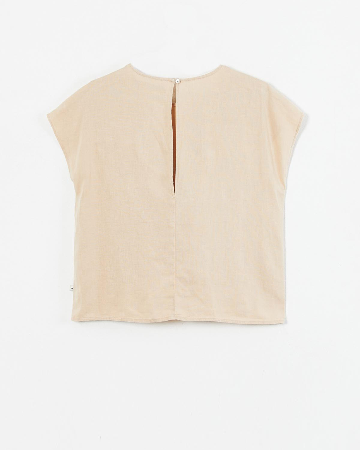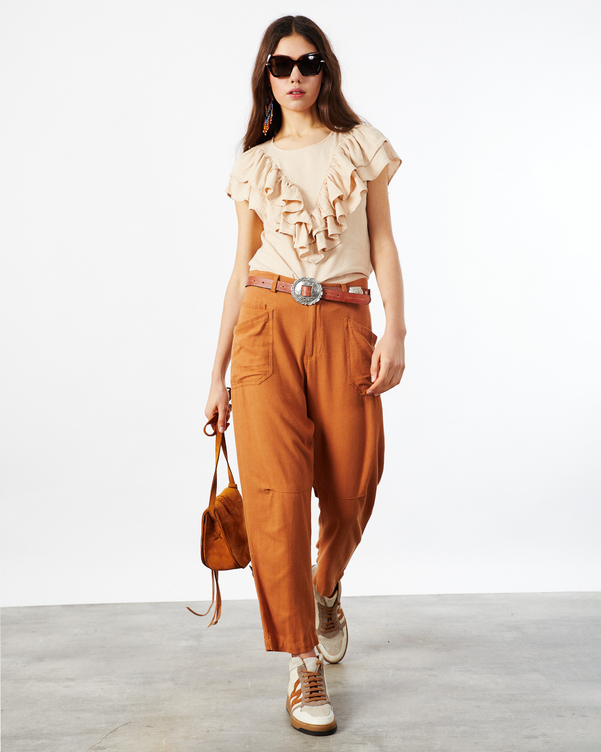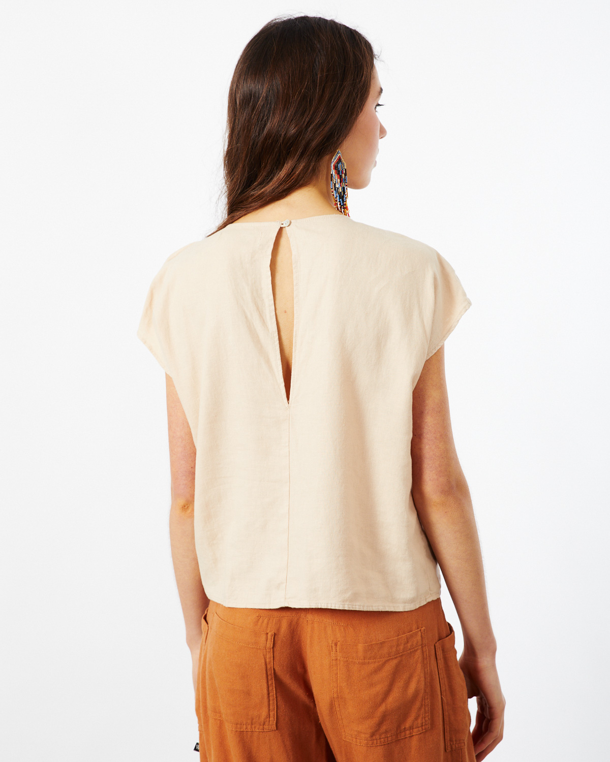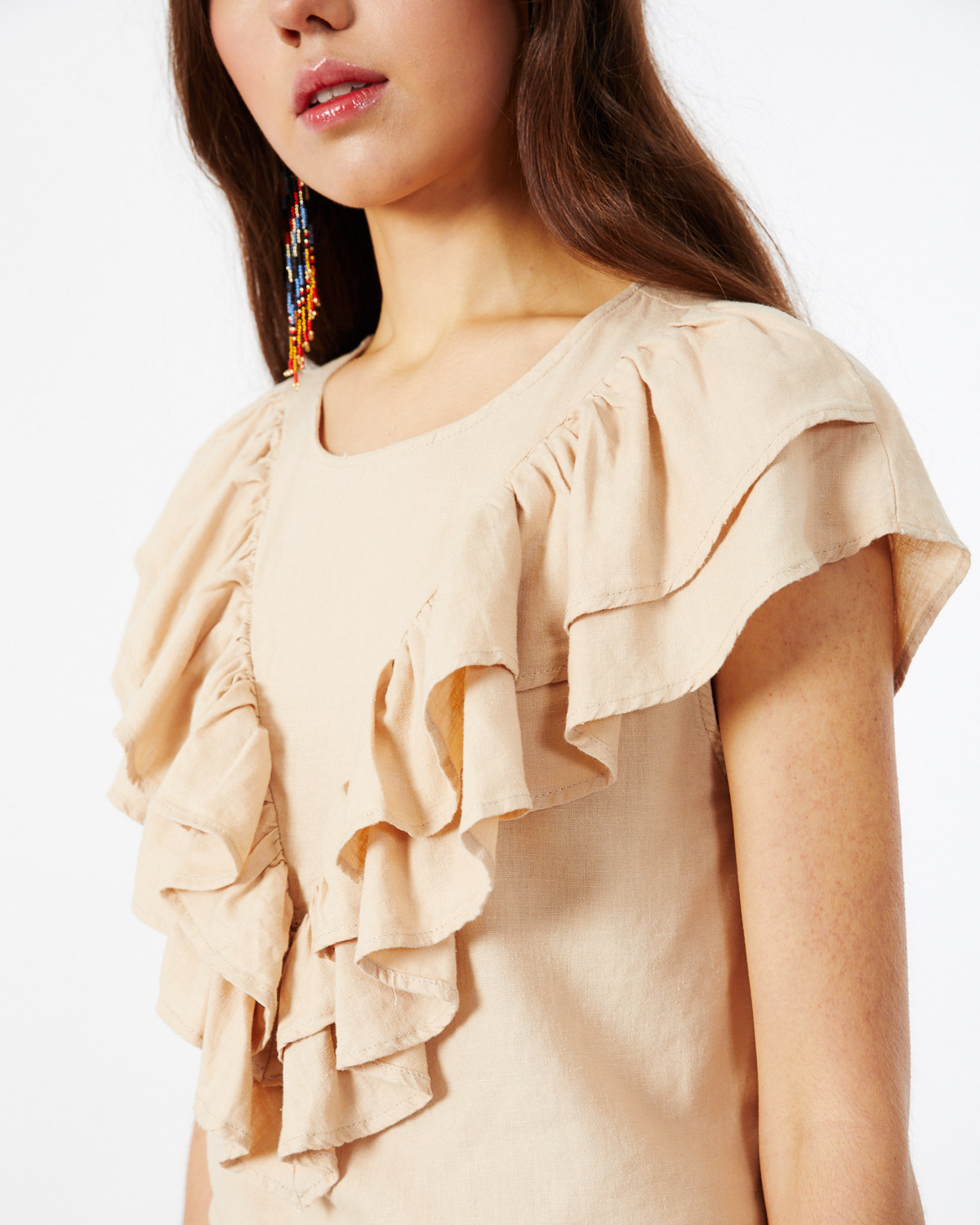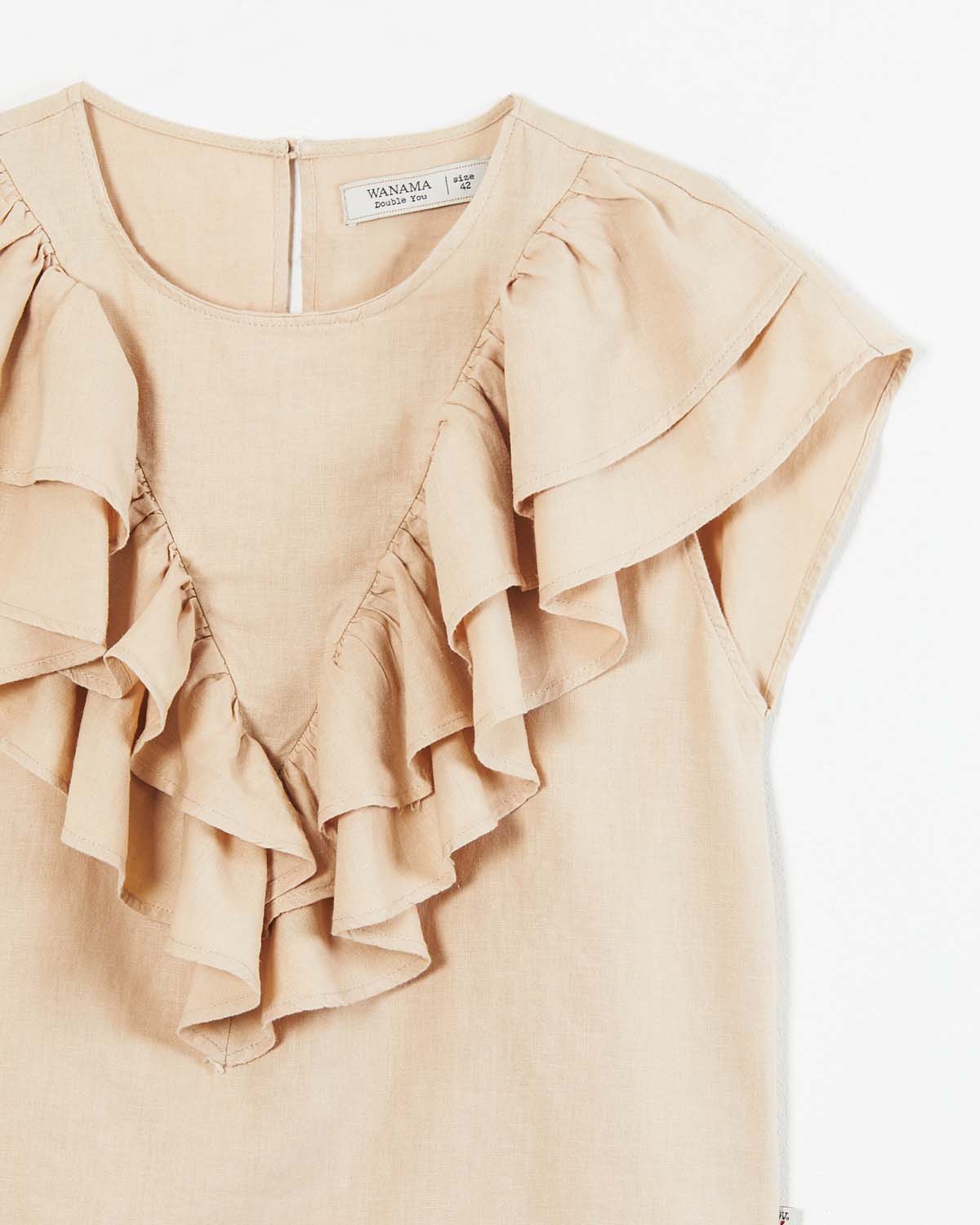 TOP REALIZADO EN LINO CAMISERO, CON DETALLE DE VOLADOS EN DELANTERO Y ACCESO A LA PRENDA POR LA ESPALDA.