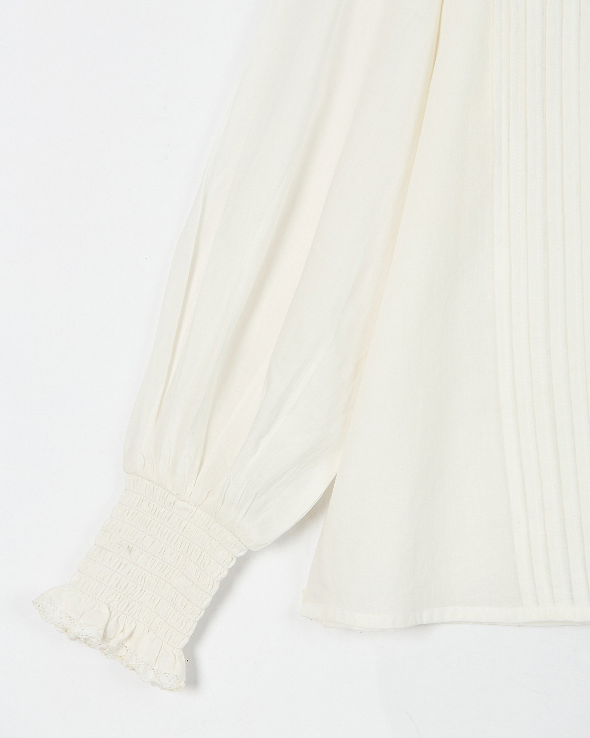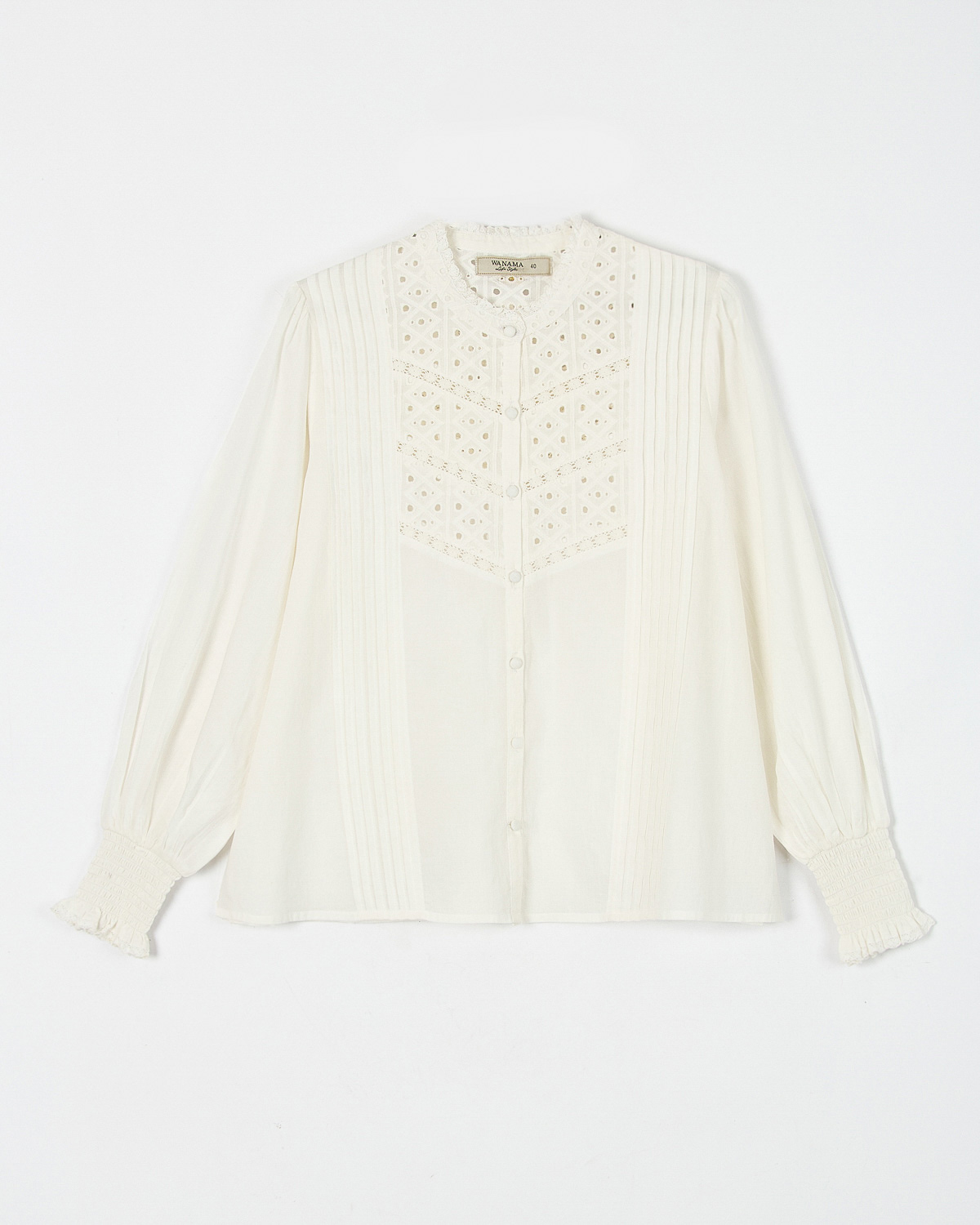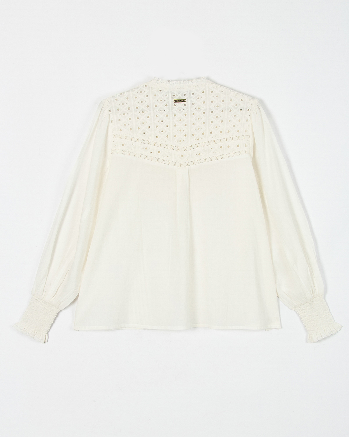 CAMISA CONFECCIONADA EN VOILE DE ALGODON EN COMBINACION CON GUIPUR. TIENE ALFORZAS EN EL FRENTE Y PUÑOS CON PUNTO SMOCK. ACCESO POR CARTERA CON BOTONES DE NACAR.
