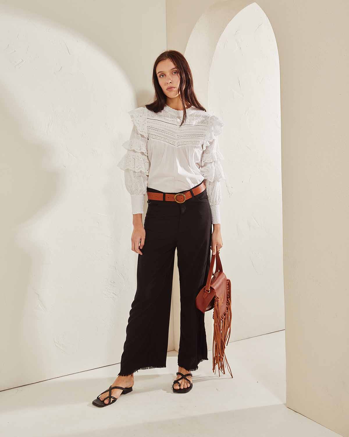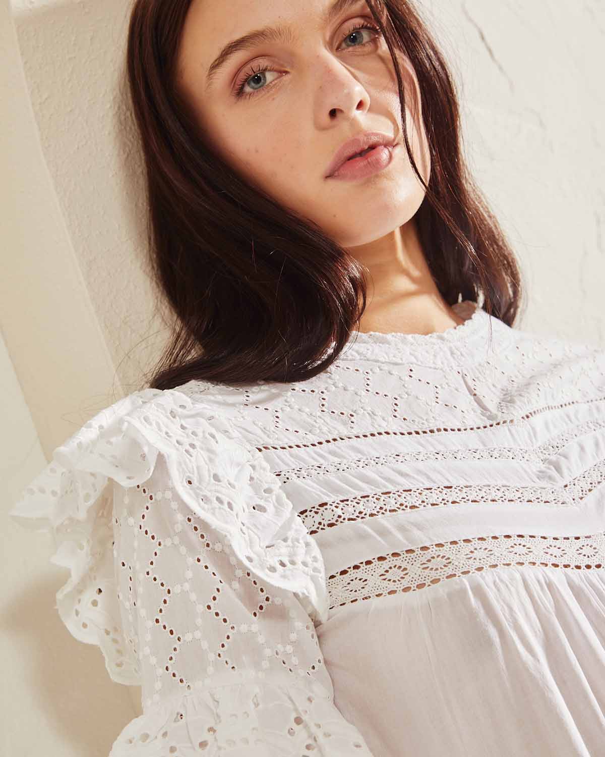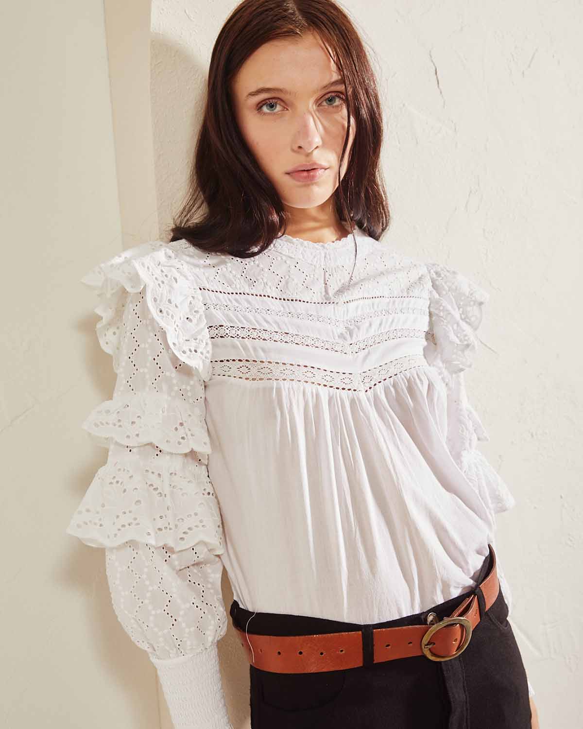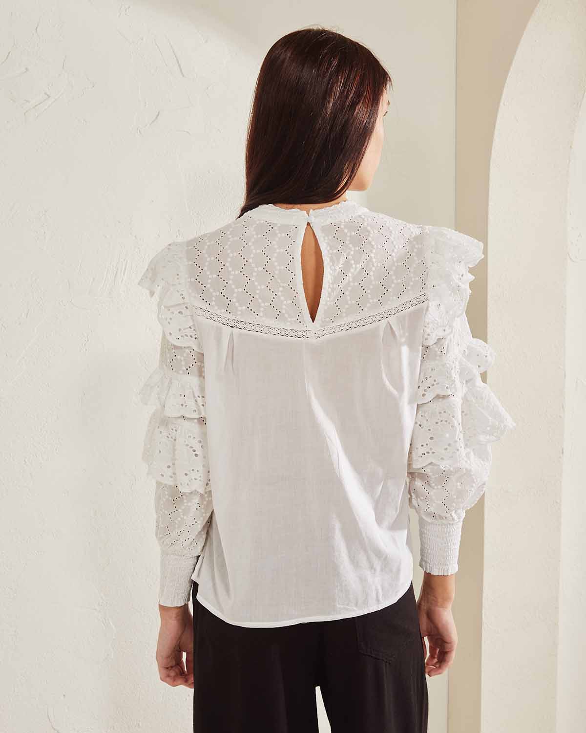 CAMISA CONFECCIONADA EN VOILE DE ALGODON CON DETALLE DE PUNTILLAS EN EL FRENTE Y VOLADOS EN LAS MANGAS. TIENE PUÑOS CON PUNTO SMOCK. ACCESO POR GOTA EN ESPALDA.