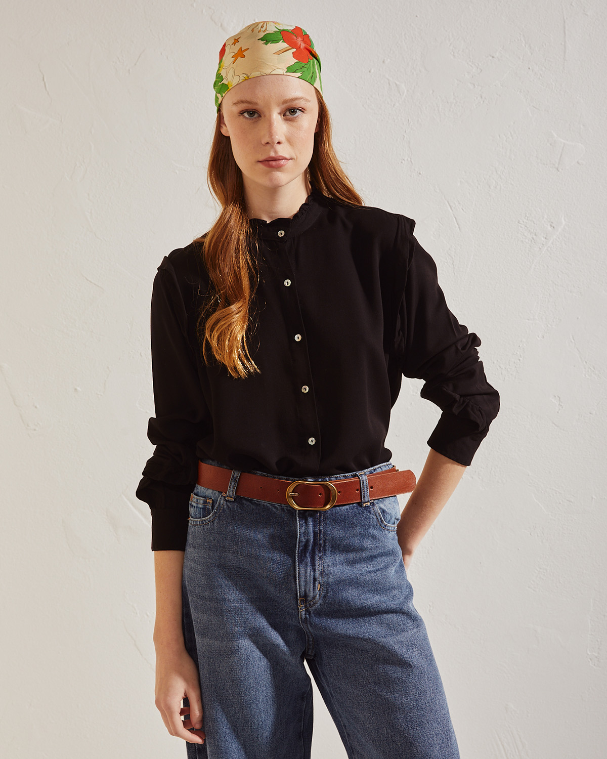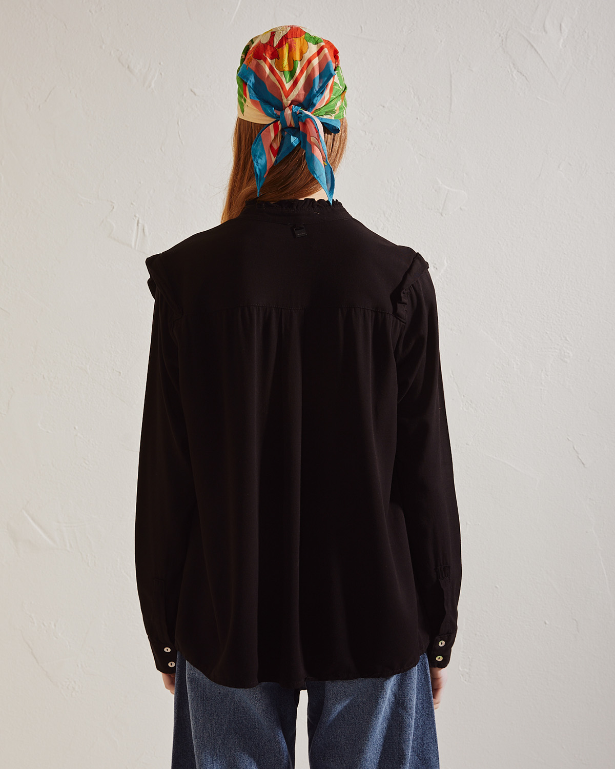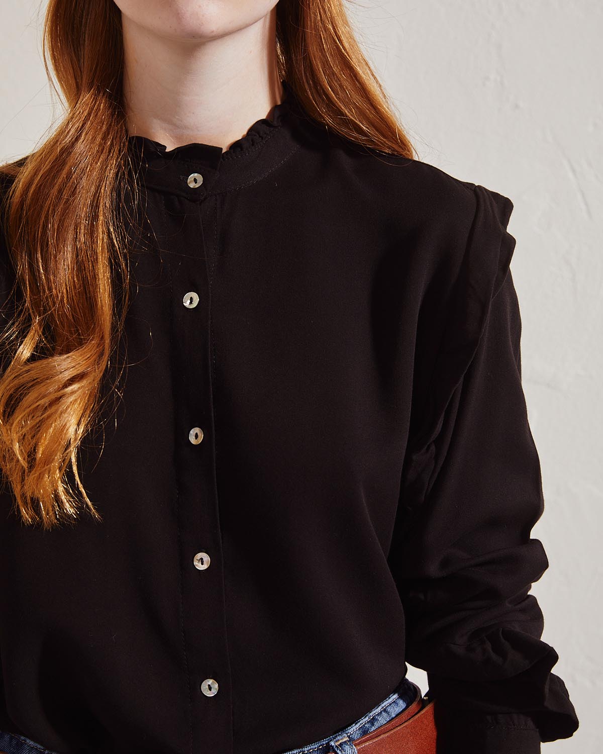 CAMISA CONFECCIONADA EN RAYON LISO. CALCE REGULAR. VOLADO EN ESCOTE Y MANGAS. ACCESO POR CARTERA EN EL DELANTERO CON BOTONES NACARADOS.