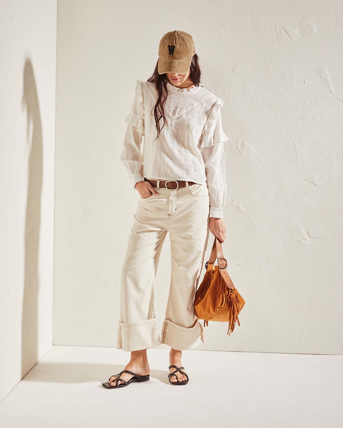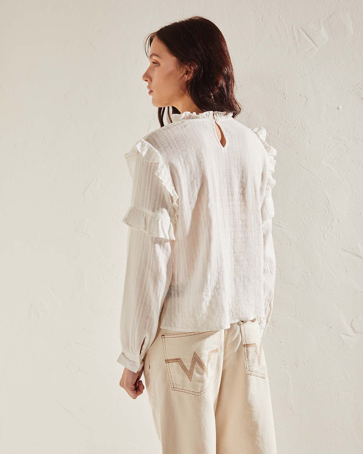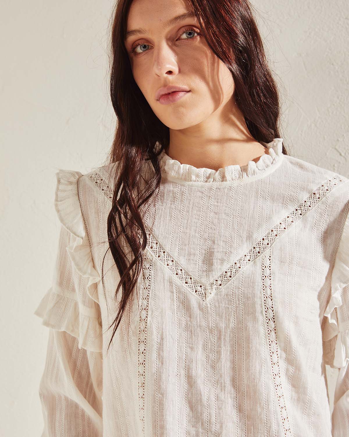 CAMISOLA CONFECCIONADA EN VOILE DE ALGODON, CON VOLADITOS EN SISA Y MANGAS. DETALLE DE ENTREDOS EN FORMA DE V EN EL FRENTE. CALCE REGULAR.