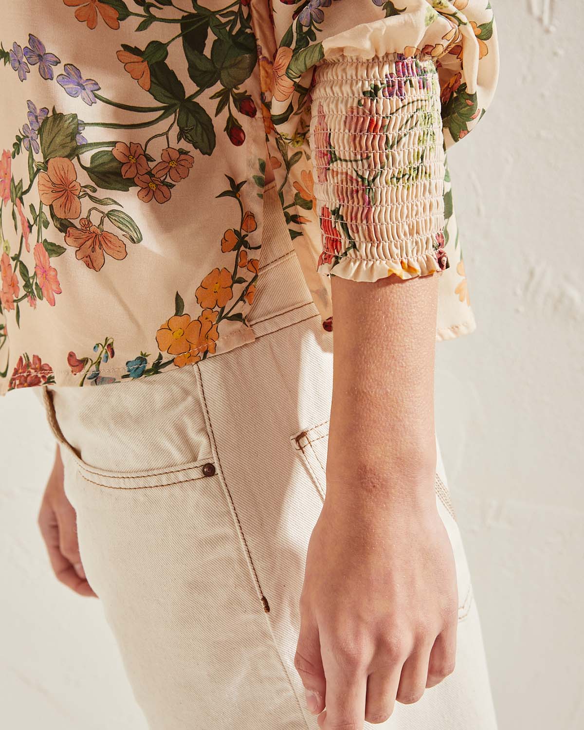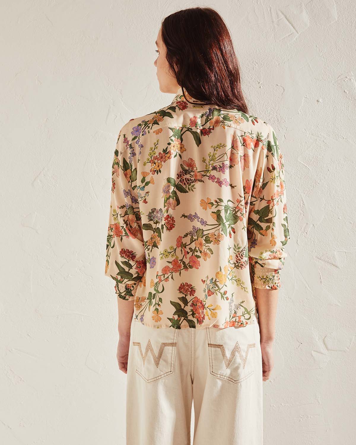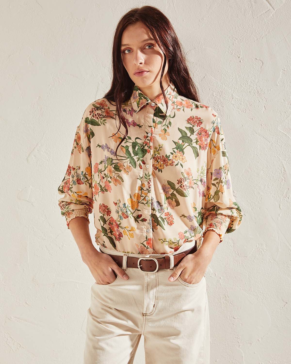 CAMISA CONFECCIONADA EN VISCOSA ESTAMPADA. CARTERA EN EL DELANTERO CON BOTONES NACARADOS. PUÑOS ELASTIZADOS.