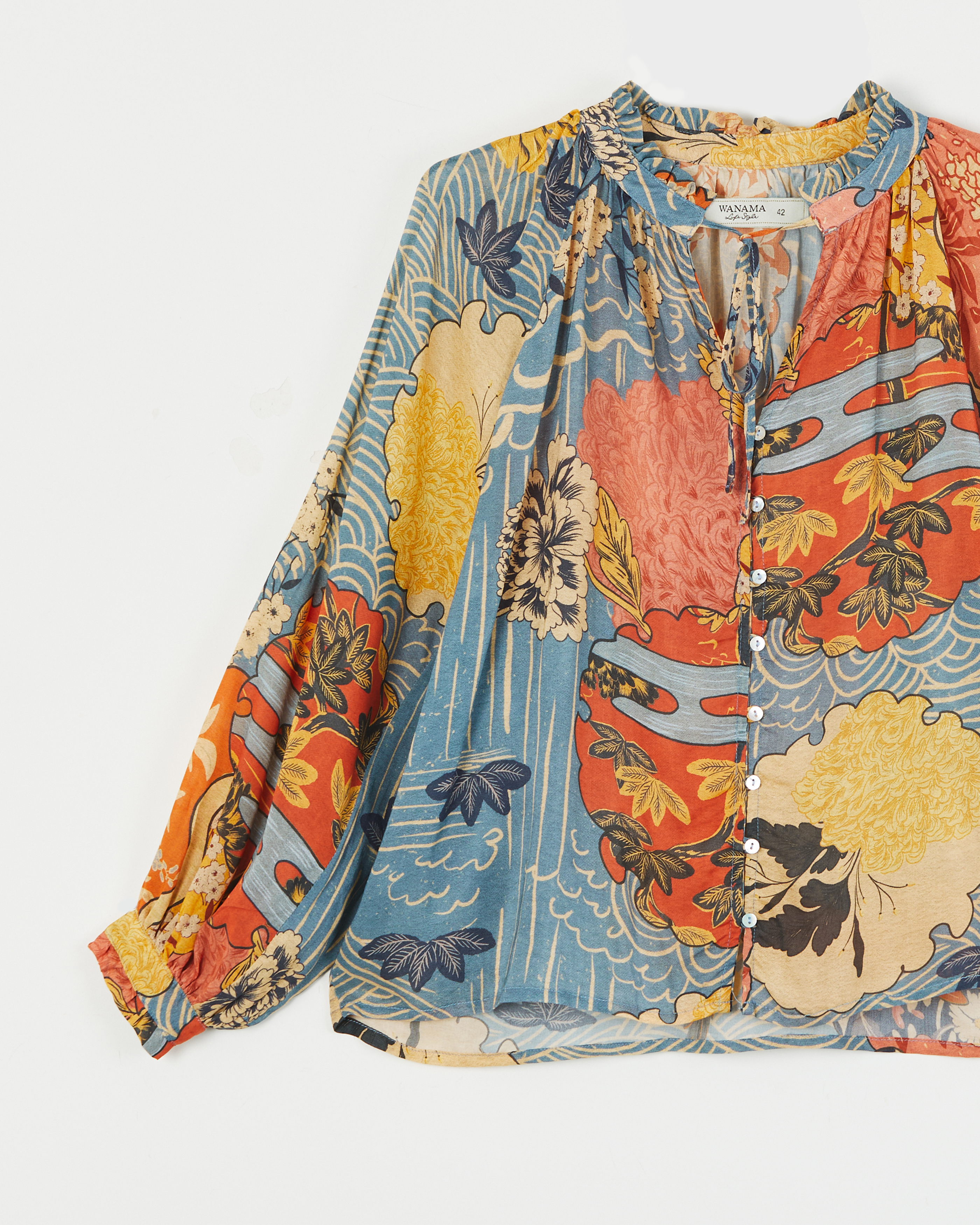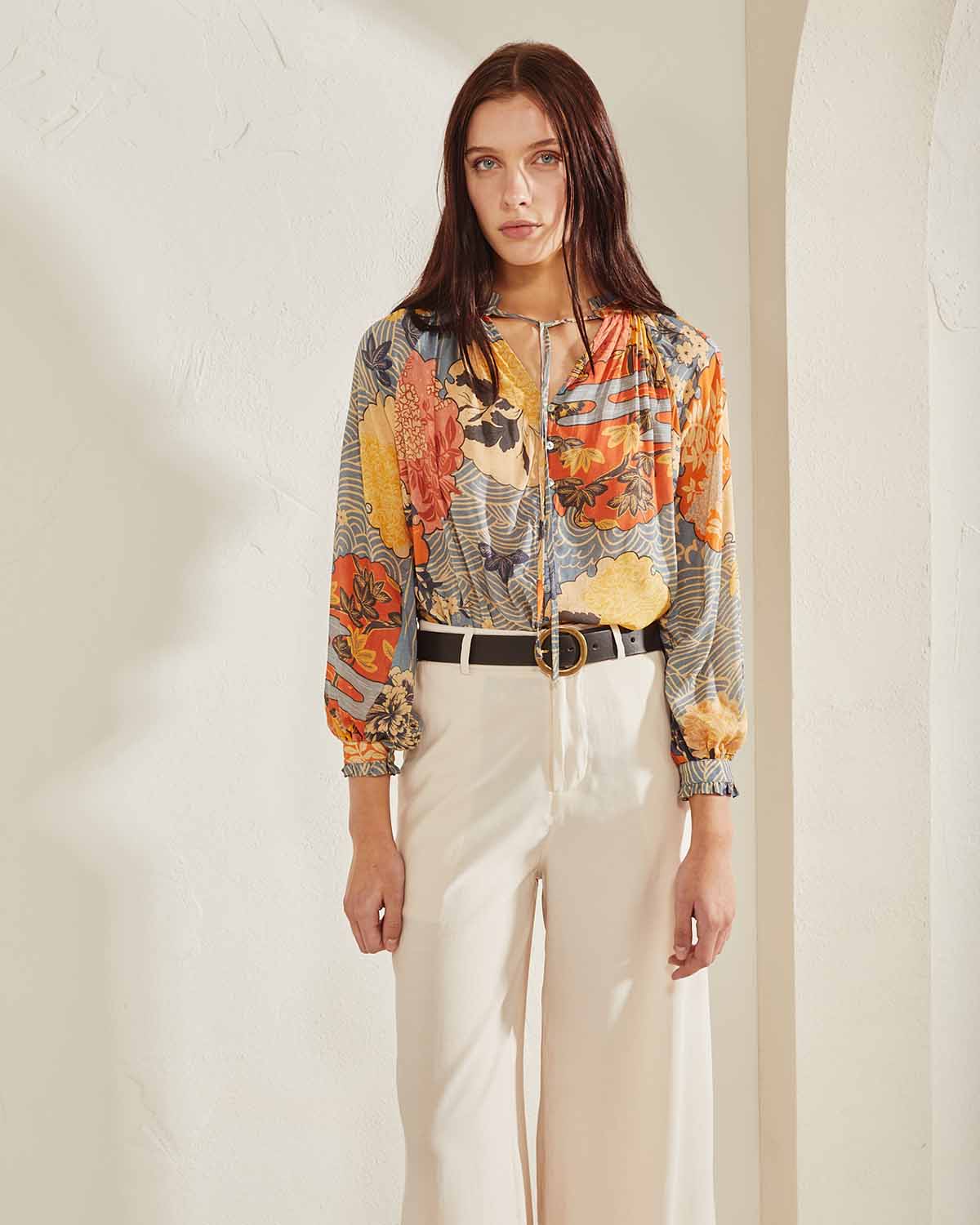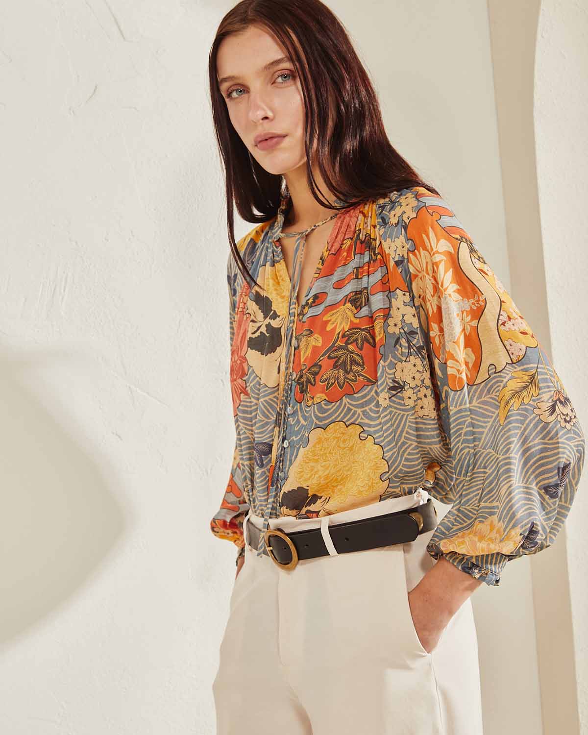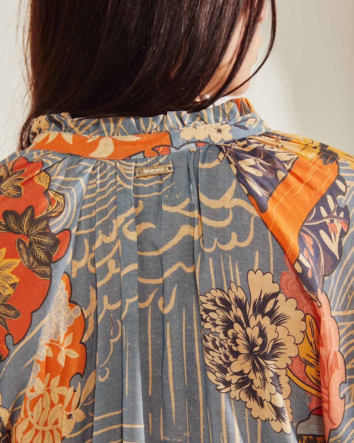 CAMISA DE CALCE HOLGADO CONFECCIONADA EN VISCOSA ESTAMPADA. MANGAS RANGLAN. BOTONES NACARADOS EN CARTERA. Y LAZO PARA ATAR EN CUELLO.