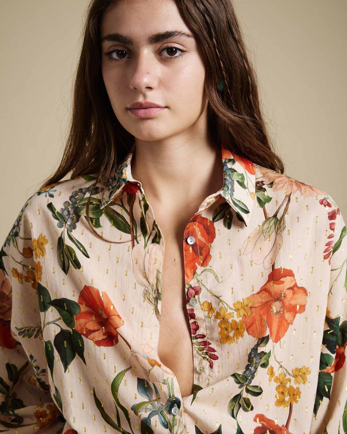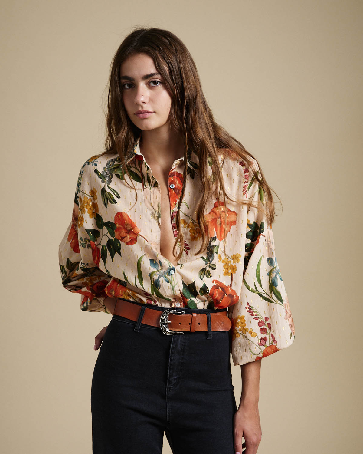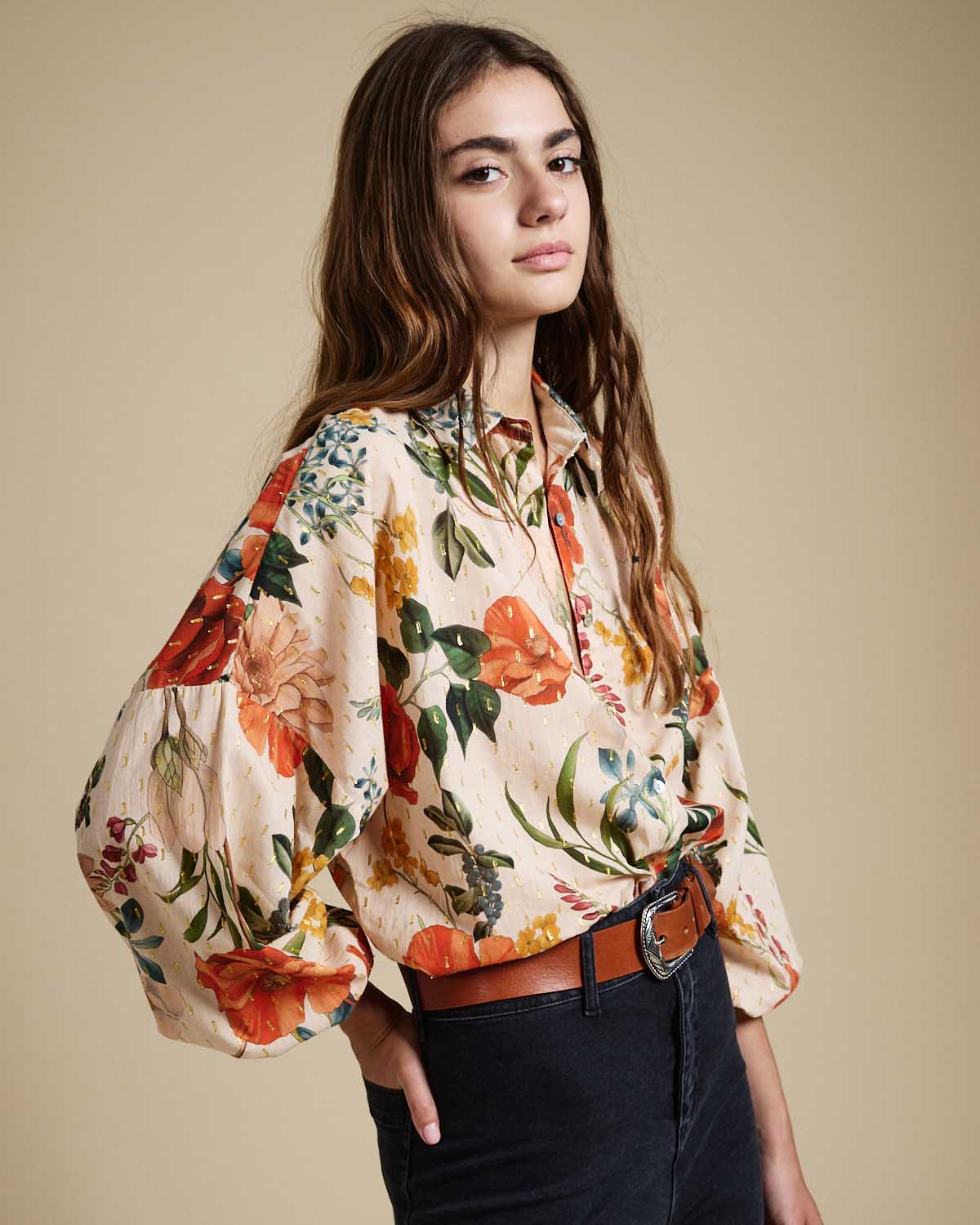 CAMISA DE CORTE AMPLIO Y MANGAS BALLOON CONFECCIONADA EN ALGODON ESTAMPADO. PUÑOS CON ELÁSTICO PARA ABUCHONAR Y CARTERA A LA VISTA CON BOTONES NACAR