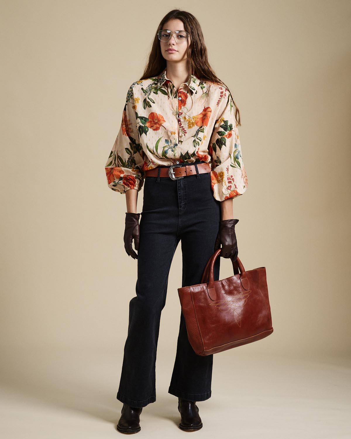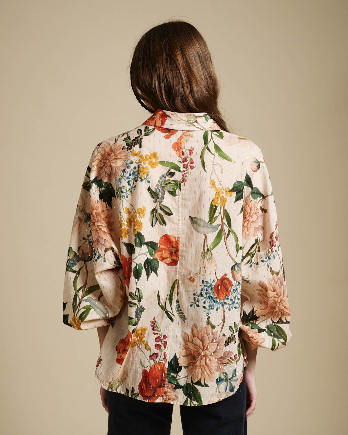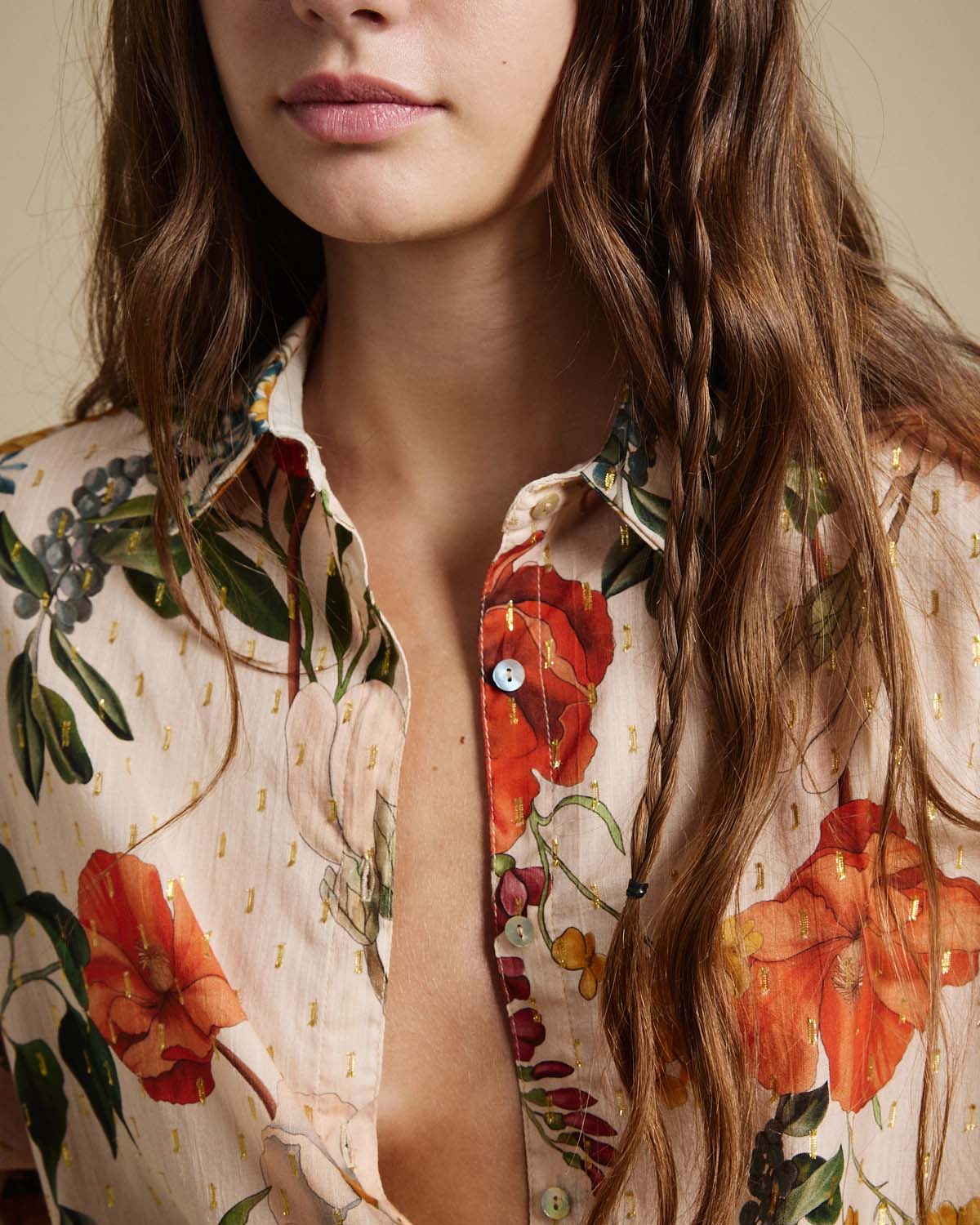 CAMISA DE CORTE AMPLIO Y MANGAS BALLOON CONFECCIONADA EN ALGODON ESTAMPADO. PUÑOS CON ELÁSTICO PARA ABUCHONAR Y CARTERA A LA VISTA CON BOTONES NACAR