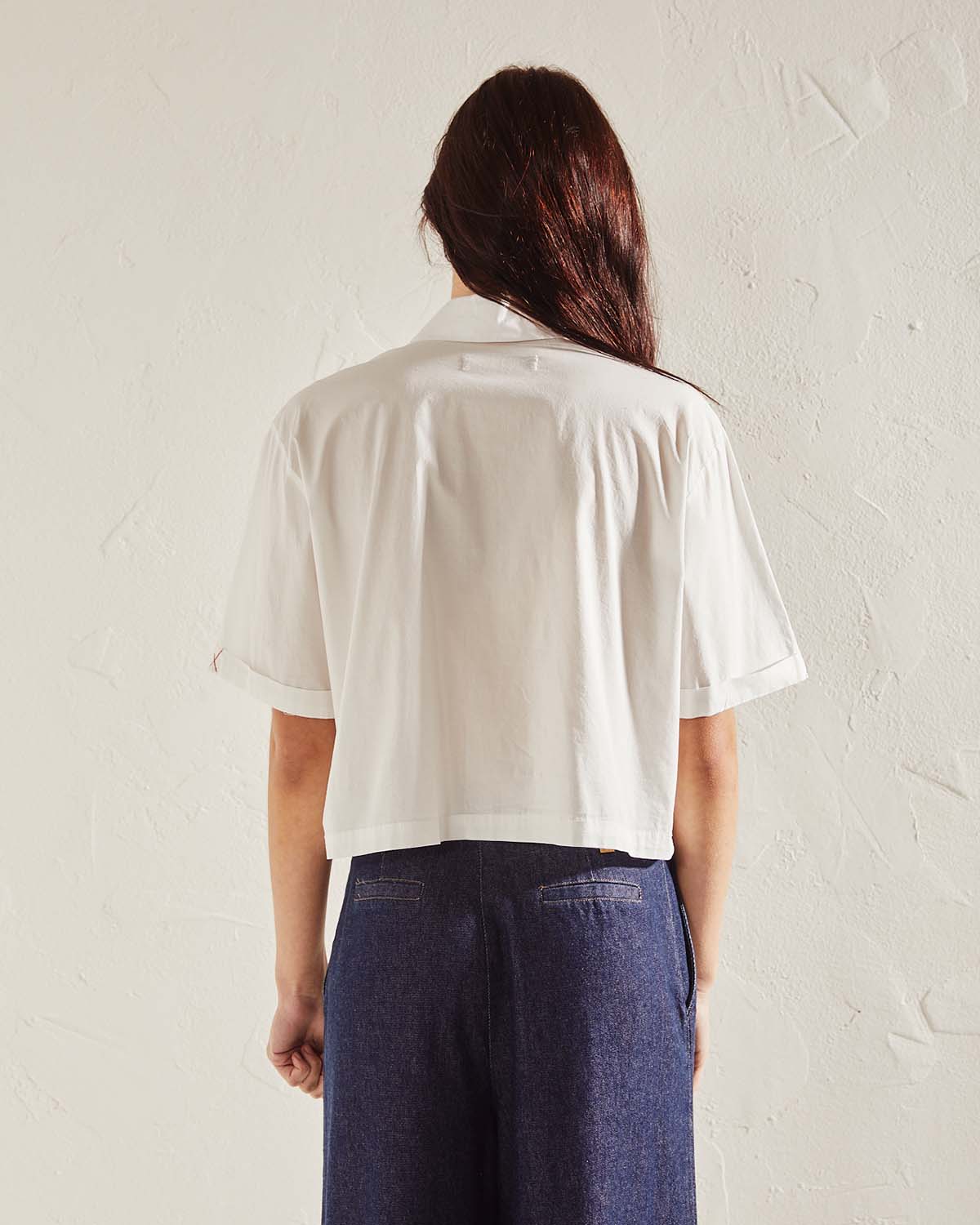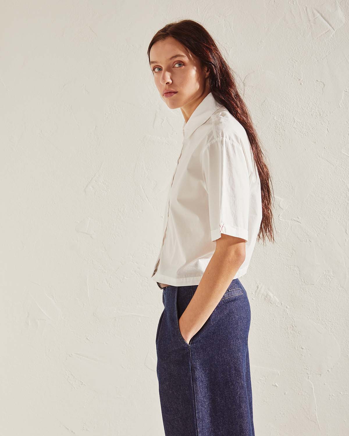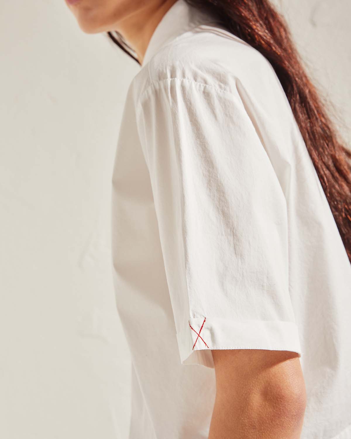 CAMISA CALCE AMPLIO CONFECCIONADA EN POPLIN LISO 100% ALGODON. CON DETALLES DE COSTURAS EN ROJO .