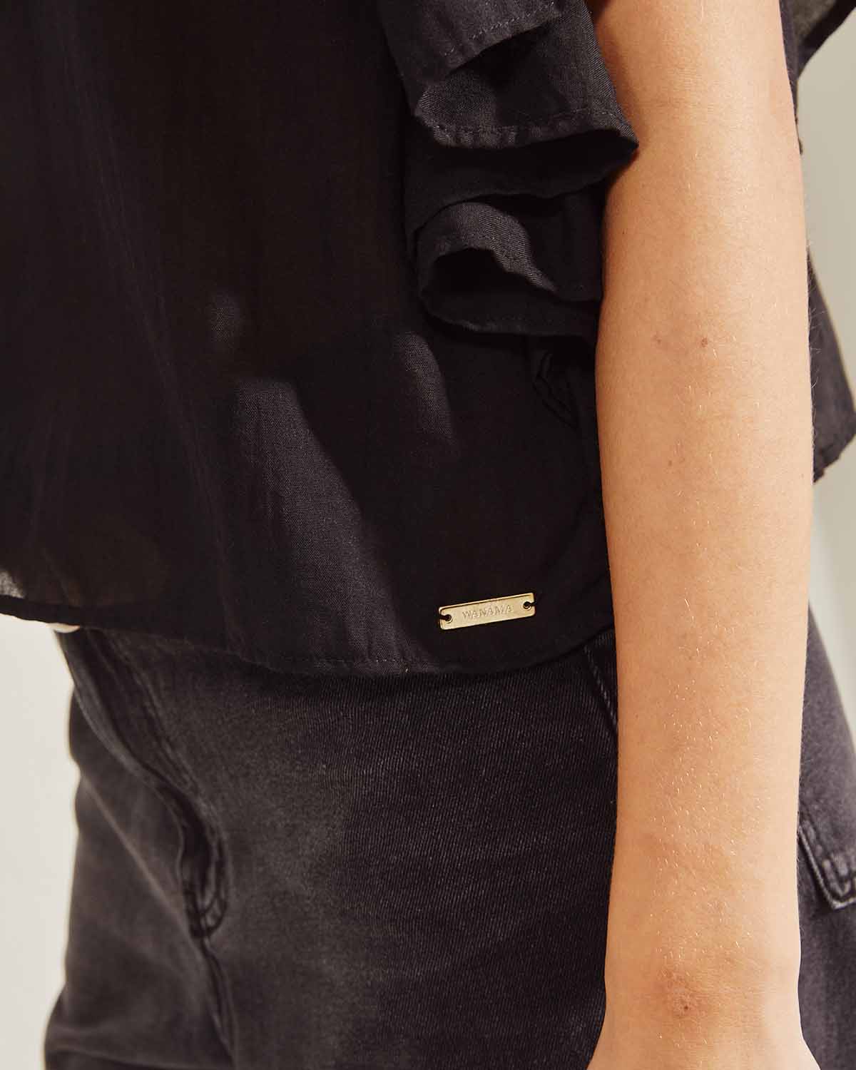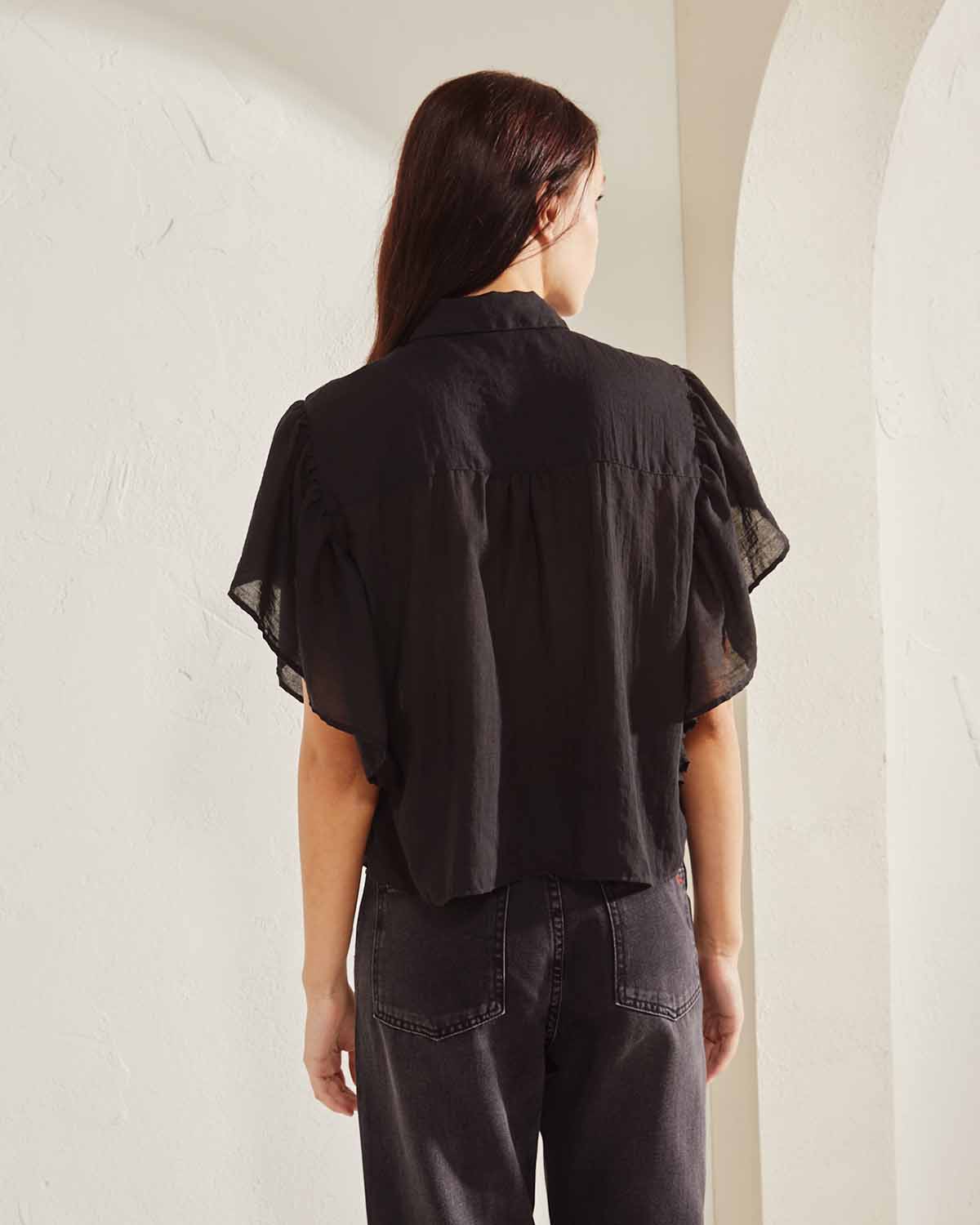 CAMISA CONFECCIONADA EN RAYON, CALCE HOLGADO Y CORTO. CON VOLADOS EN SISAS FORMANDO MANGA. PEQUEÑOS FRUNCES EN ESPALDA,