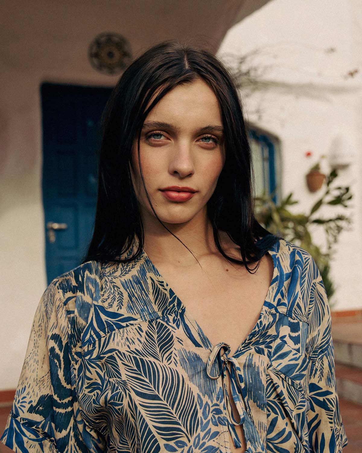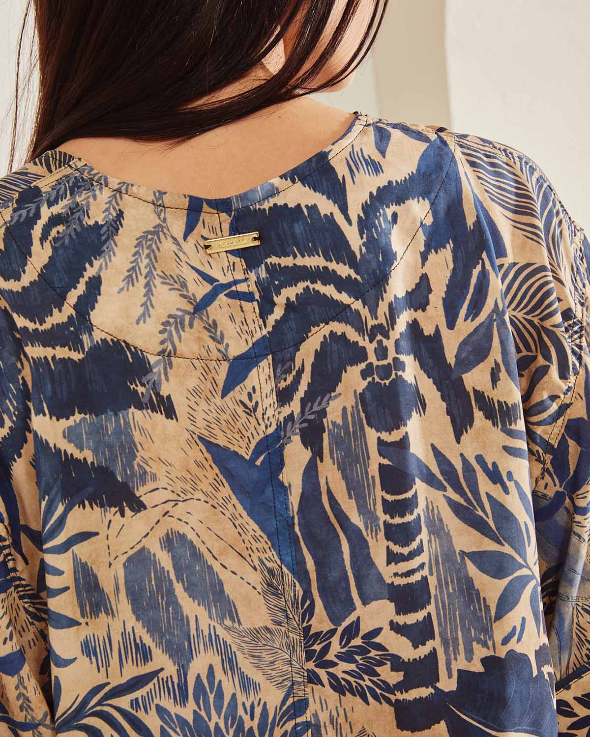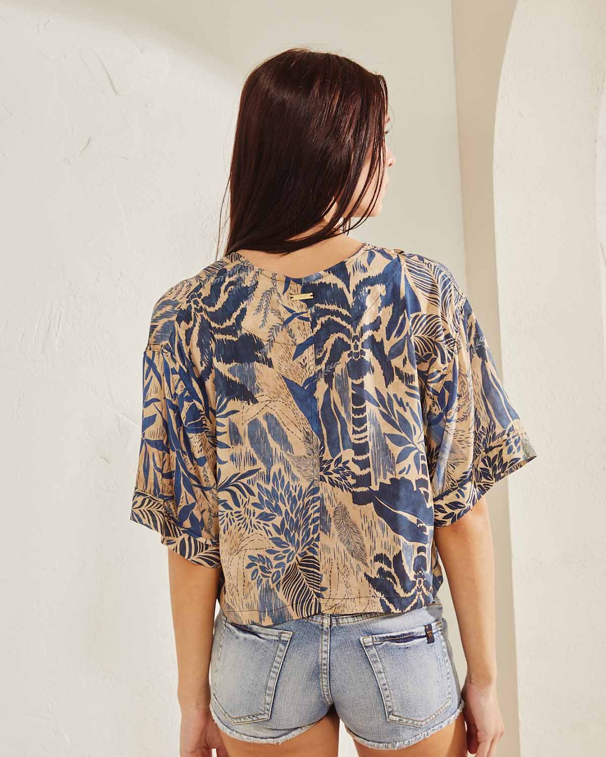 CAMISA CROP CONFECCIONADA CON VISCOSA ESTAMPADA. CANESÚ DELANTERO, BOLSILLO Y LAZOS PARA ANUDAR EN FRENTE.