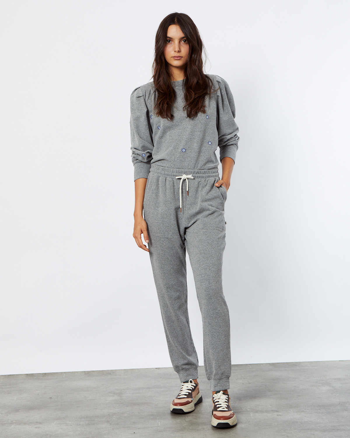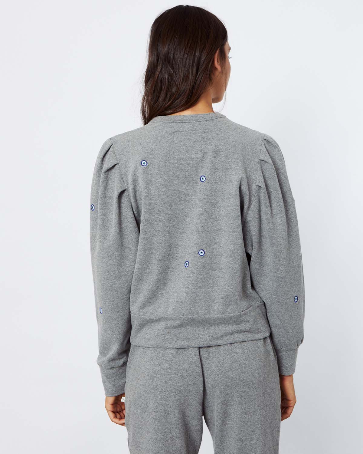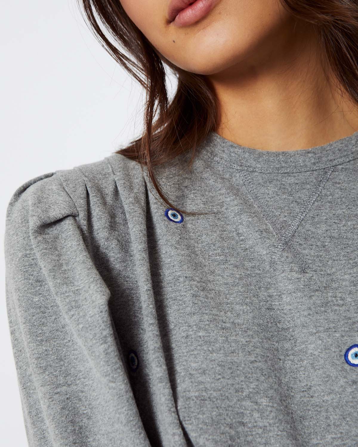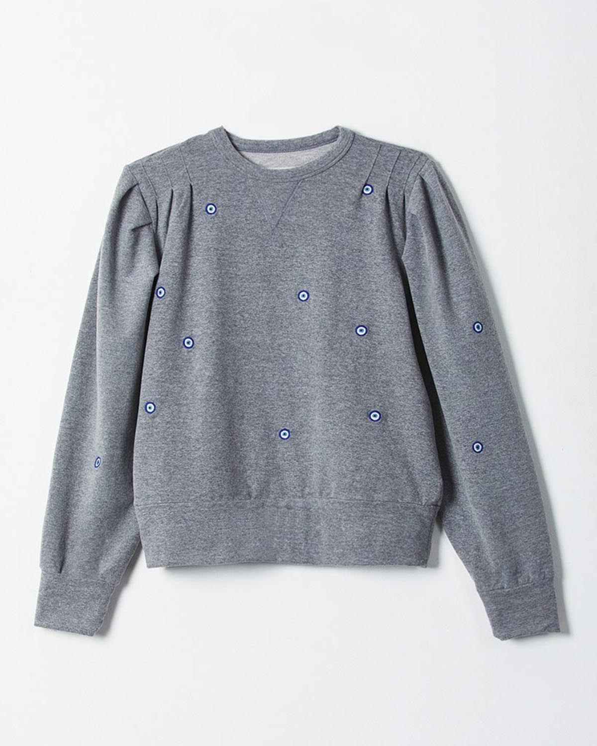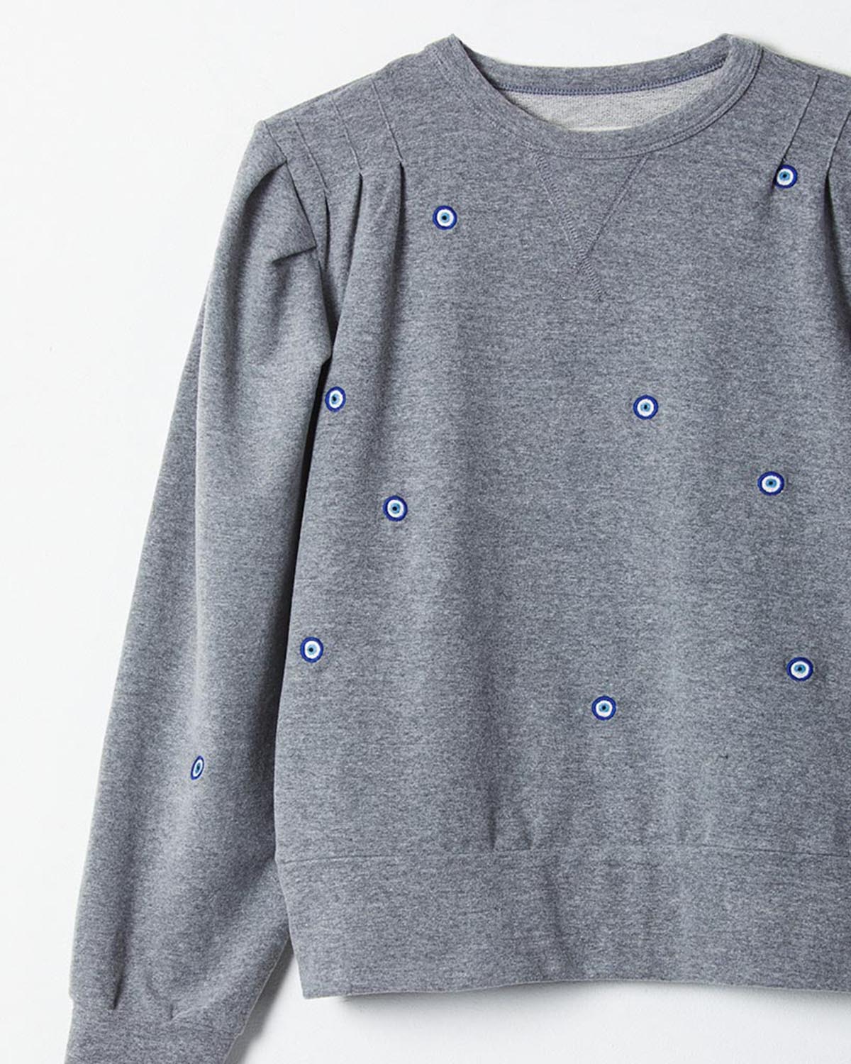 BUZO REALIZADO EN RUSTICO, CON FRUNCES EN COPA DE MANGA. POSEE BORDADO
