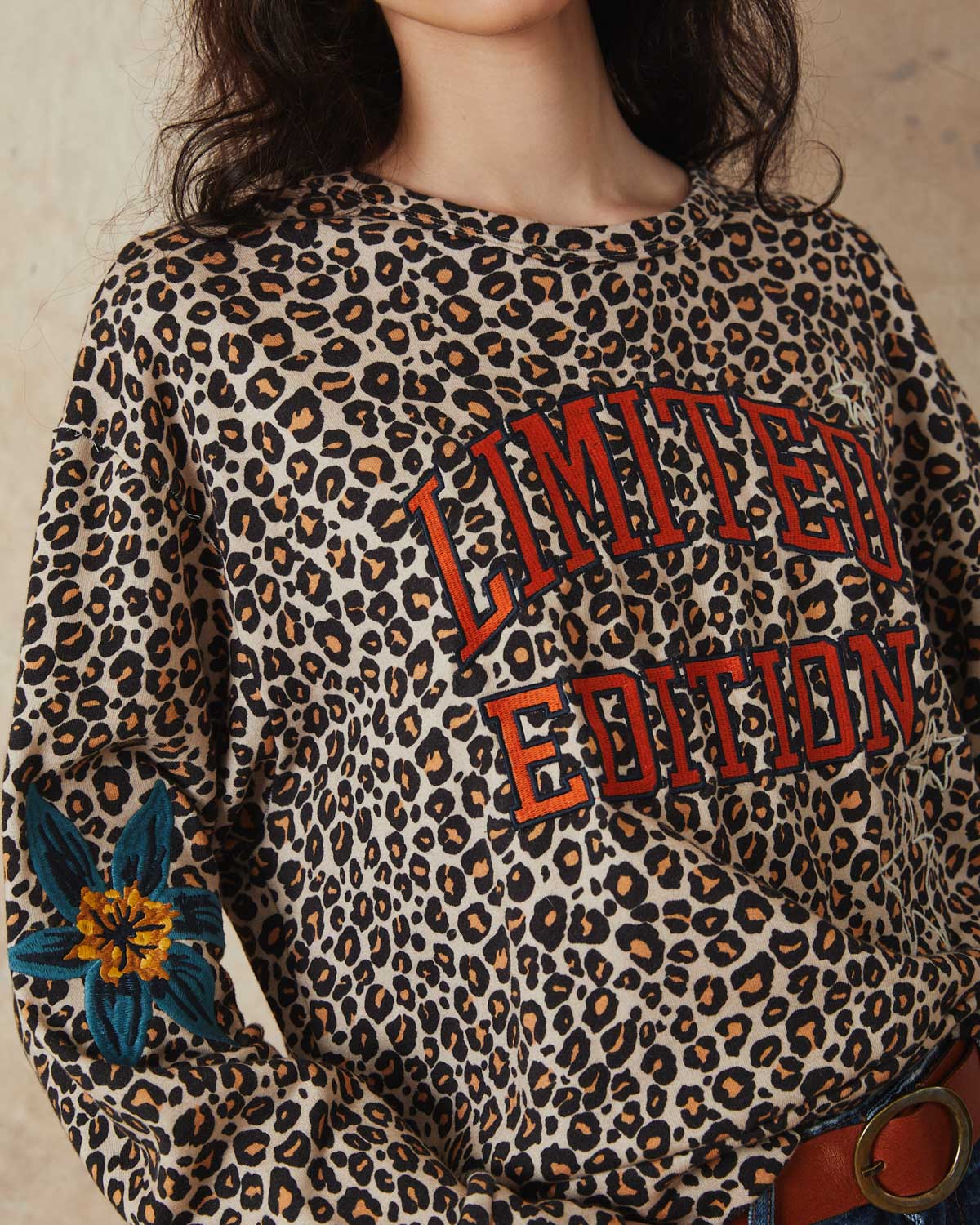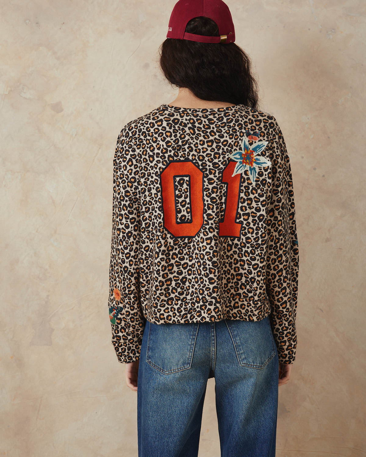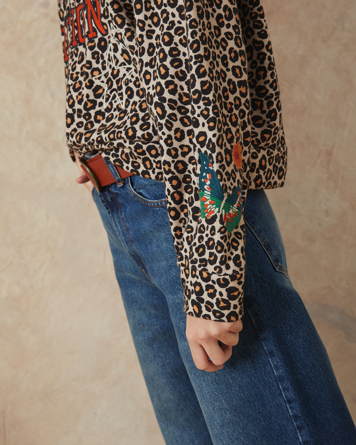 BUZO CONFECCIONADO EN RUSTICO ESTAMPADO ANIMAL PRINT CON FRUNCES EN LOS HOMBROS. CALCE HOLGADO