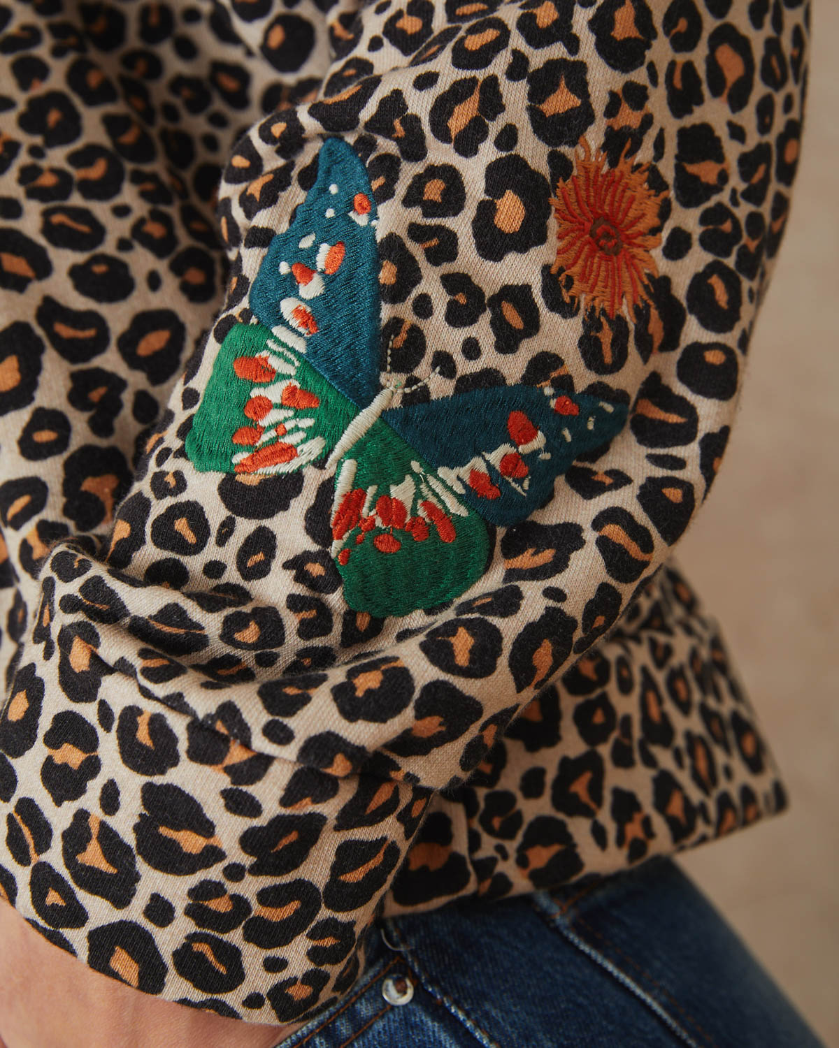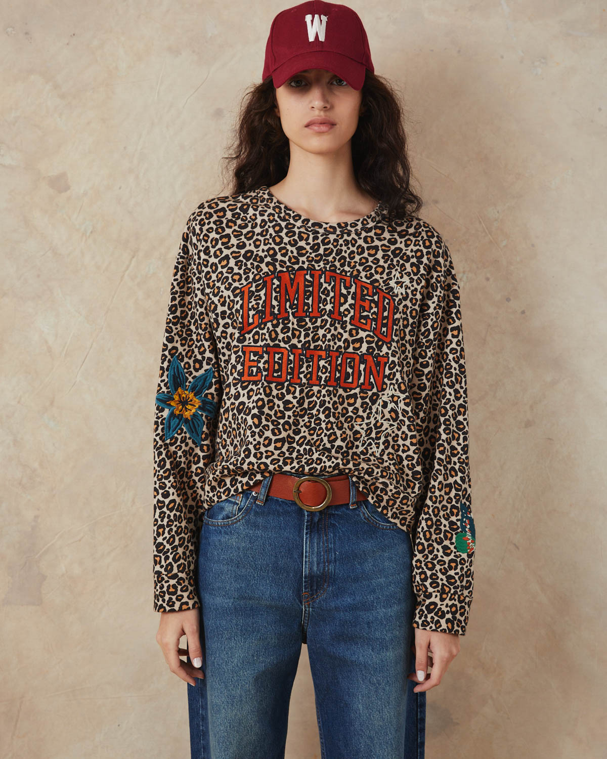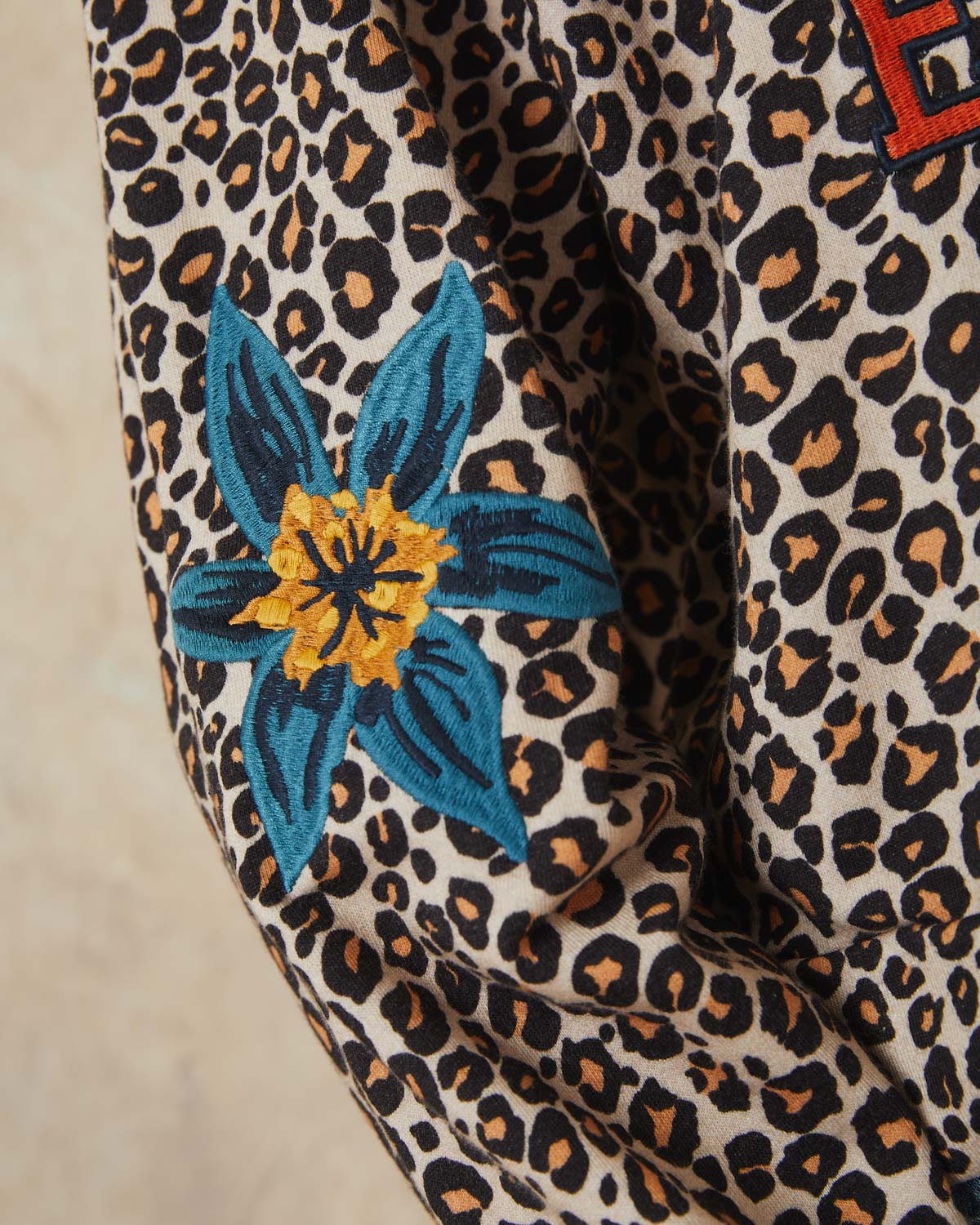 BUZO CONFECCIONADO EN RUSTICO ESTAMPADO ANIMAL PRINT CON FRUNCES EN LOS HOMBROS. CALCE HOLGADO
