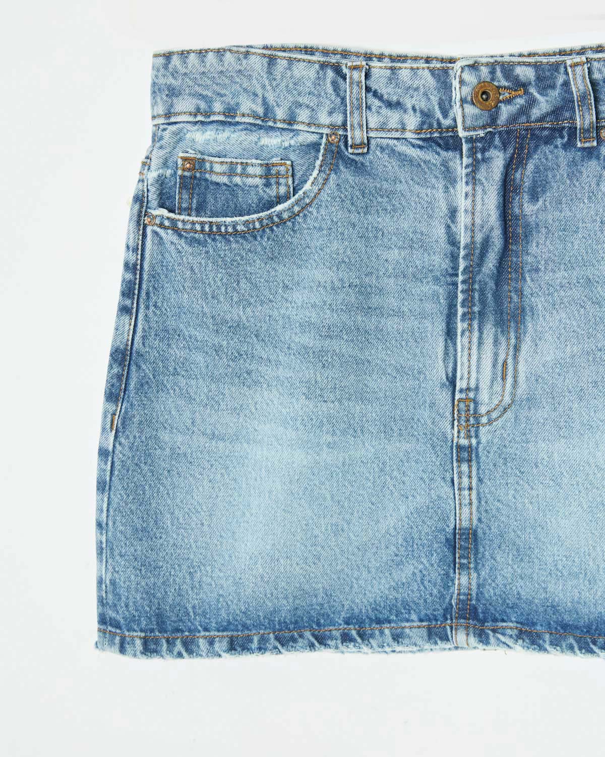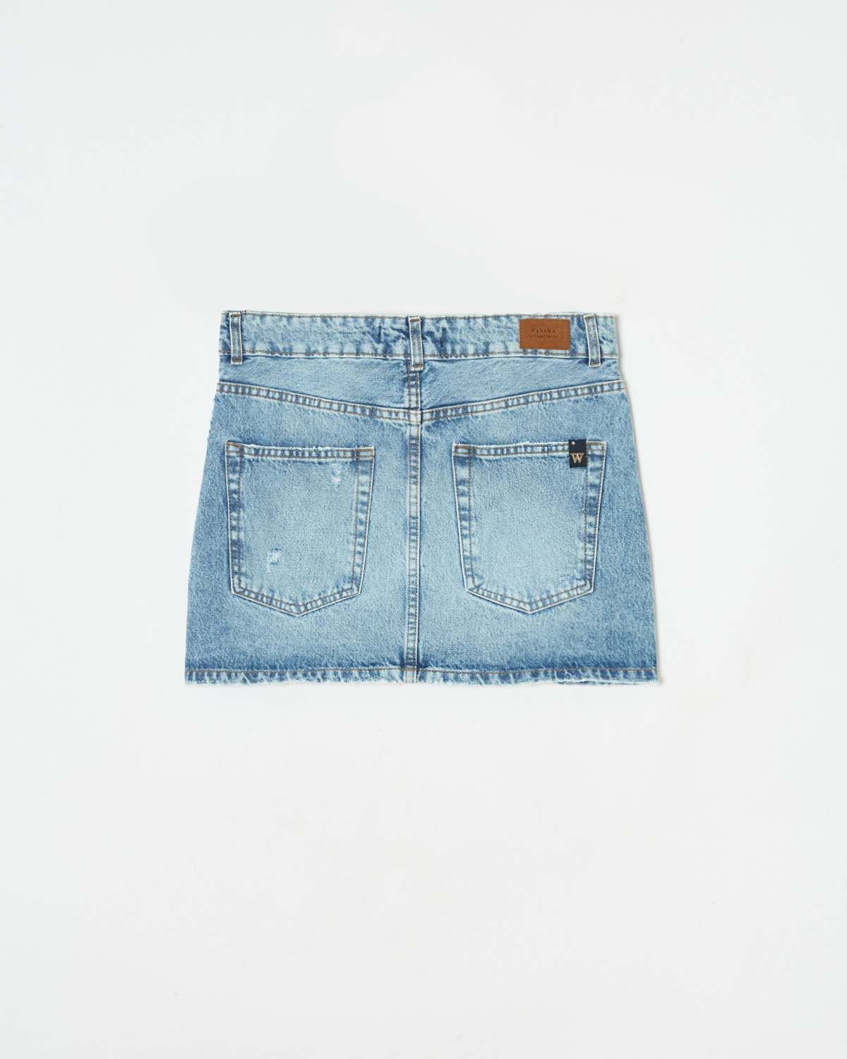 POLLERA MINI DE JEAN CON LOOK USED MID LIGHT BLUE Y DESGASTADOS EN RUEDO Y DELANTERO.