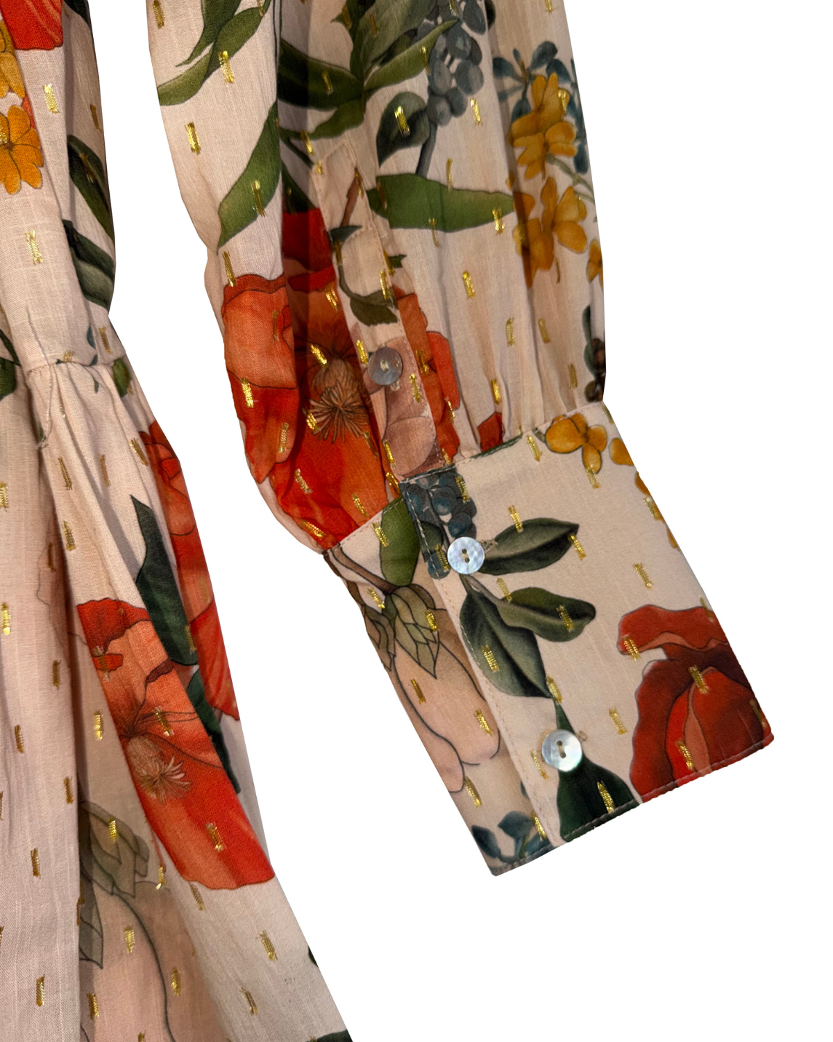 RUE CONFECCIONADA EN TEXTIL LIVIANO DE ALGODÓN CON DETALLES EN HILO METÁLICO, VOLADO AMPLIO Y CINTA PARA AJUSTAR EN LA CINTURA.