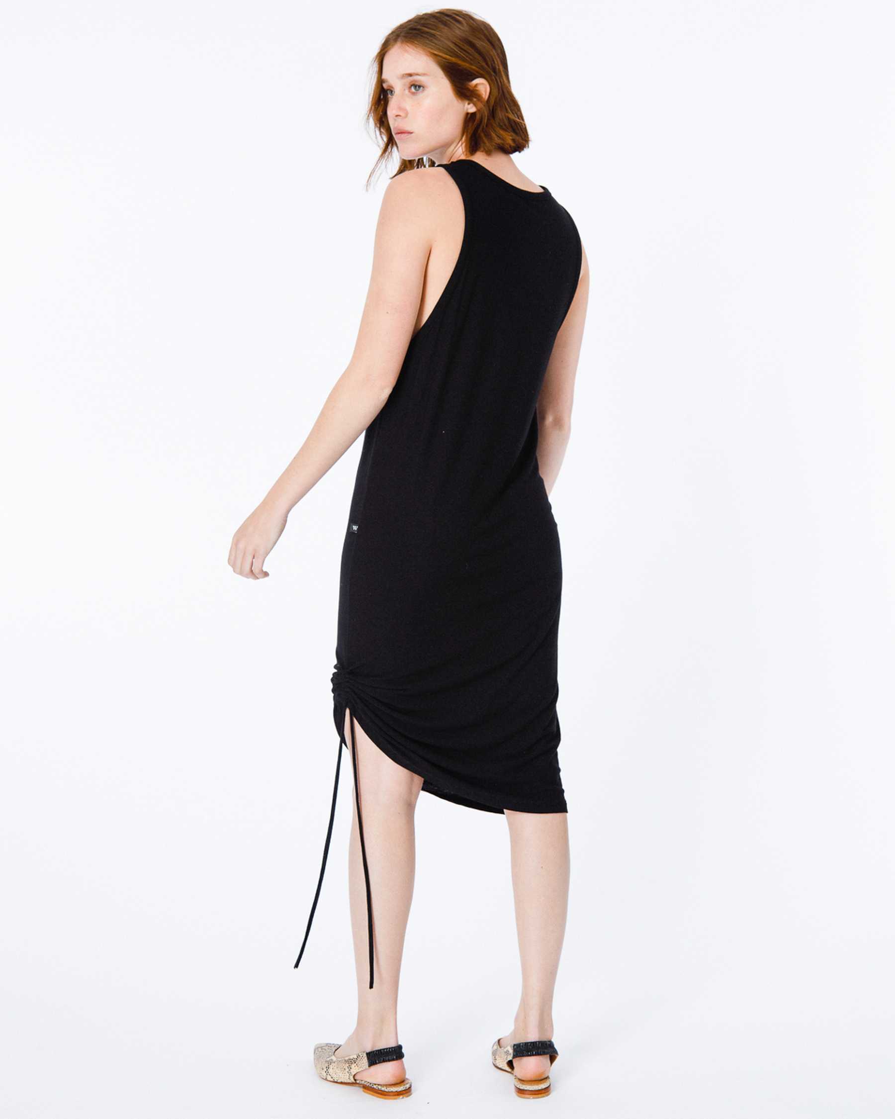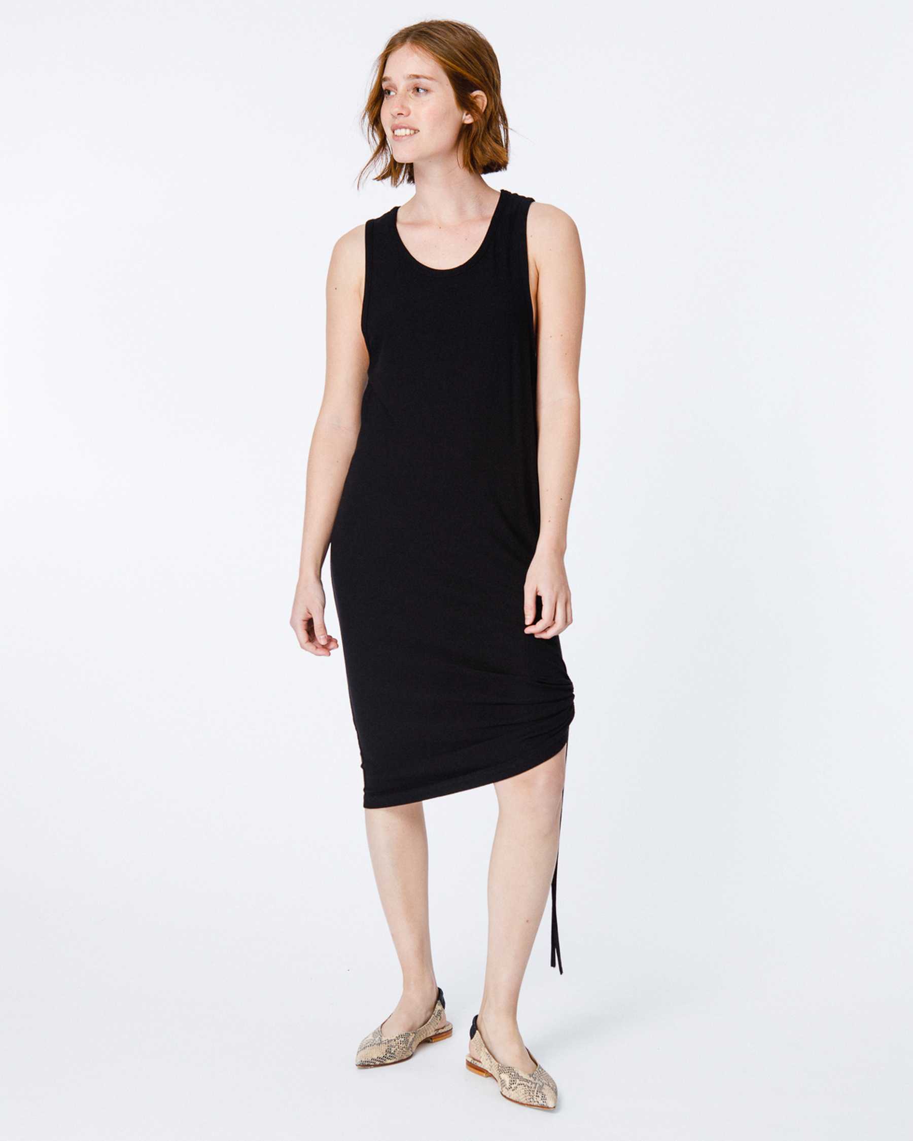 VESTIDO MIDDI CON ESCOTE REDONDO, SISAS CAVADAS Y SILUETA RECTA CON JARETA AJUSTABLE CON TIRAS EN LATERAL