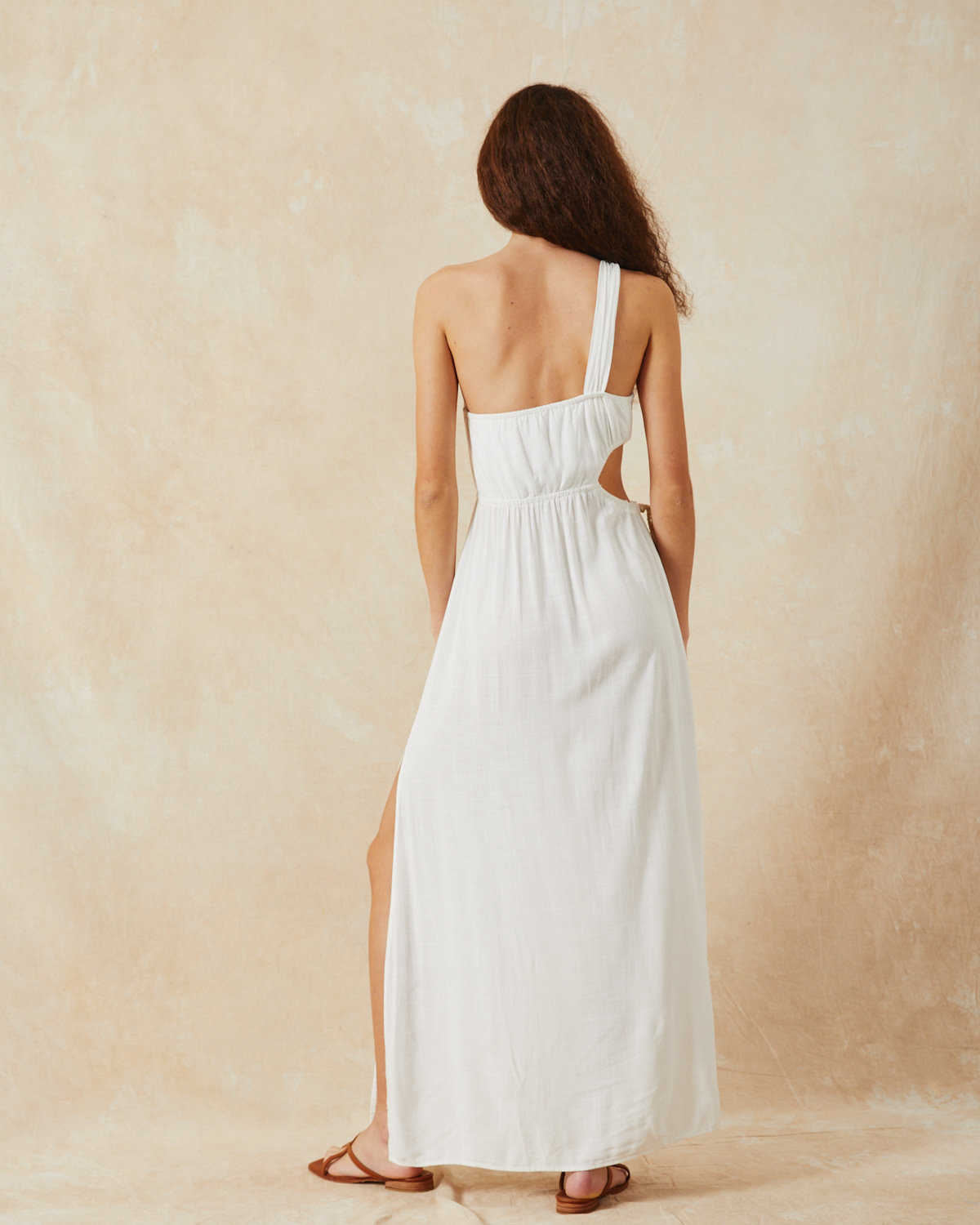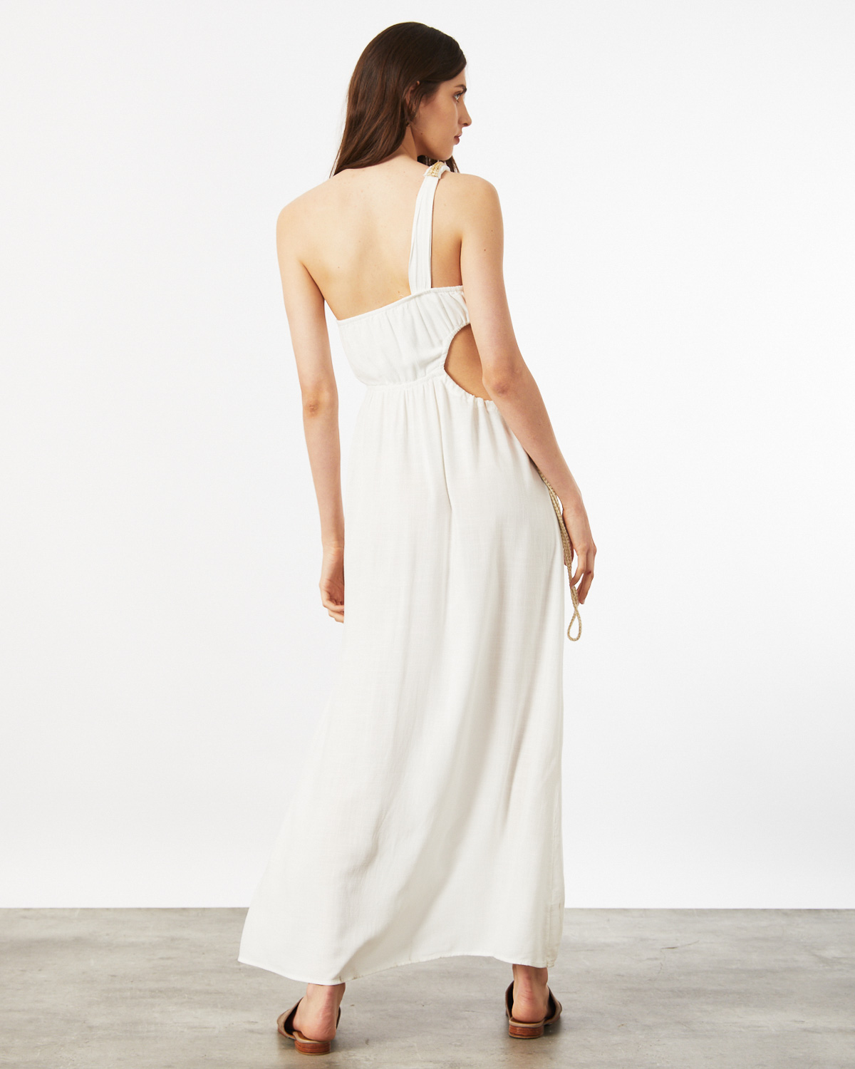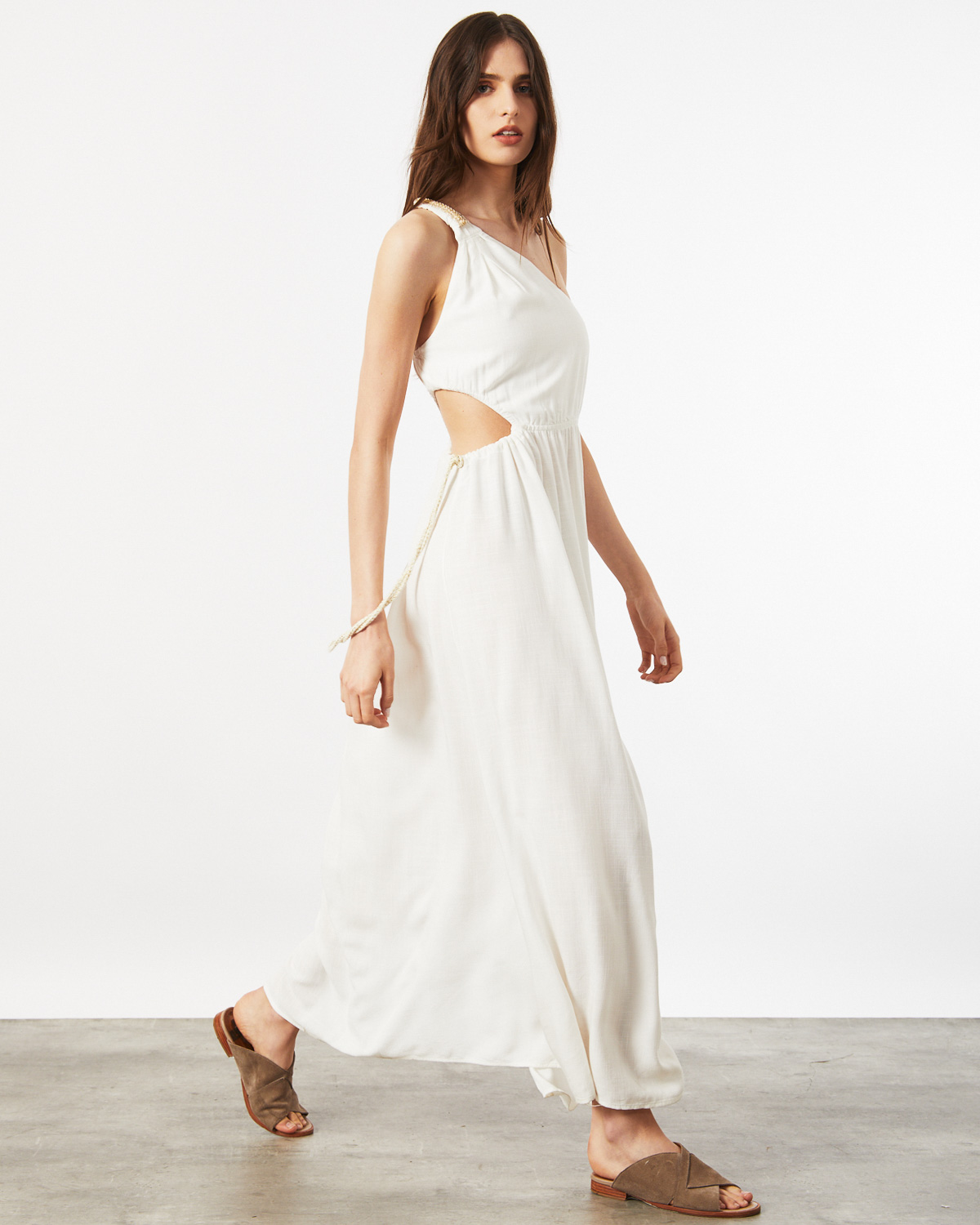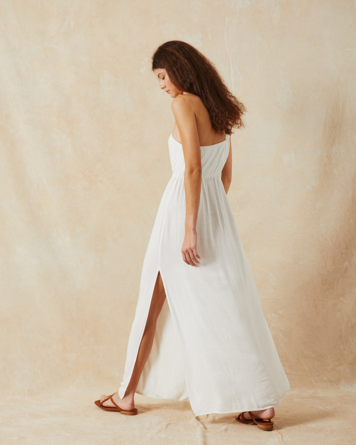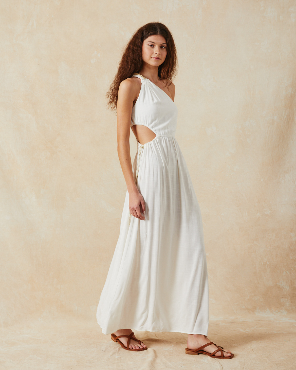 VESTIDO LARGO, ASIMÉTRICO, CONFECCIONADO EN RAYON, CON BRETEL TIPO LAZO, CALADO EN CINTURA CON CORDON COLOR CRUDO Y DORADO PARA AJUSTAR, TAJO EN BAJO FALDA.