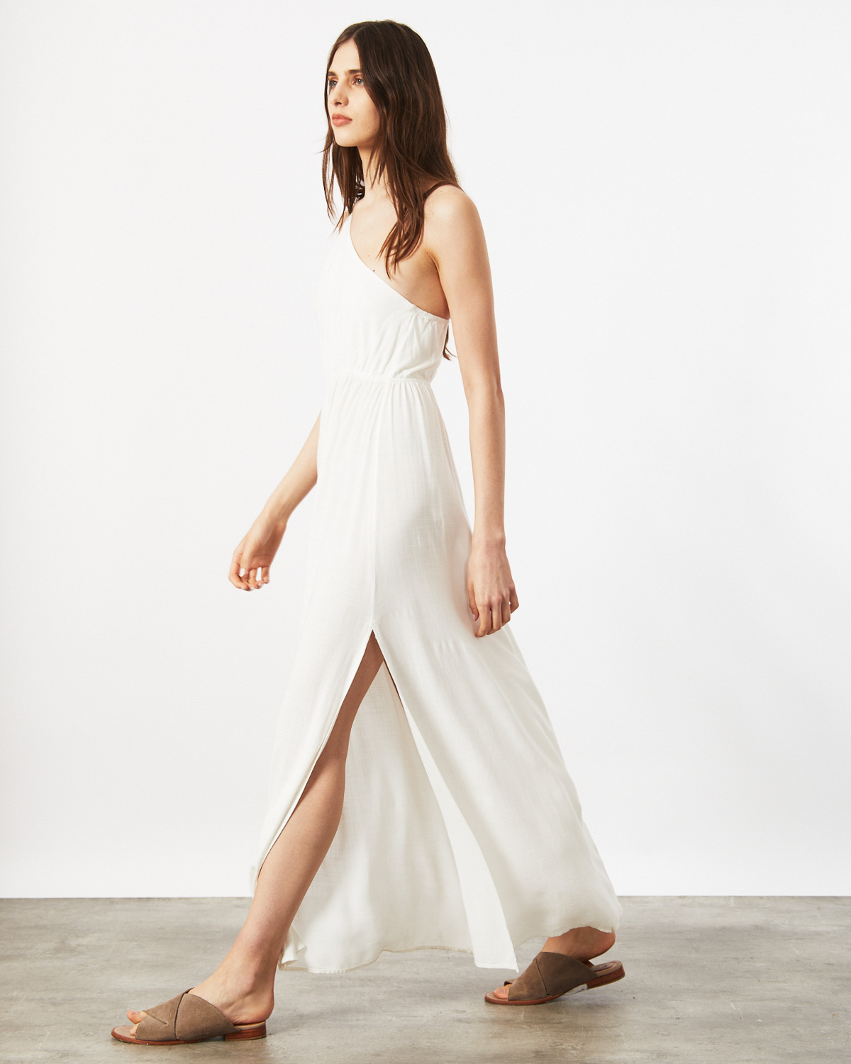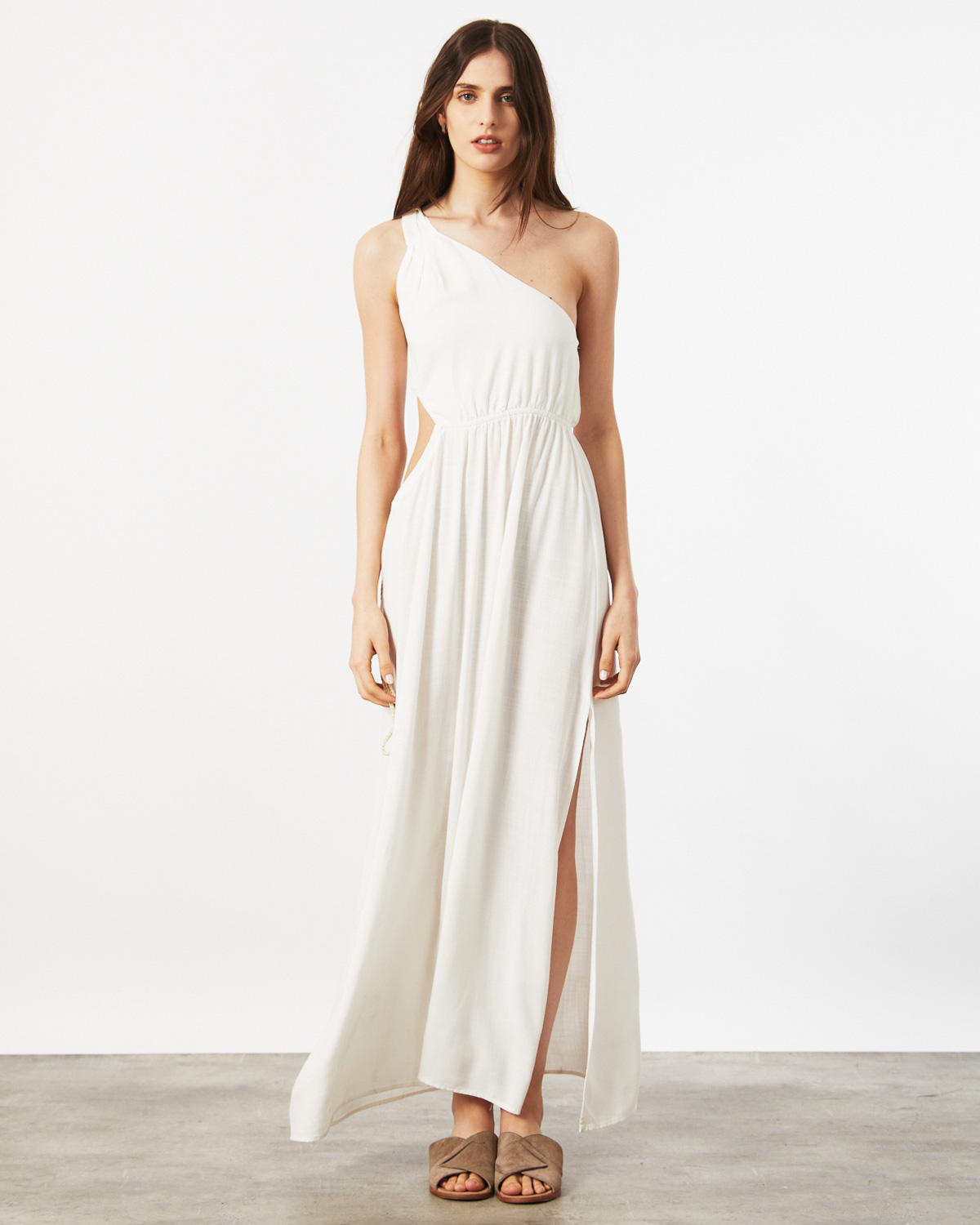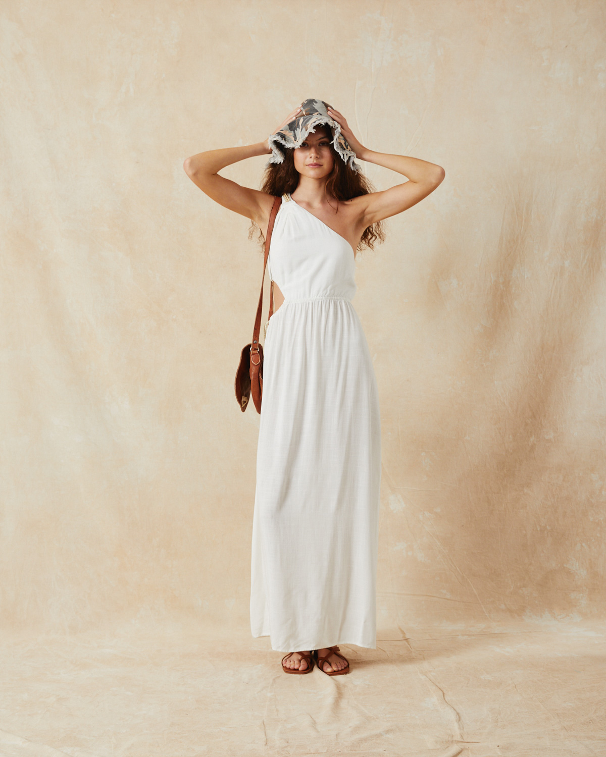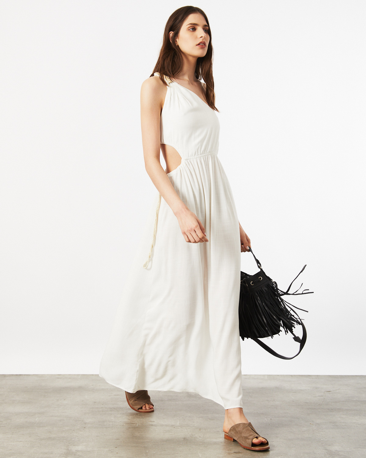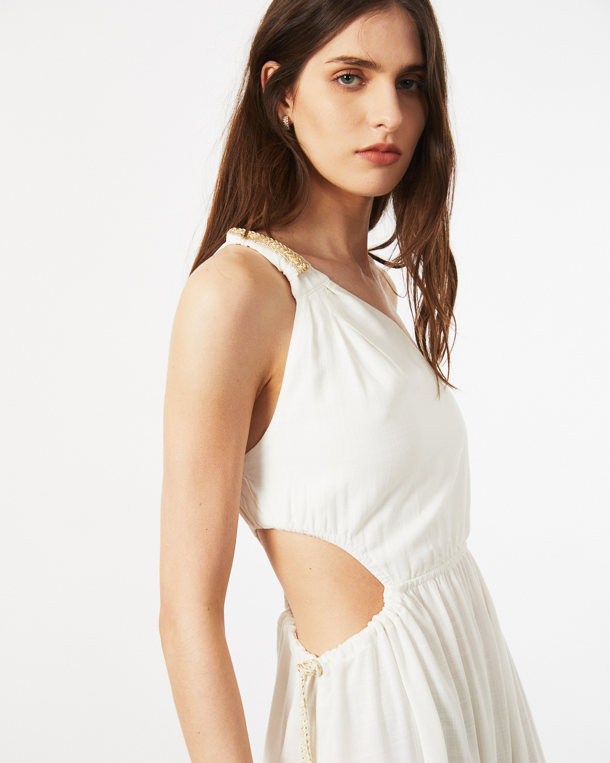 VESTIDO LARGO, ASIMÉTRICO, CONFECCIONADO EN RAYON, CON BRETEL TIPO LAZO, CALADO EN CINTURA CON CORDON COLOR CRUDO Y DORADO PARA AJUSTAR, TAJO EN BAJO FALDA.
