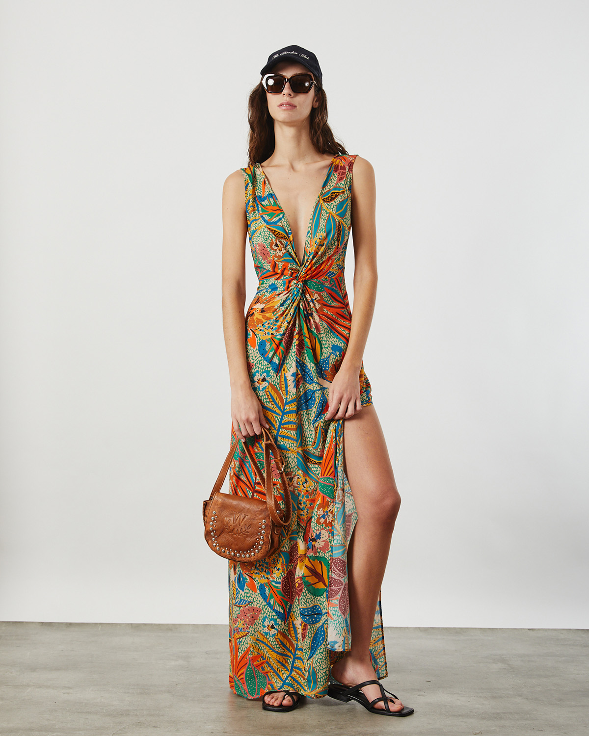 ESCOTE PRONUNCIADO CON NUDO EN EL FRENTE Y TAJO EN UNO DE SUS LATERALES. LA ESPALDA TAMBIEN TIENE ESCOTE EN V.
