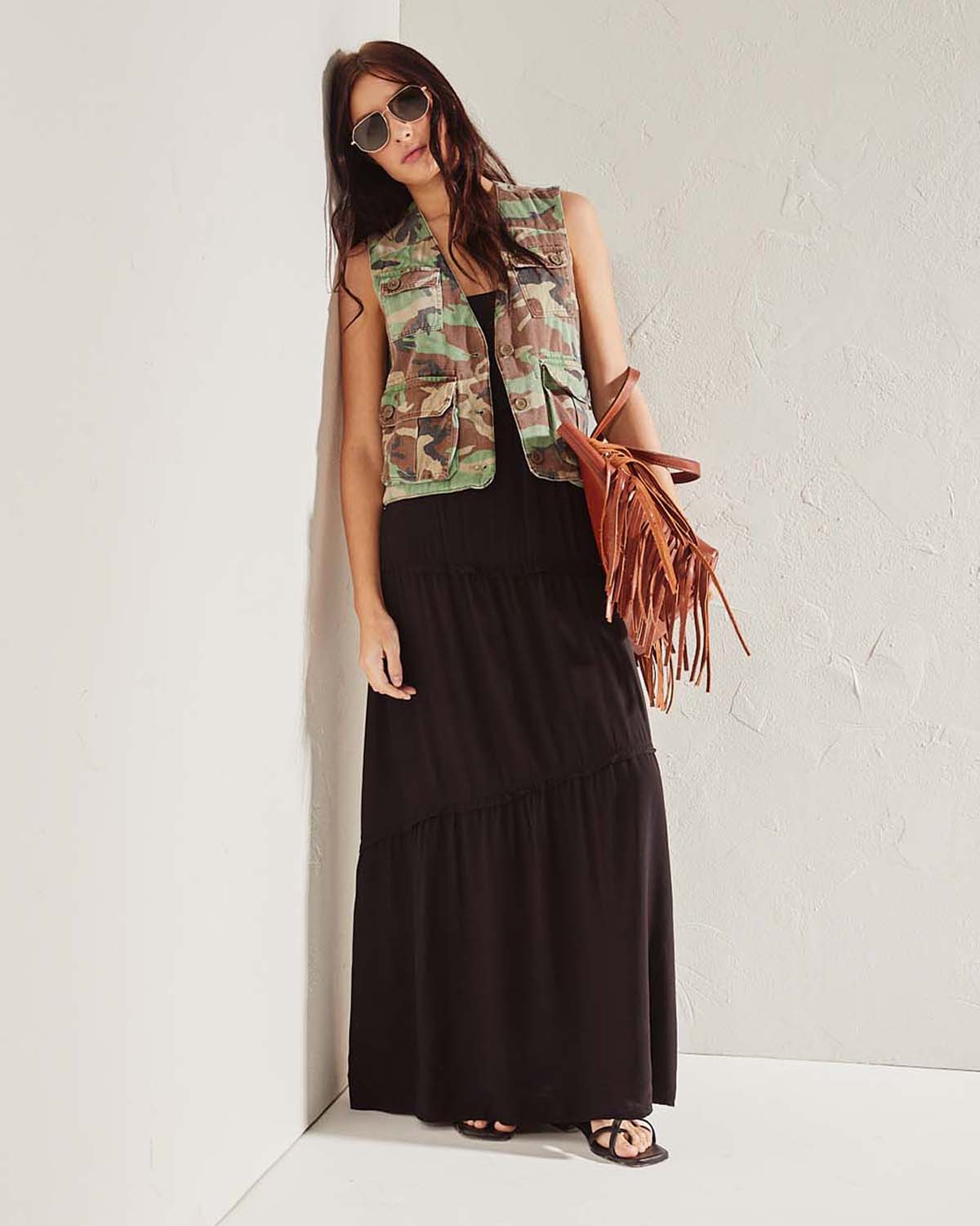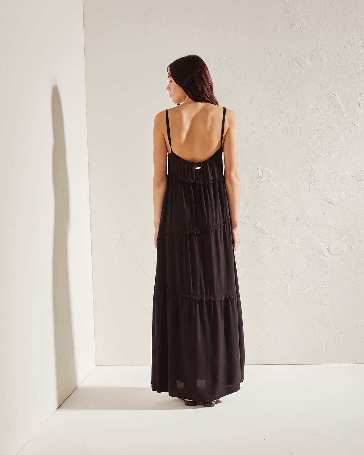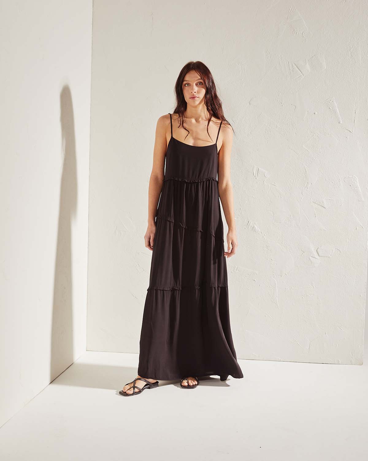 VESTIDO LARGO DE CALCE AMPLIO CONFECCIONADO EN RAYON. CON RECORTES IRREGULARES EN EL CUERPO Y VOLADITOS. BRETELES FINOS REGULABLES.