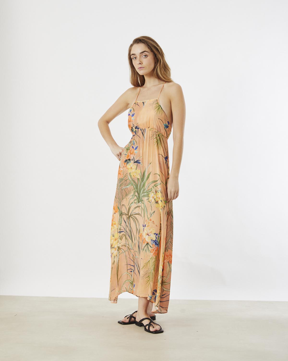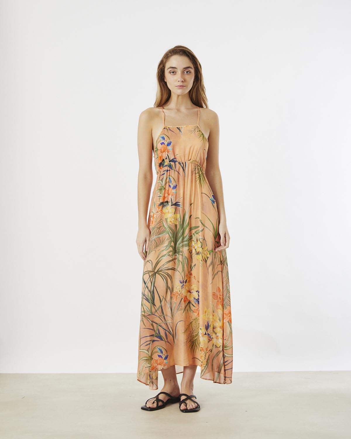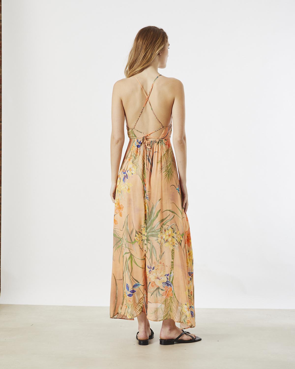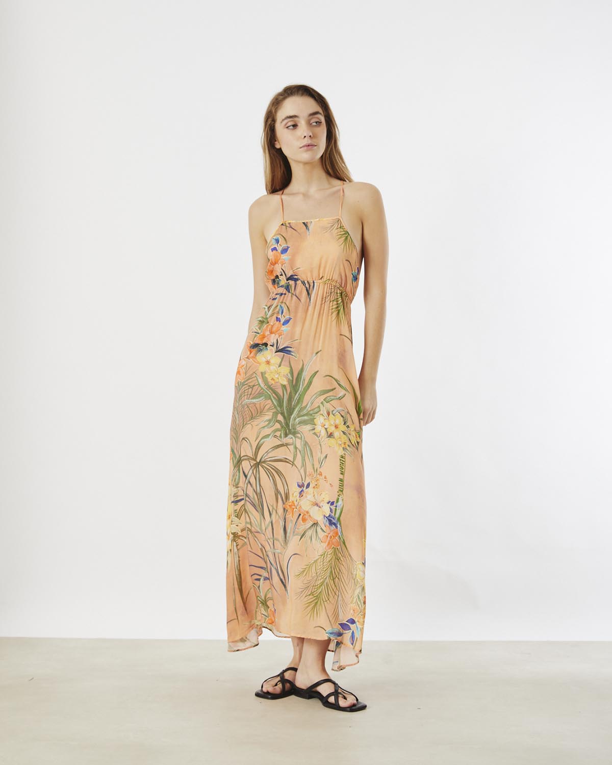 VESTIDO LARGO CONFECCIONADO EN VOILE DE VISCOSA ESTAMPADA CON FLORES. ESCOTE RECTO Y ESPALDA DESCUBIERTA CON BRETELES CRUZADOS REGULABLES. CALCE REGULAR.