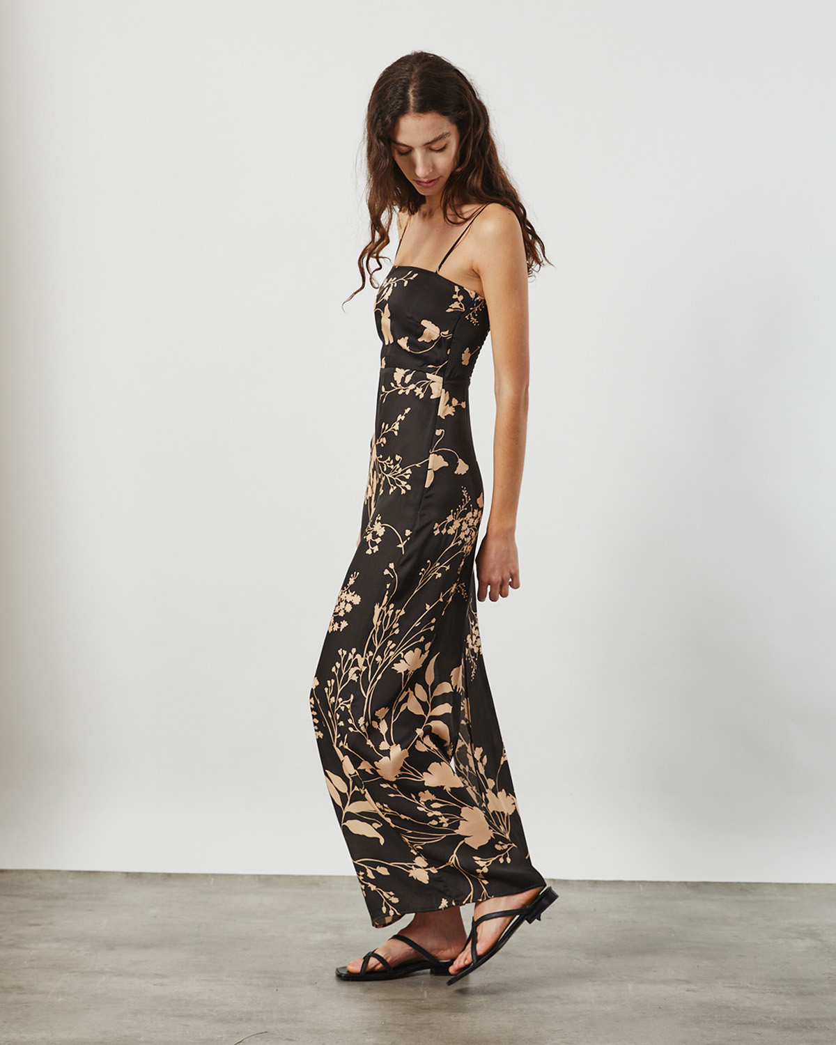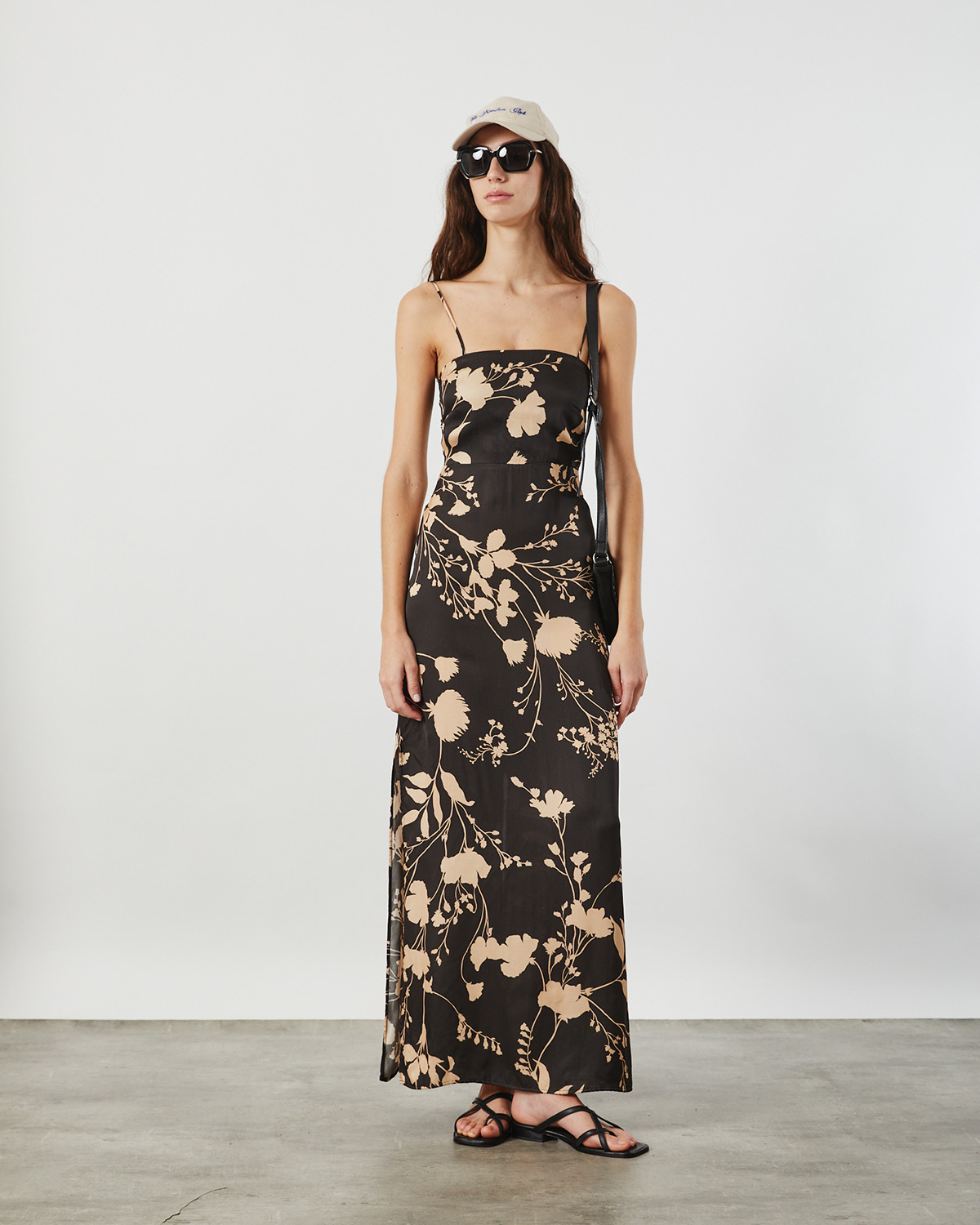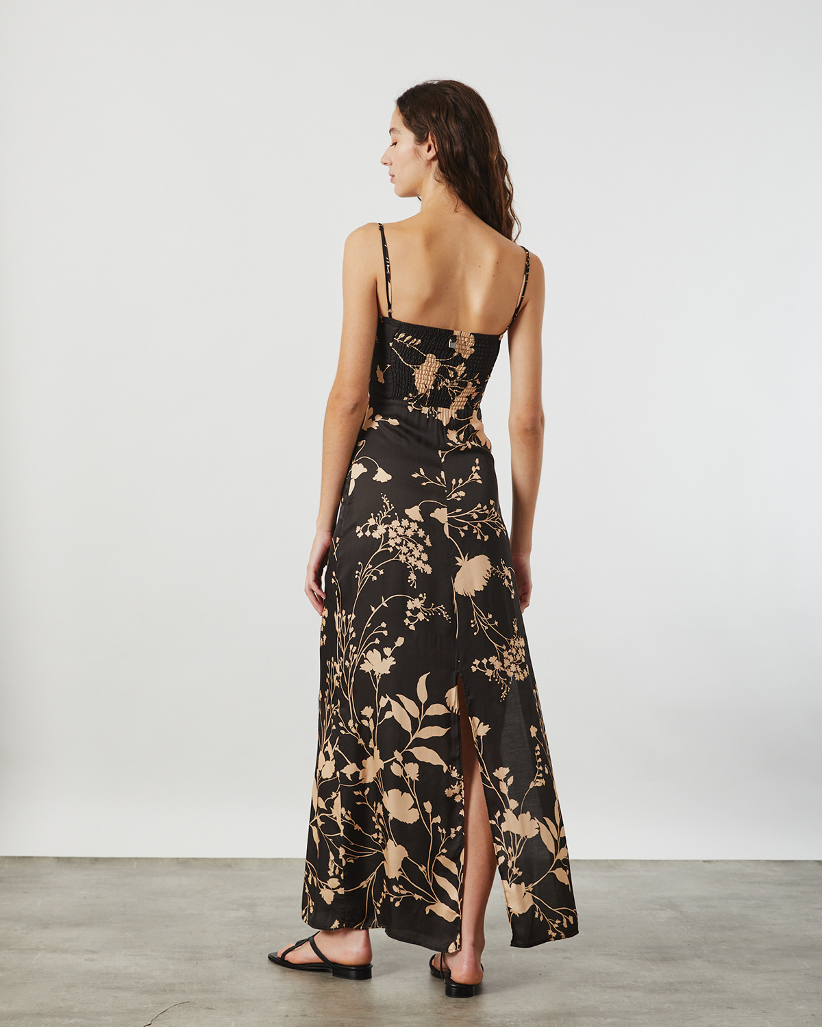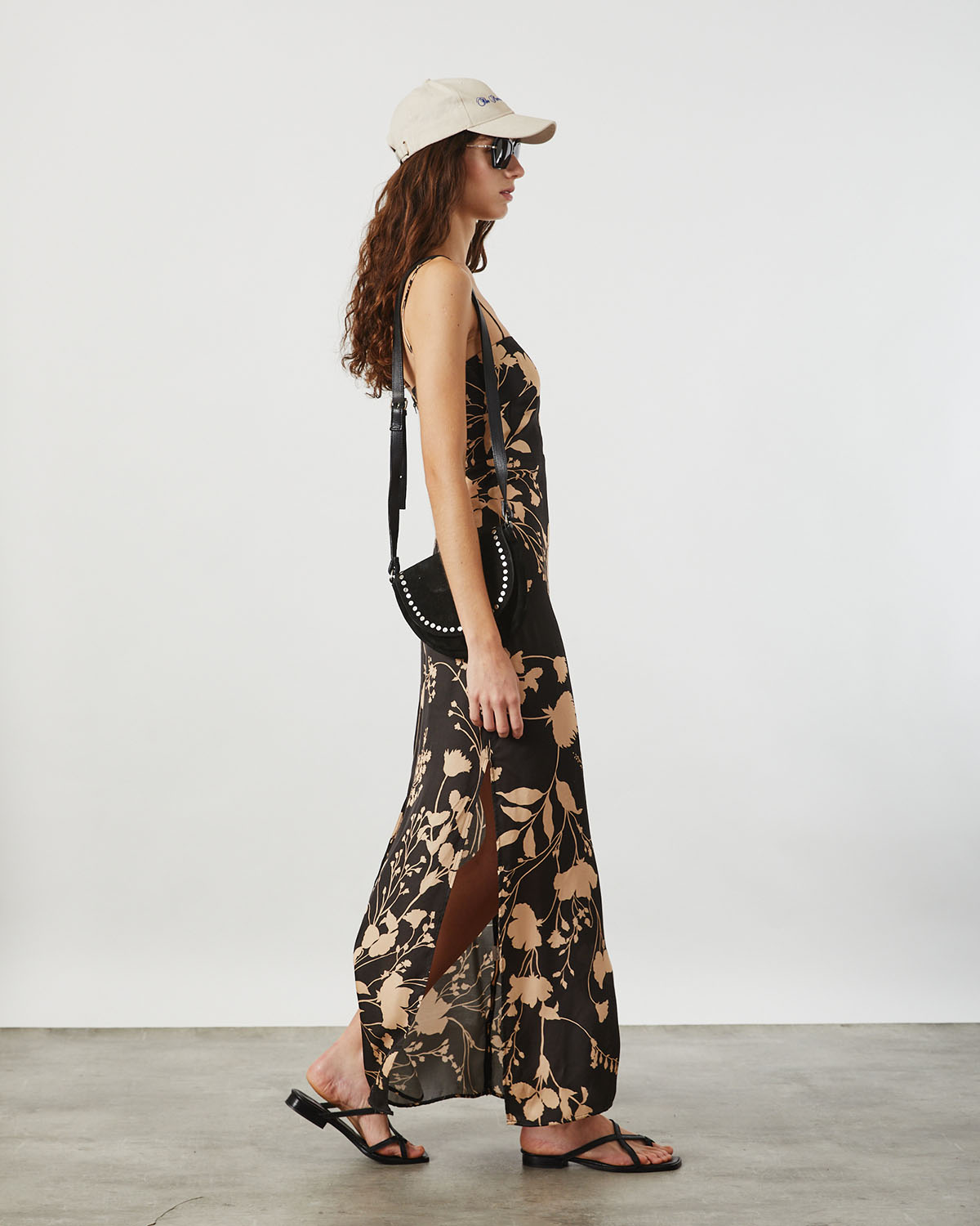 VESTIDO LARGO CONFECCIONADO EN VISCOSA CON TAJO EN EL LATERAL Y TAJO EN SU FALDA TRASERA.