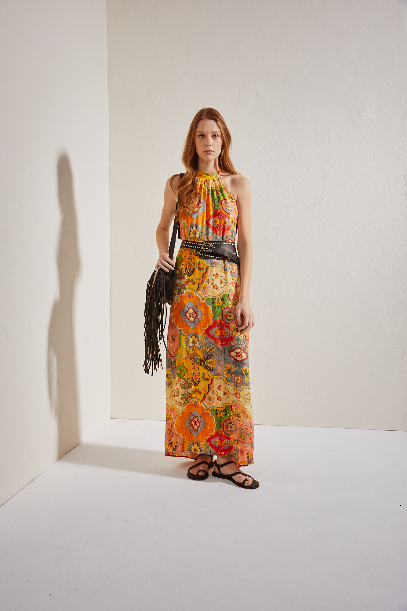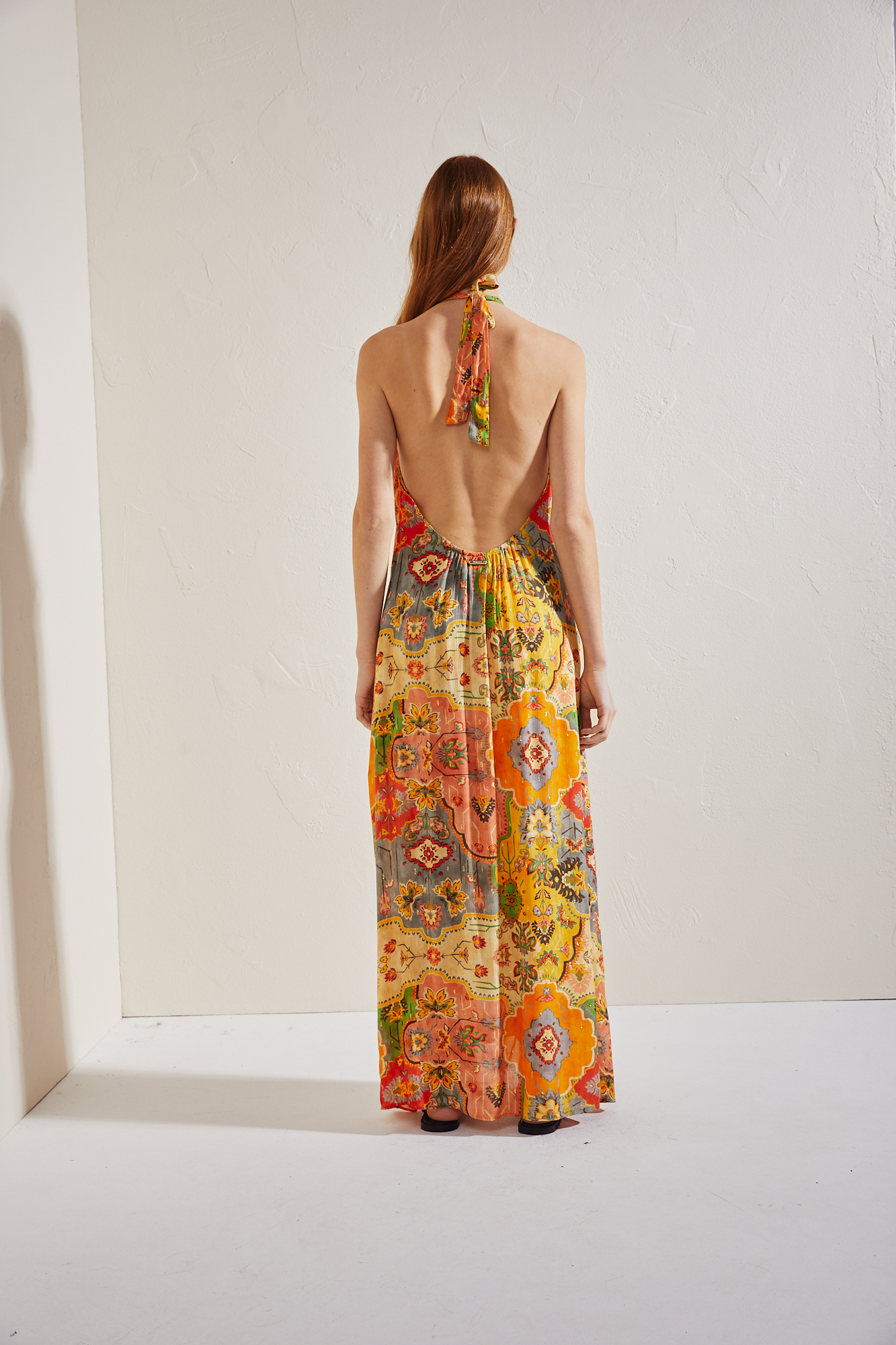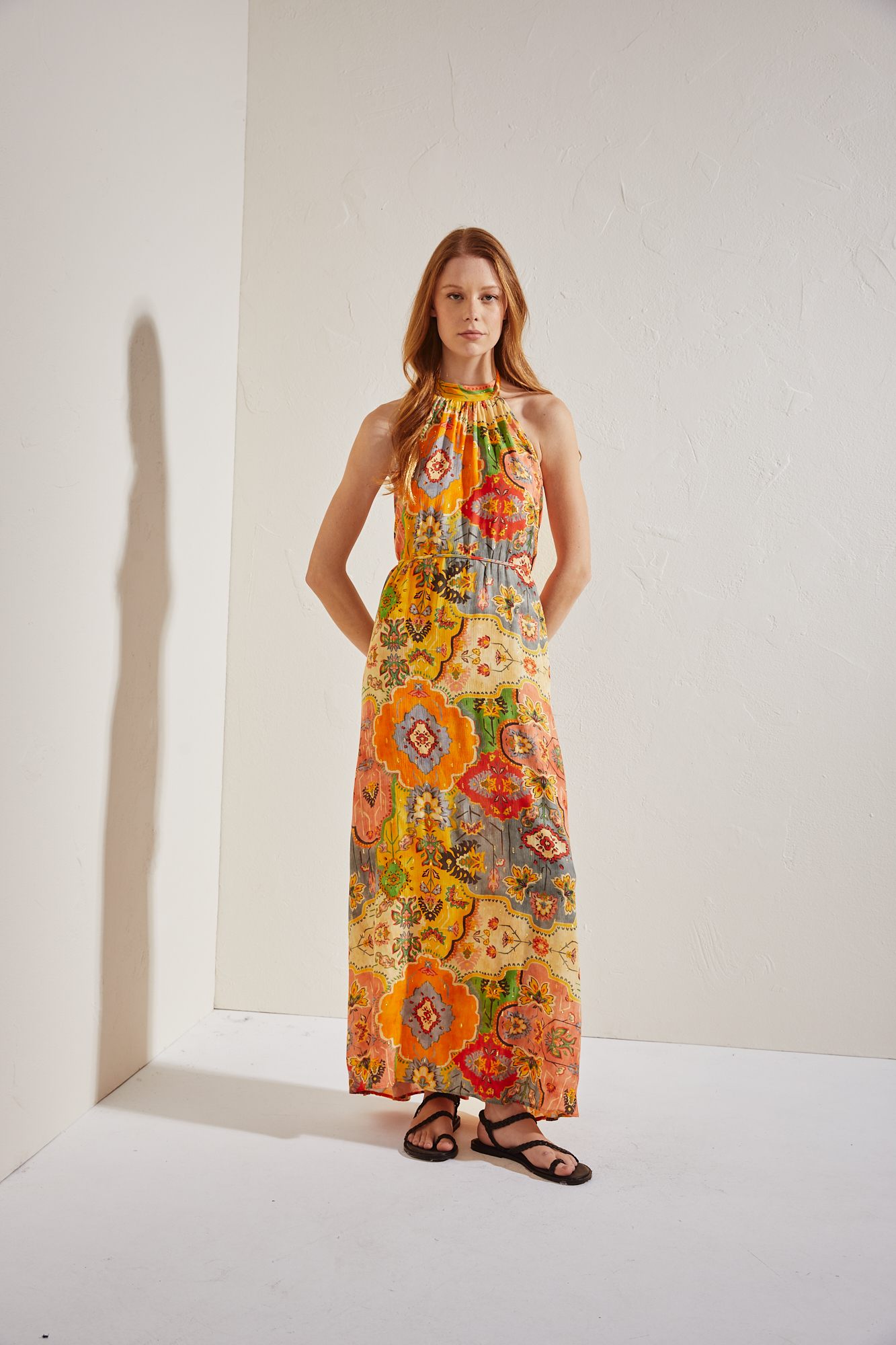 VESTIDO DE CALCE AMPLIO CONFECCIONADO EN VISCOSA ESTAMPADA CON DETALLES EN LUREX. ESCOTE TIPO HALTER CON LAZOS PARA ATAR EN LA ESPALDA. ESPALDA DESCUBIERTA Y BOLSILLOS OCULTOS EN LATERALES. POSEE LAZO PARA ANUDAR EN CINTURA.
