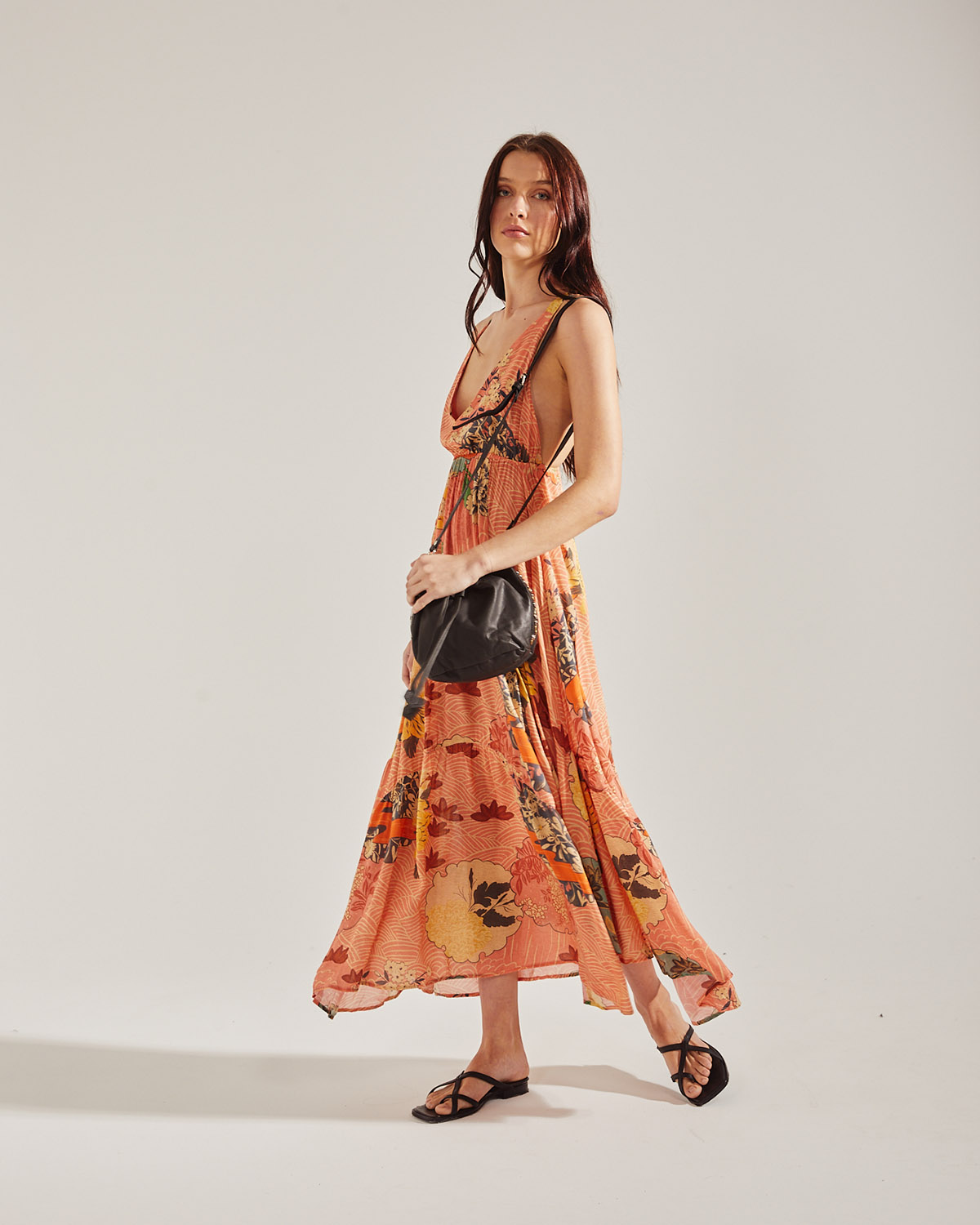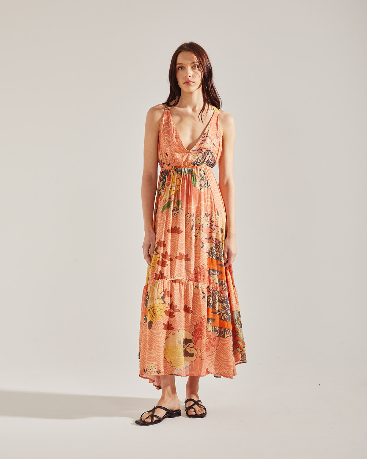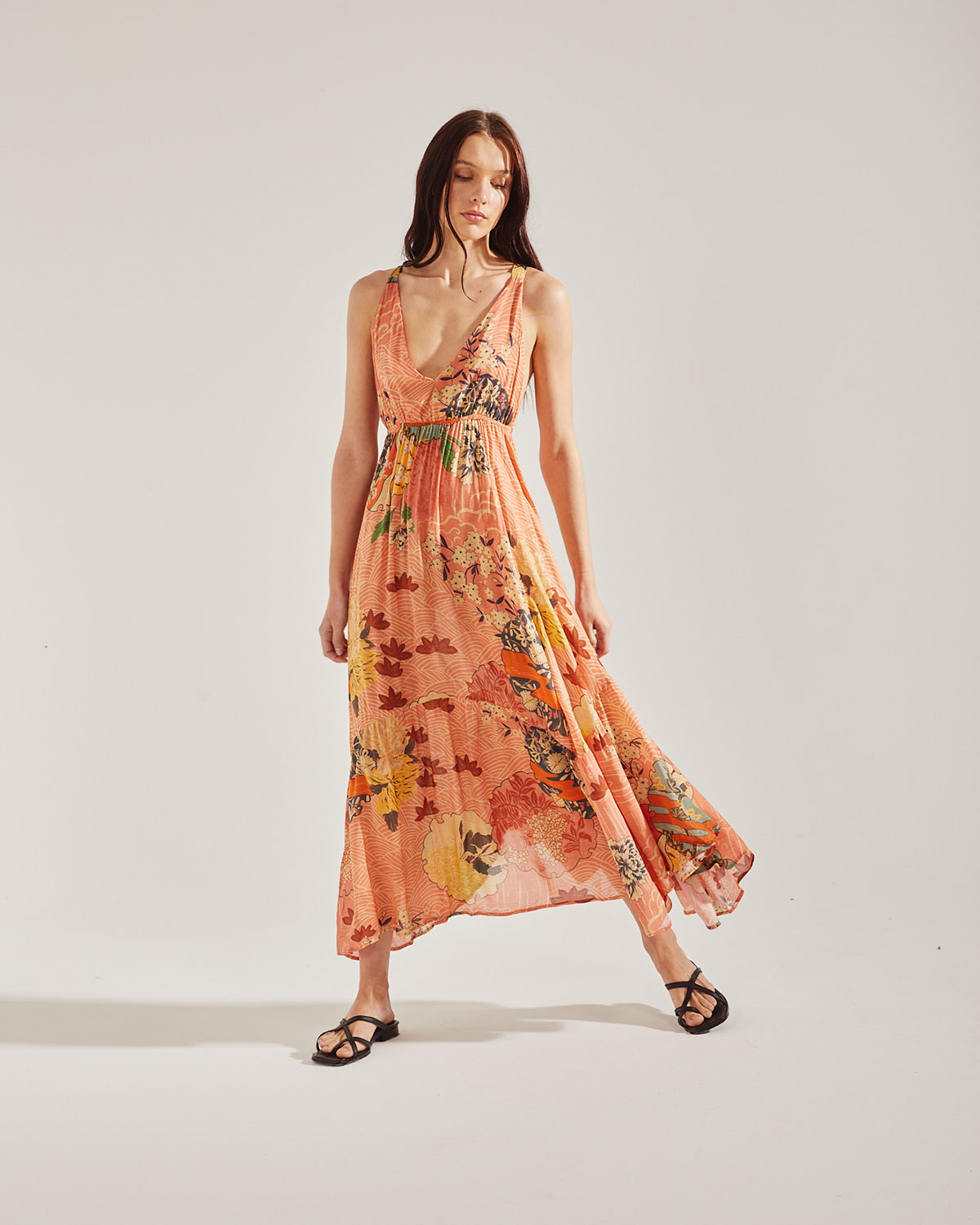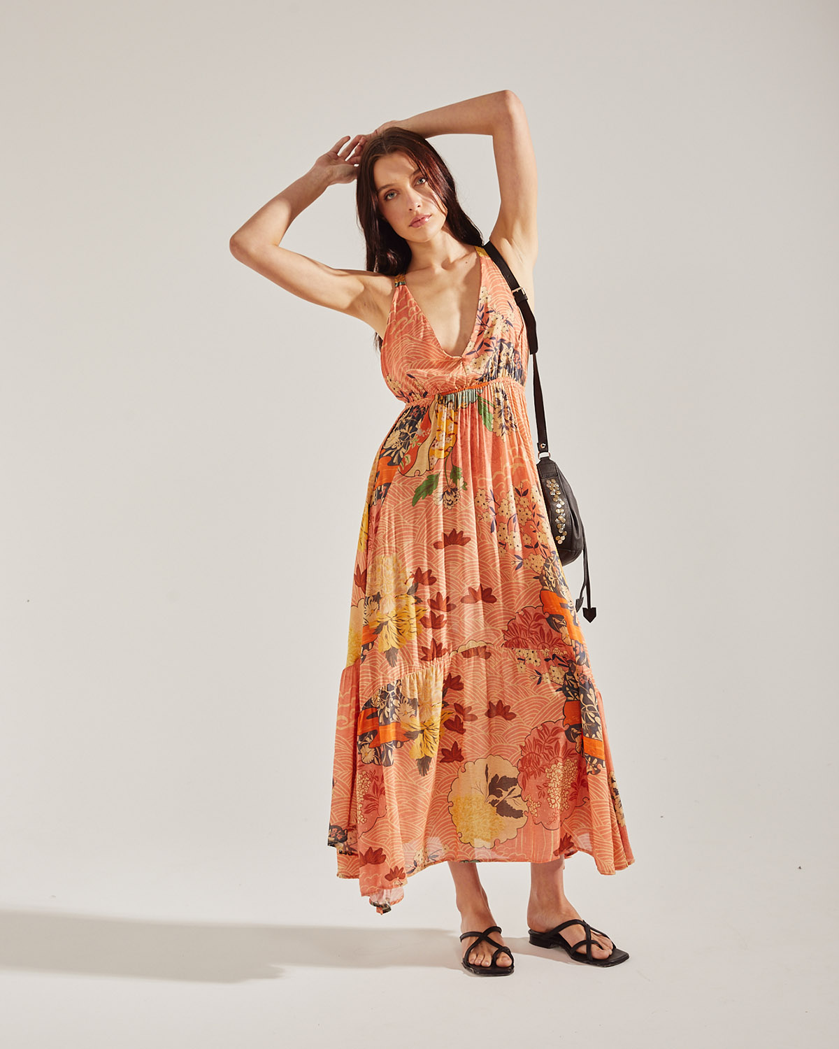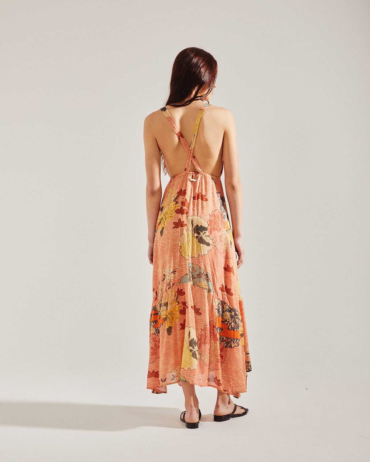 VESTIDO CONFECCIONADO EN VISCOSA ESTAMPADA ESCOTE PRONUNCIADO Y ESPALDA CRUZADA, FALDA MUY AMPLIA.