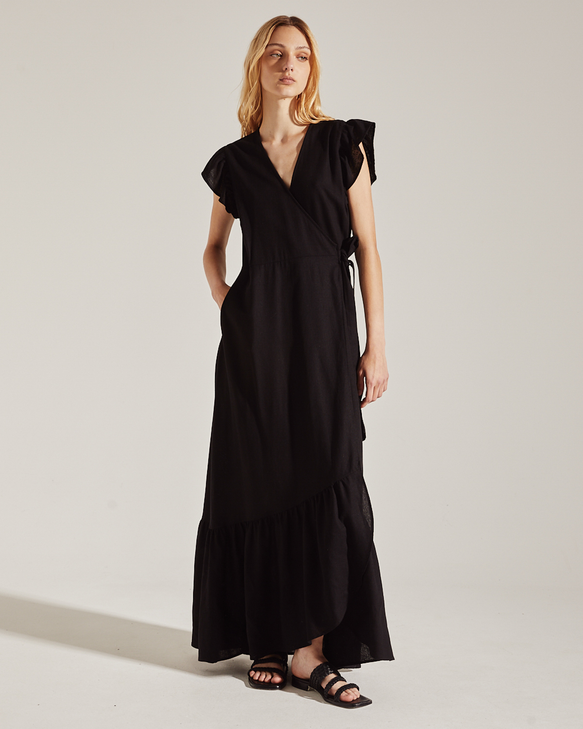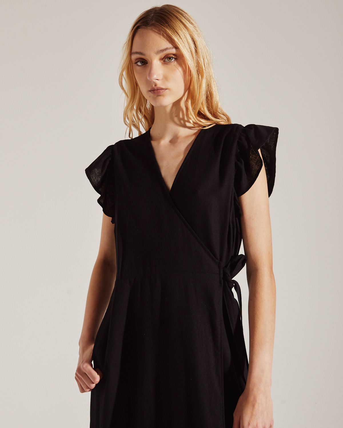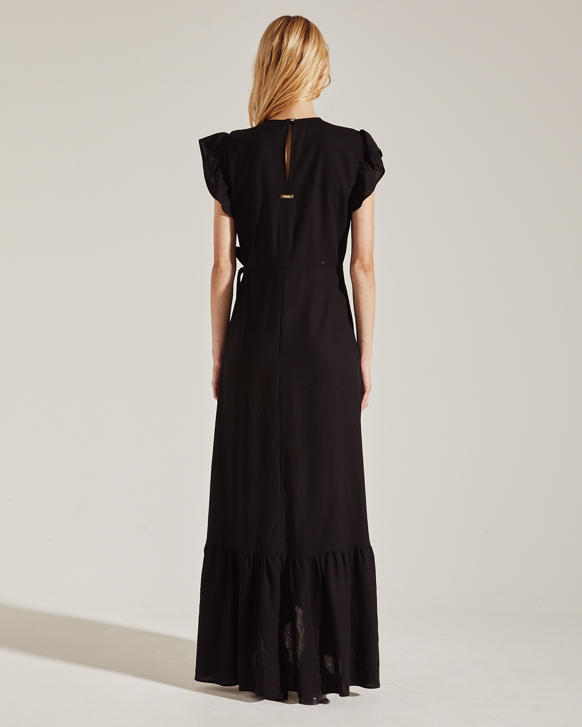 VESTIDO LARGO CONFECCIONADO EN LINO LISO. CON CRUCE Y LAZO PARA ATAR, Y VOLADOS EN EL RUEDO.