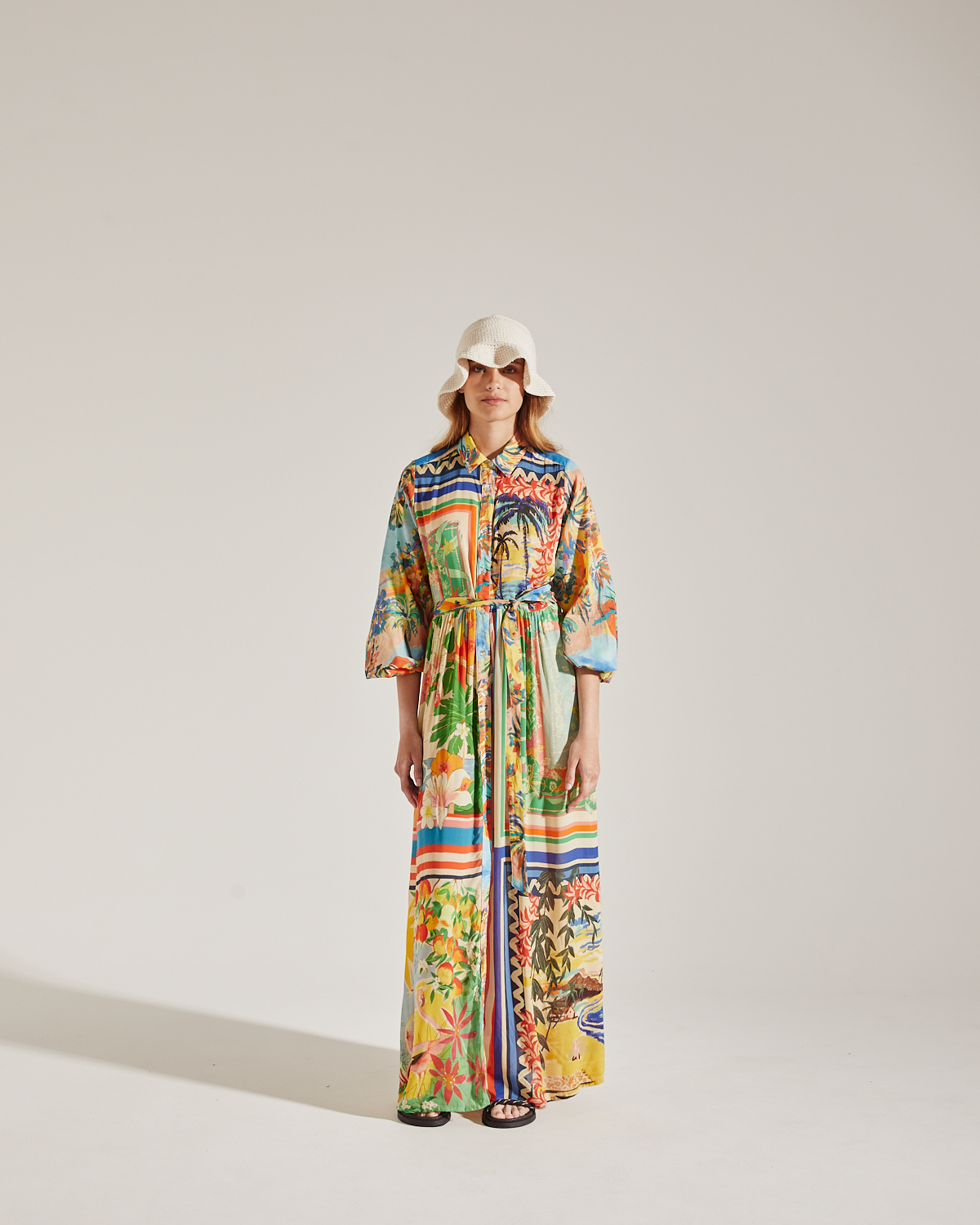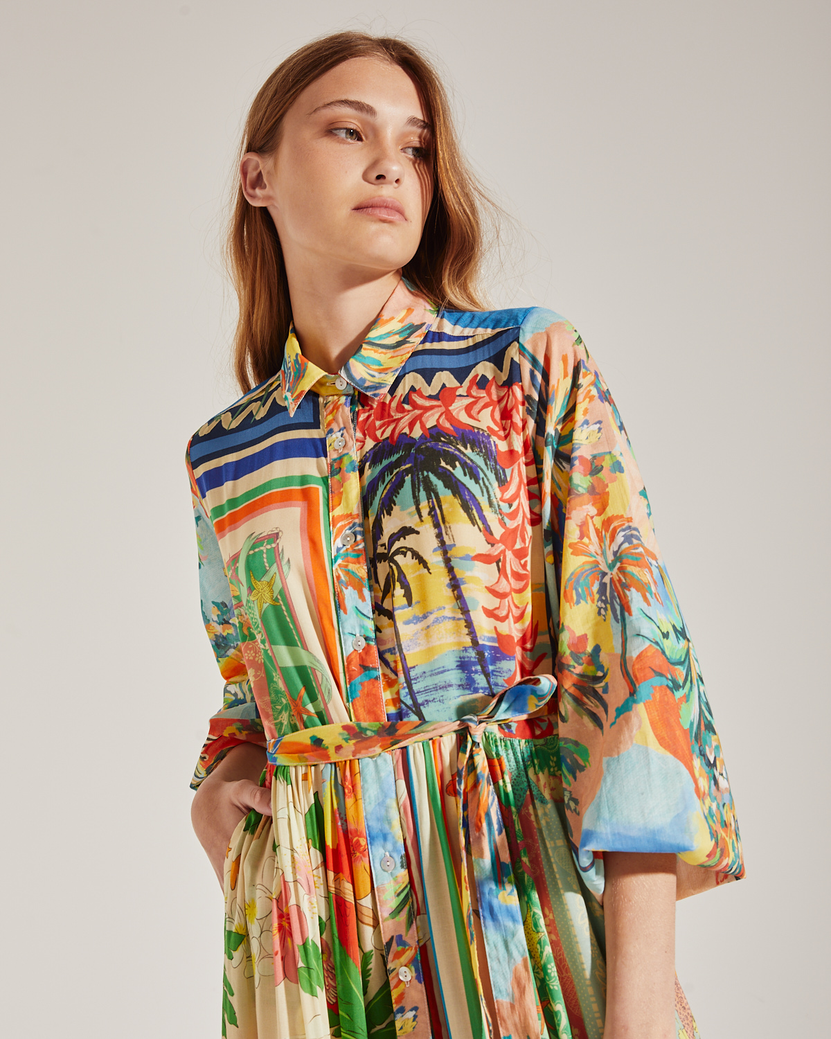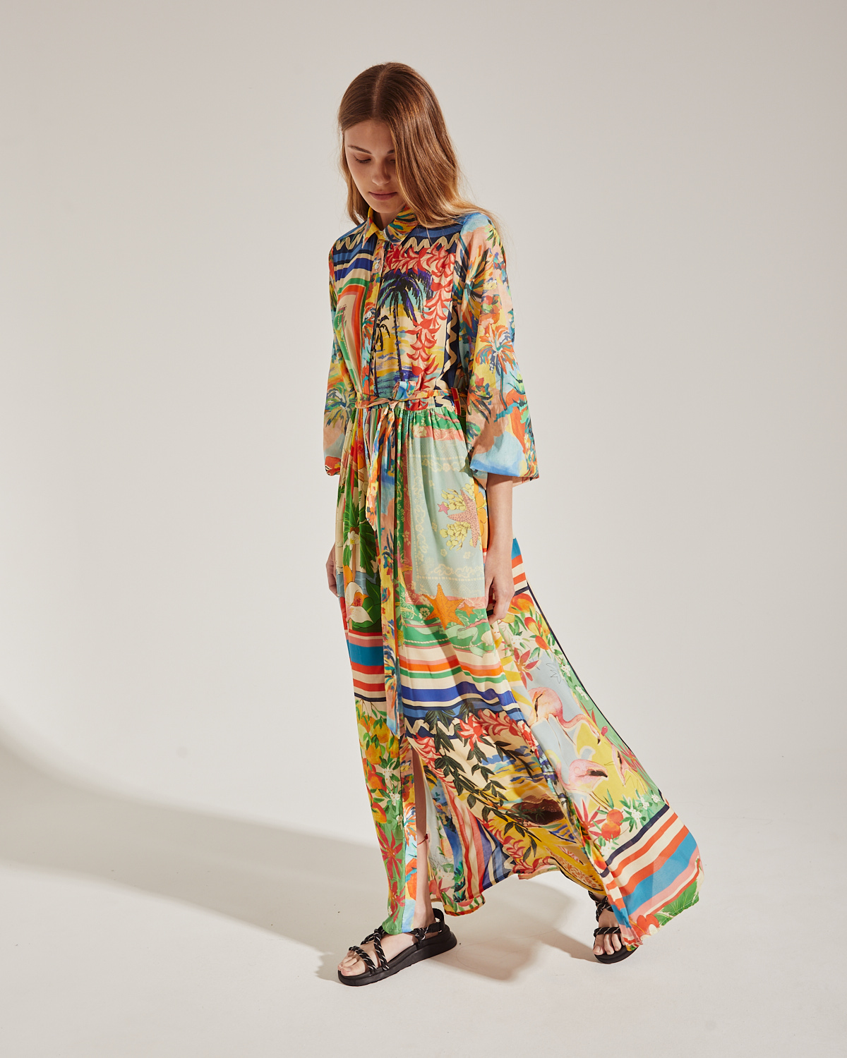 CHEMISE LARGA CONFECCIONADA EN VISCOSA DE 3 ESTAMPADOS DIFERENTES. CARTERA CON BOTONES A LA VISTA HASTA EL FINAL.
