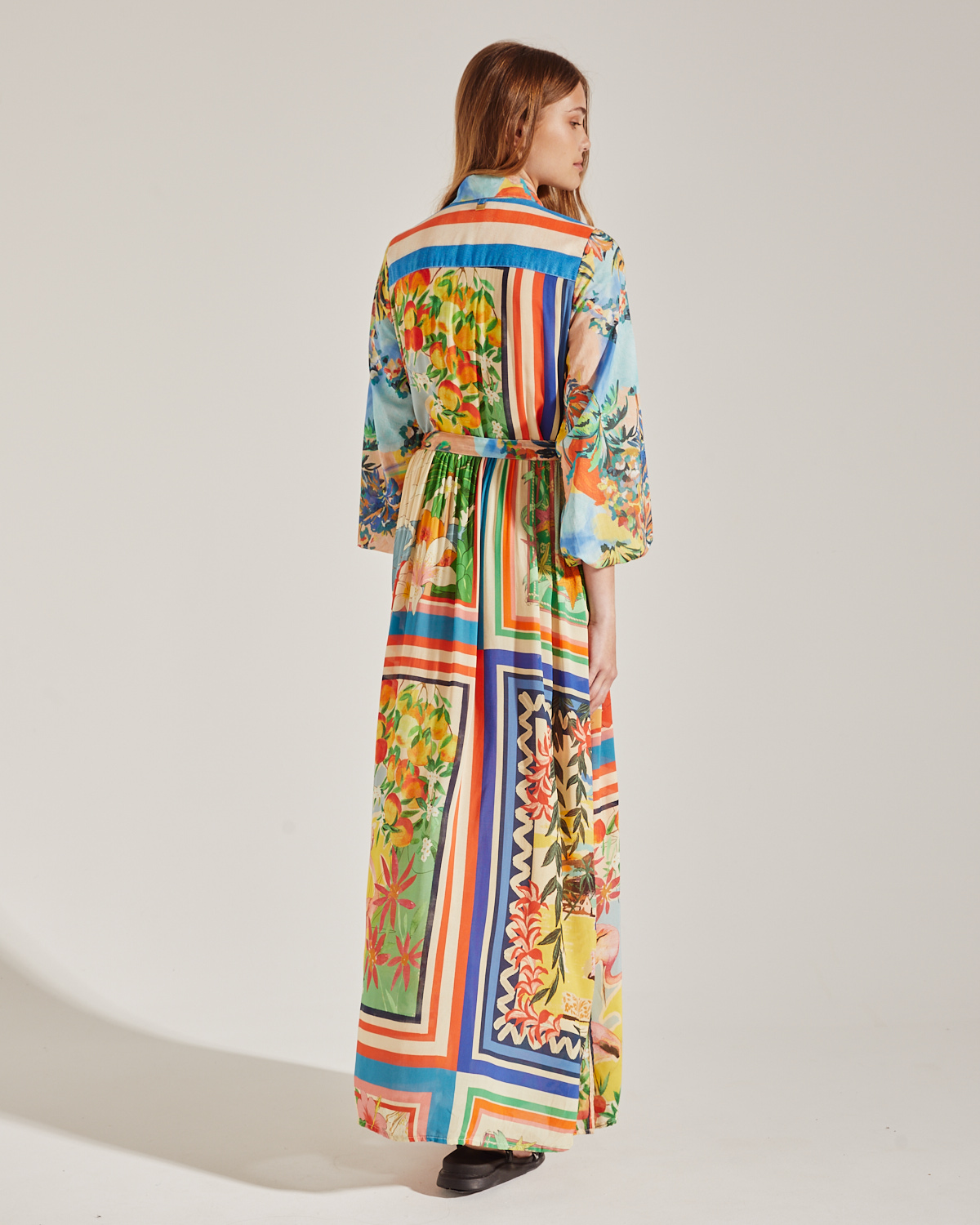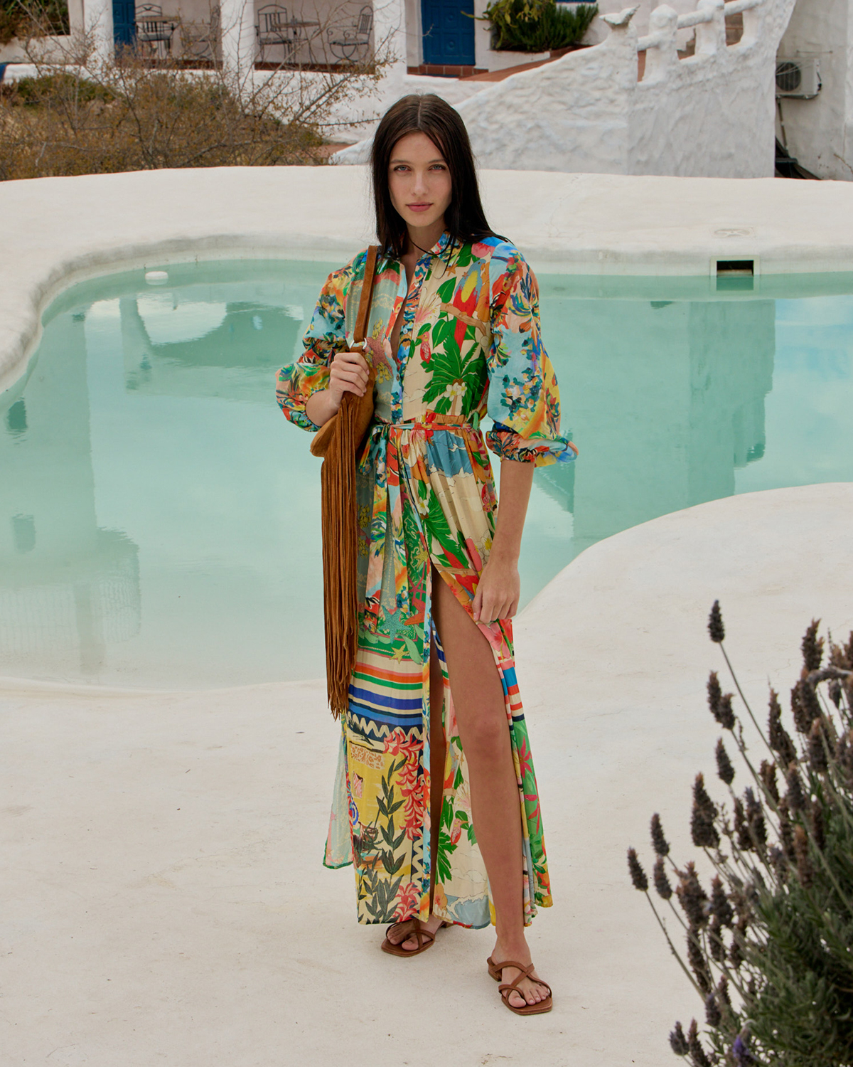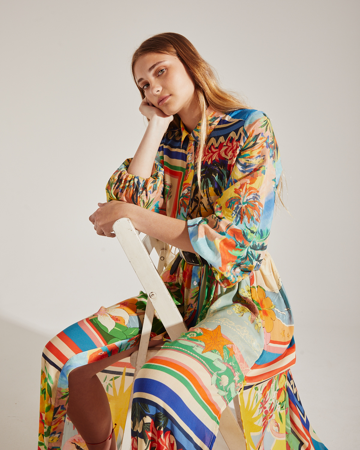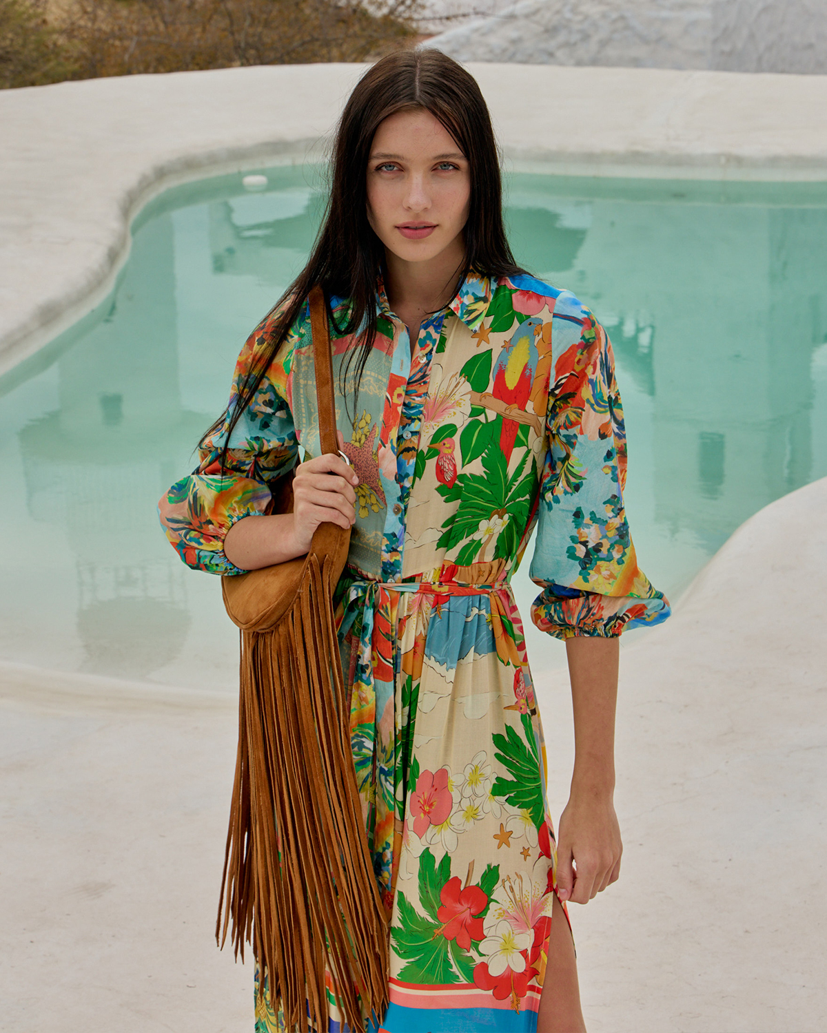 CHEMISE LARGA CONFECCIONADA EN VISCOSA DE 3 ESTAMPADOS DIFERENTES. CARTERA CON BOTONES A LA VISTA HASTA EL FINAL.