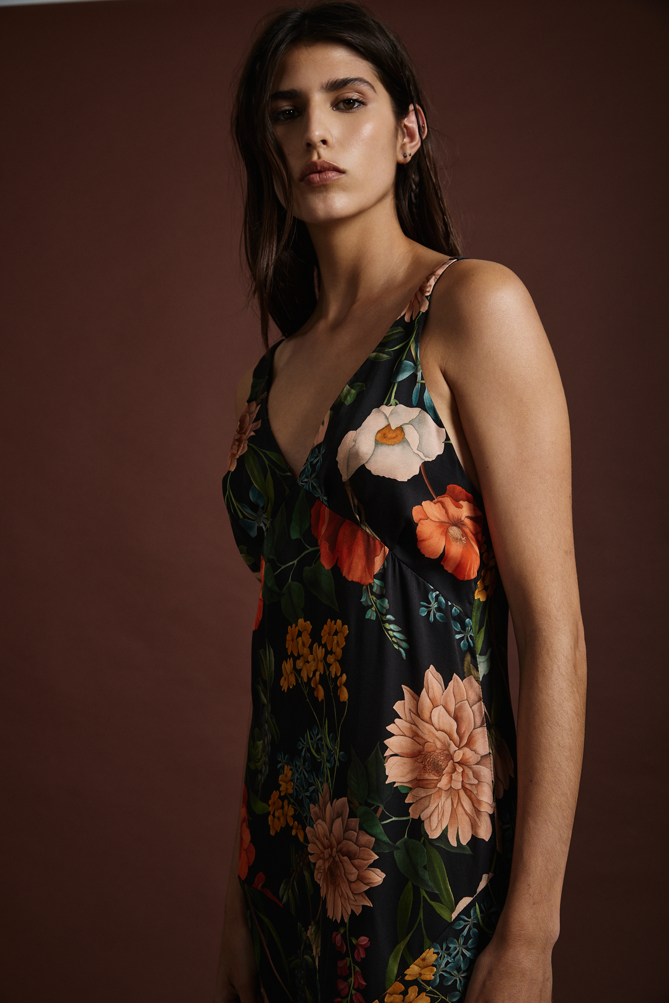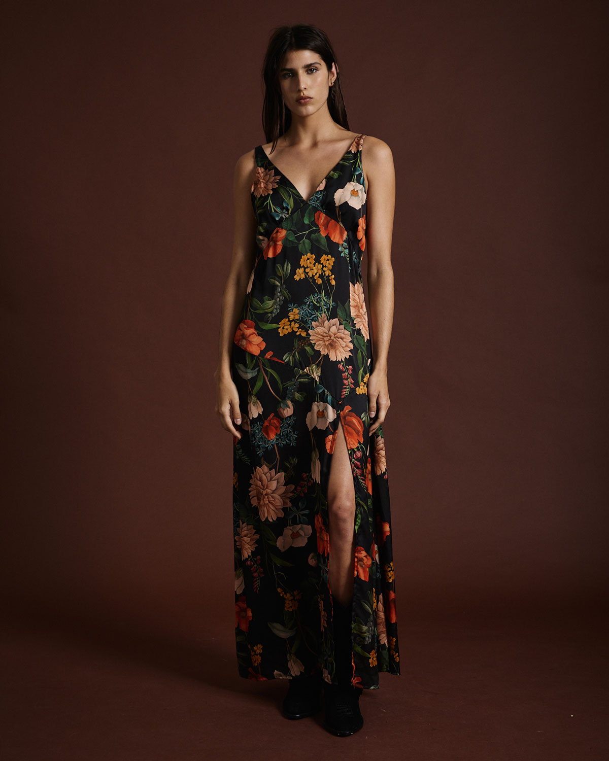 VESTIDO CONFECCIONADO EN VISCOSA ESTAMPADA. LARGO CON TAJO EN PIERNA Y RECORTES PARA ACENTUAR.