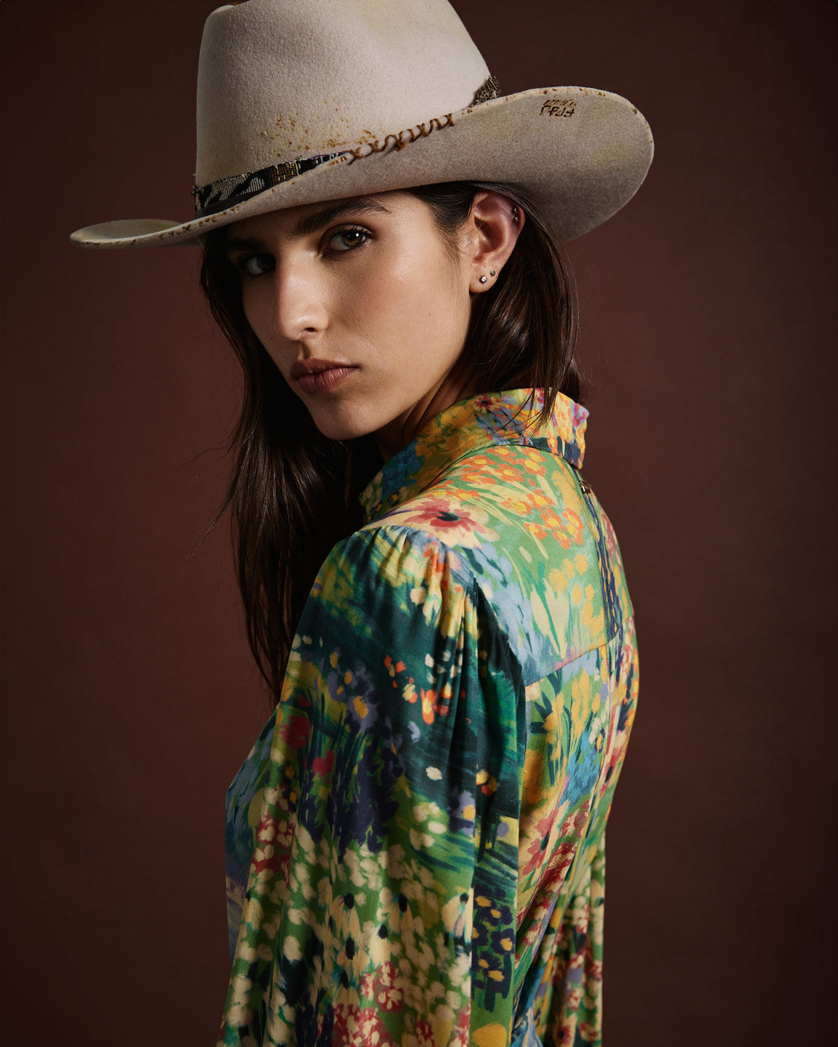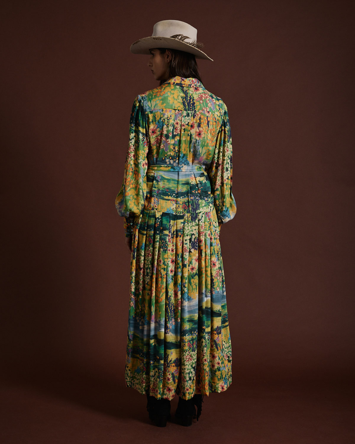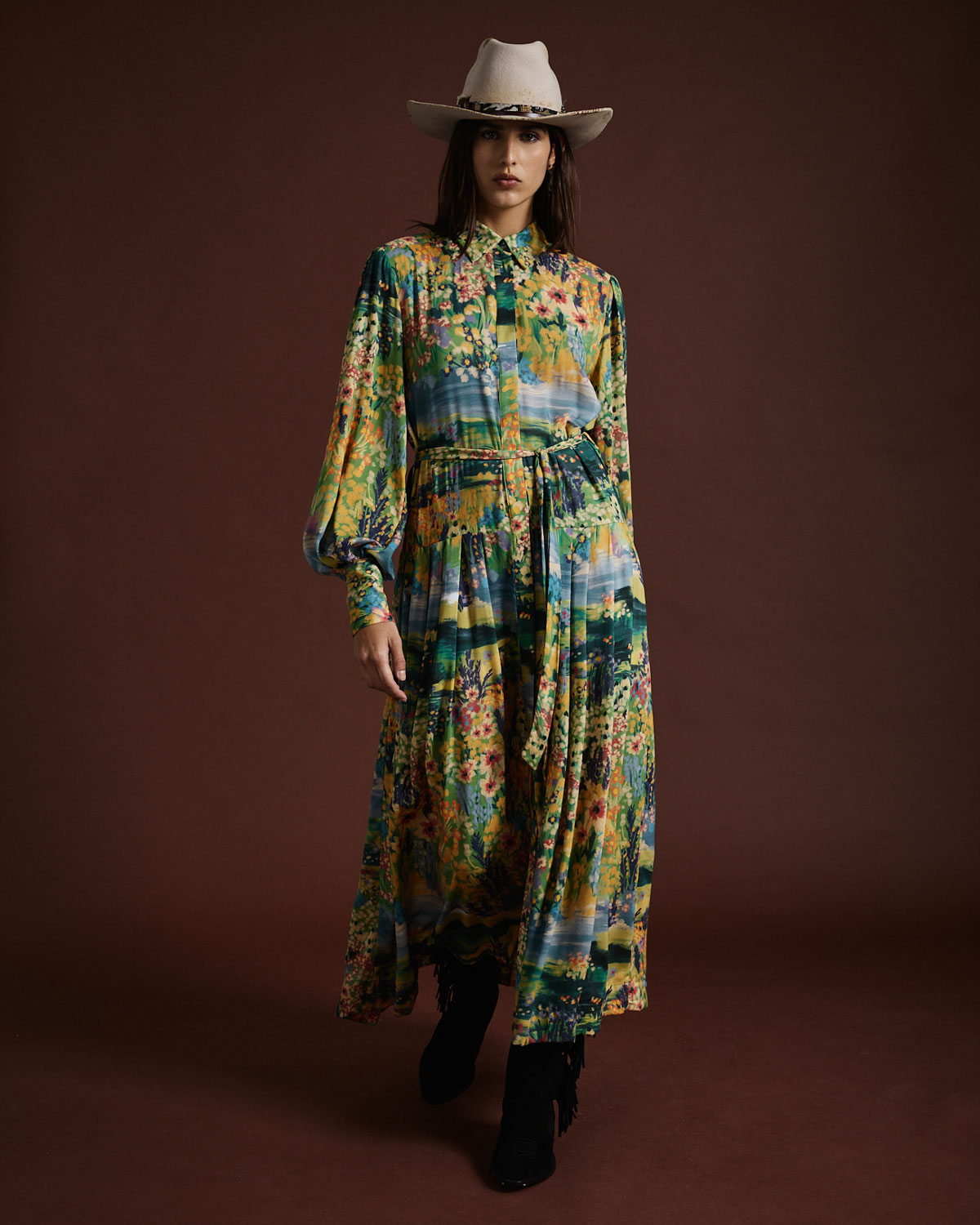 VESTIDO LARGO CONFECCIONADO EN VISCOSA ESTAMPADA.