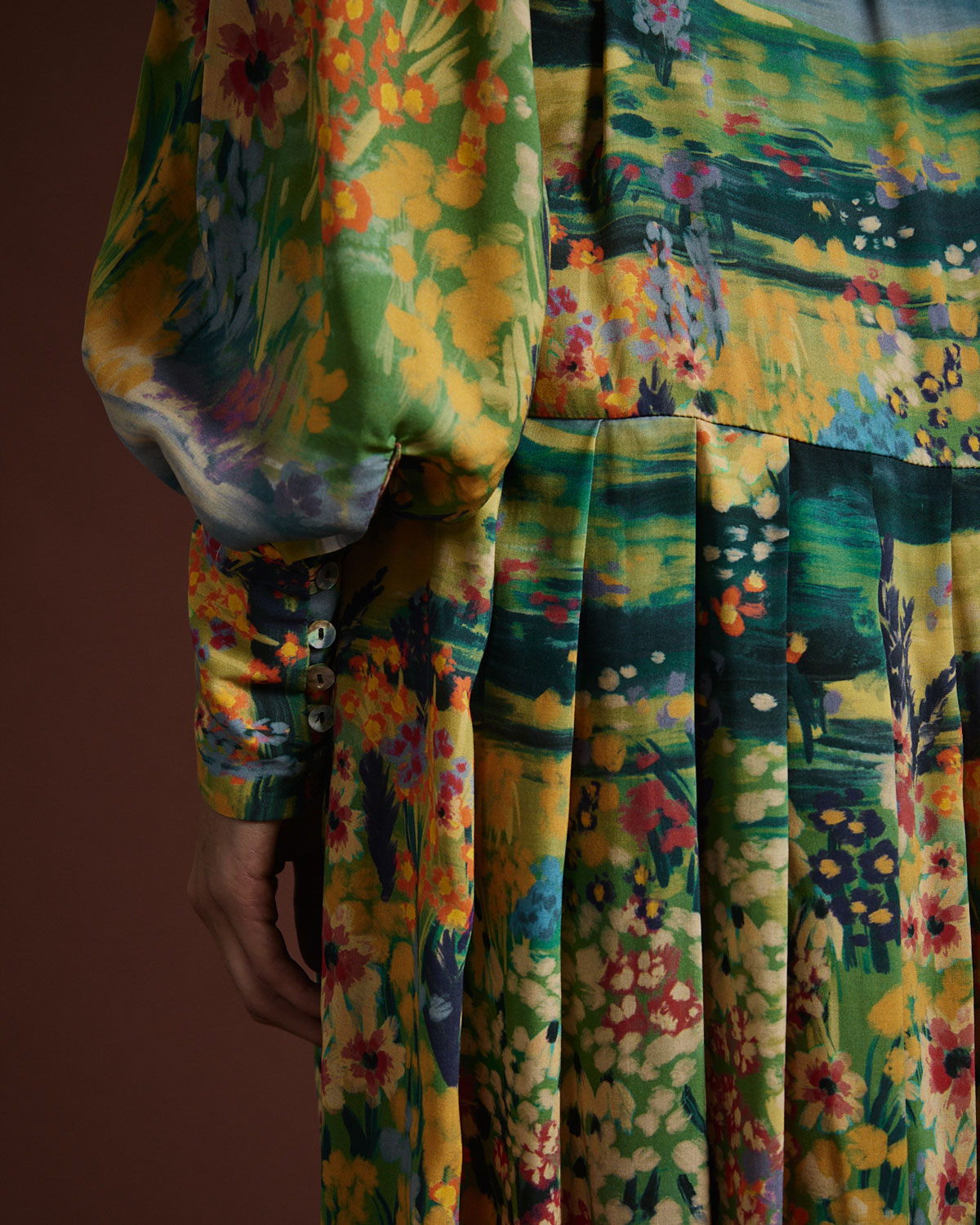 ACCESO CON CARTERA Y BOTONES NÁCAR A LA VISTA. MANGAS AMPLIAS CON VOLUMEN Y PUÑOS CON BOTONES.