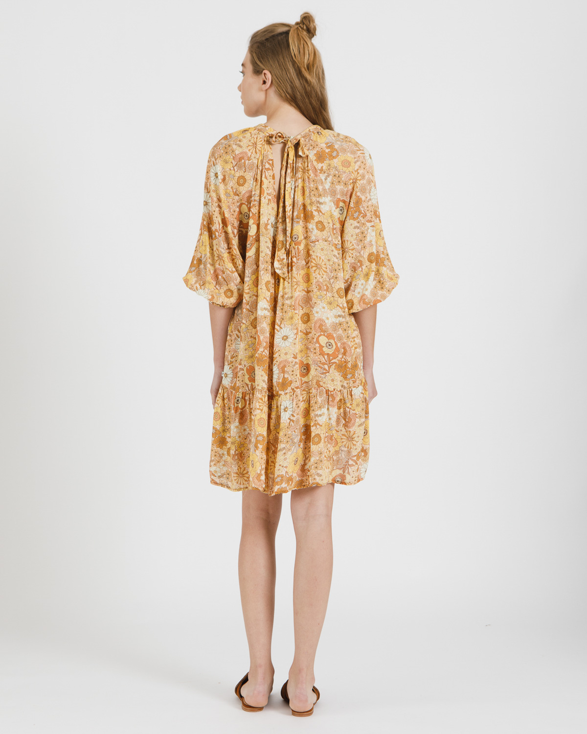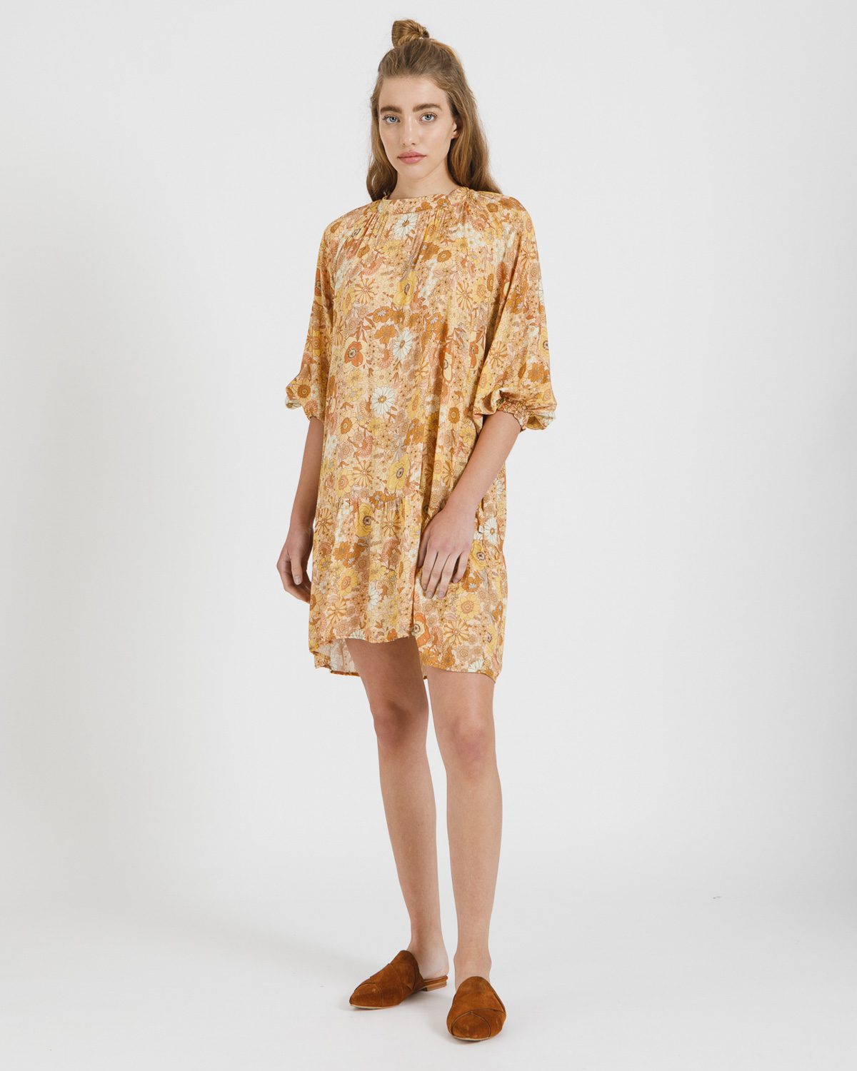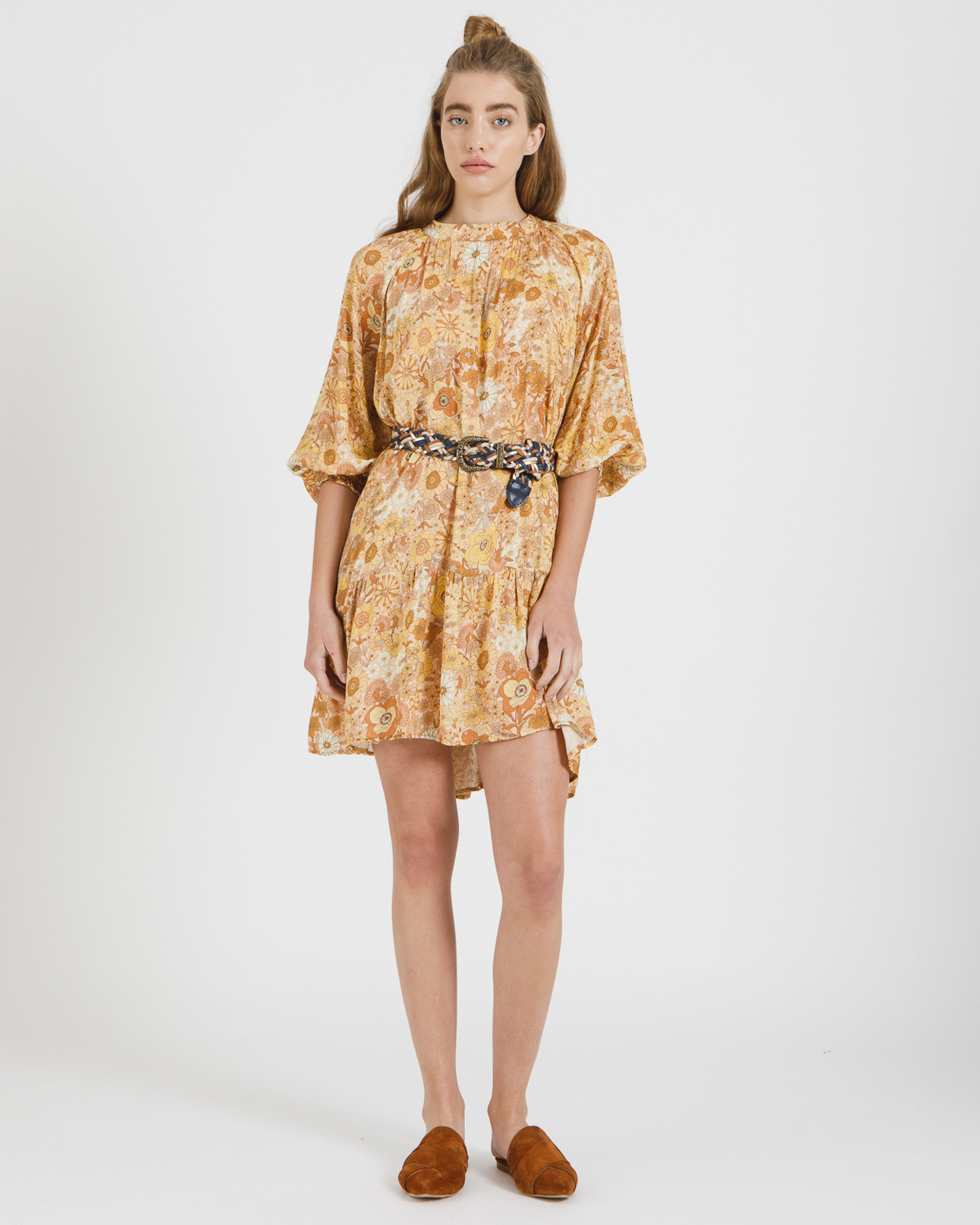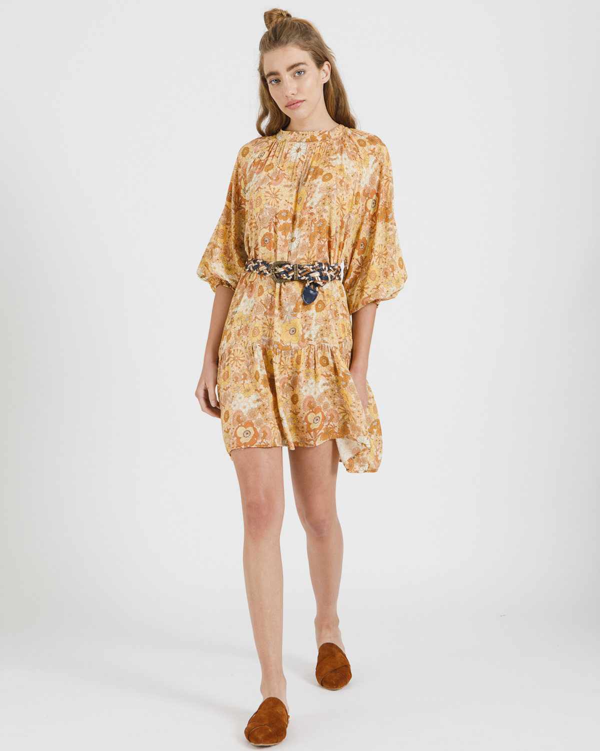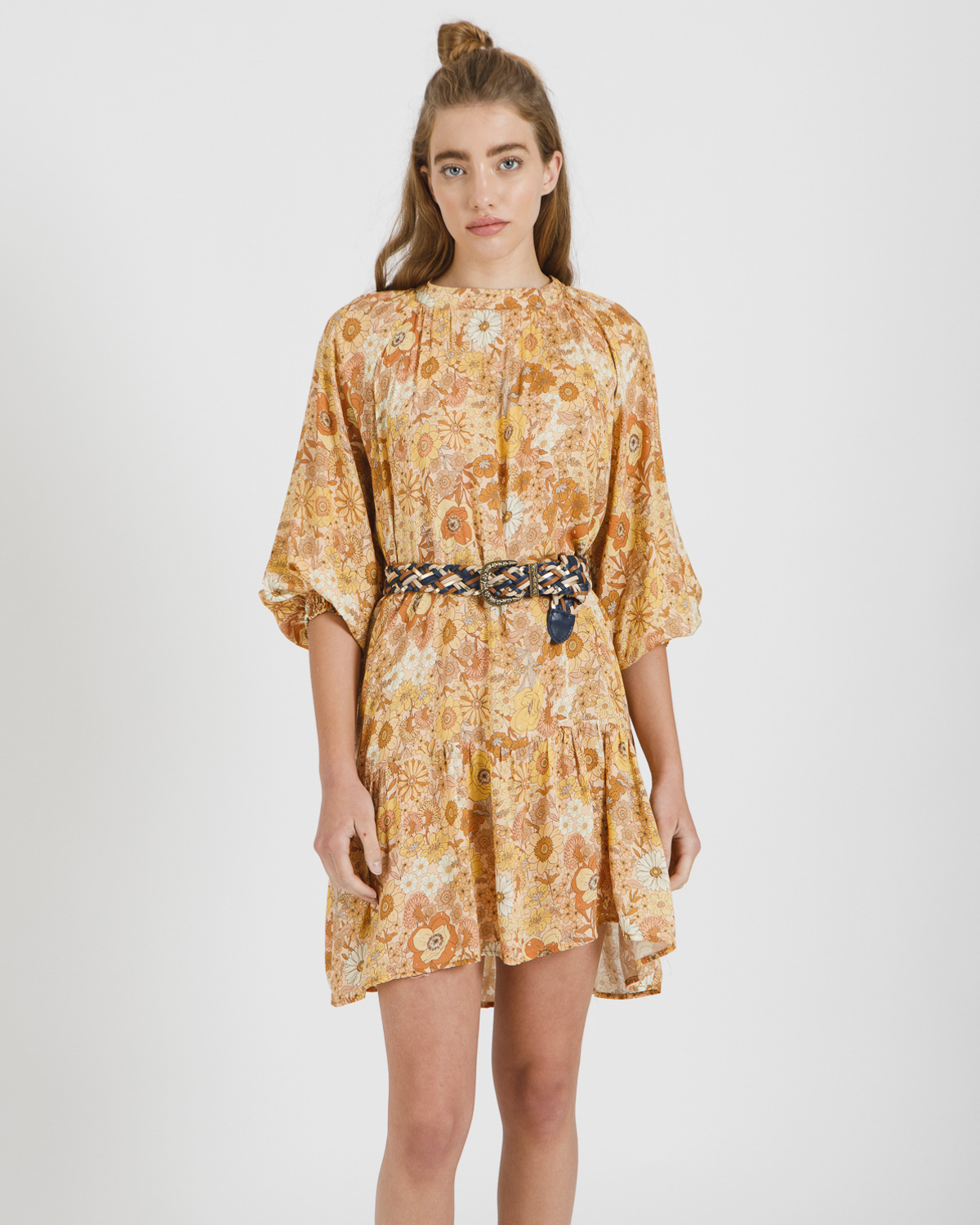 VESTIDO CONFECCIONADO EN VOILE DE VISCOSA ESTAMPADO. CALCE HOLGADO POR FRUNCES EN CUERPO Y MANGAS. CUELLO REGULABLE CON LAZO. LARGO MIDI Y MANGAS BALLOON.