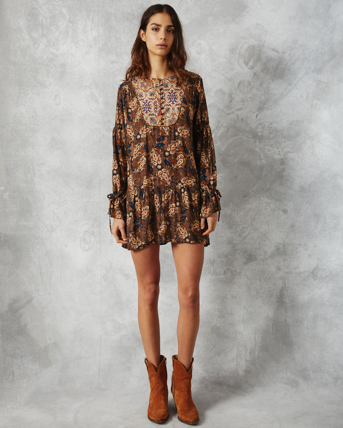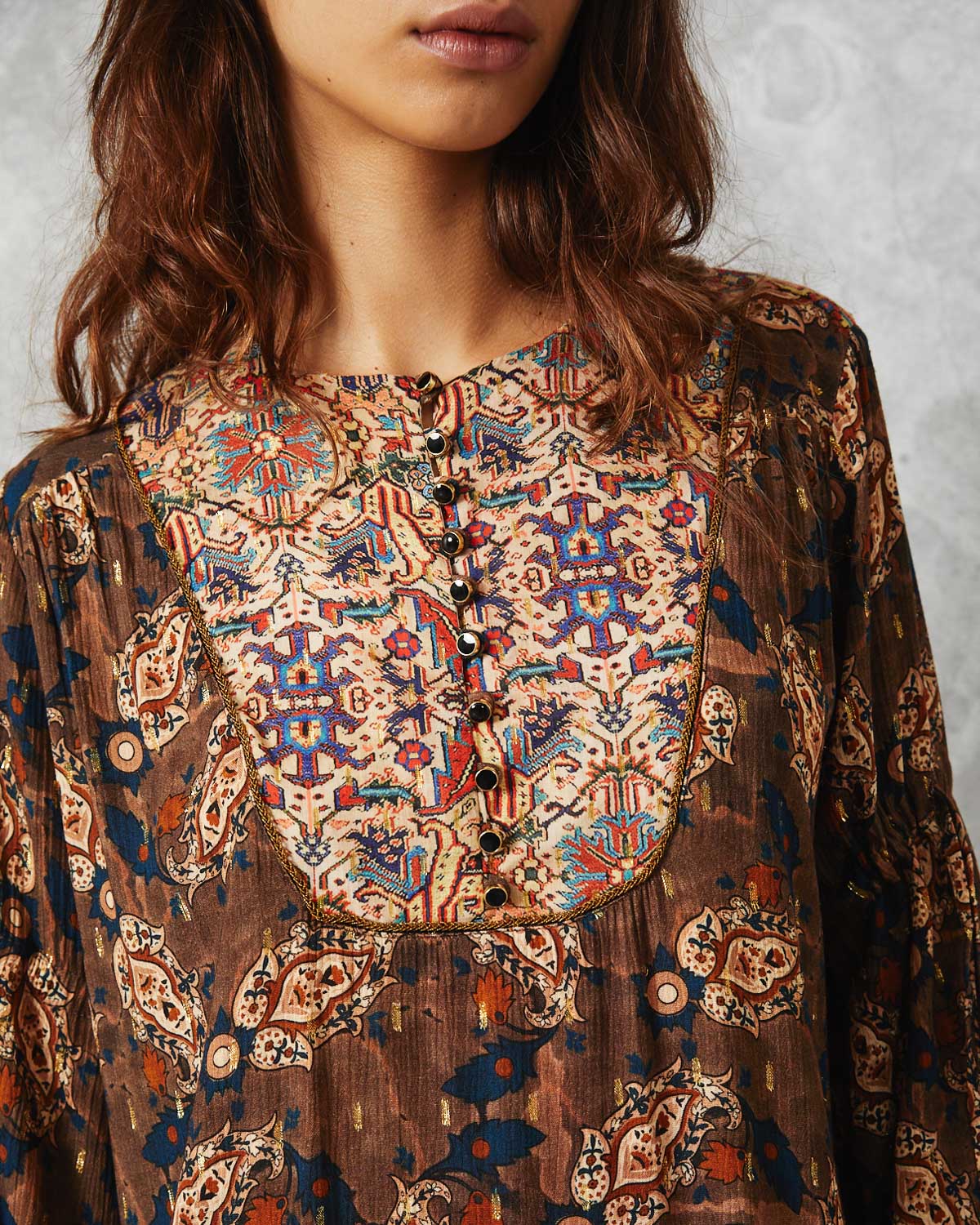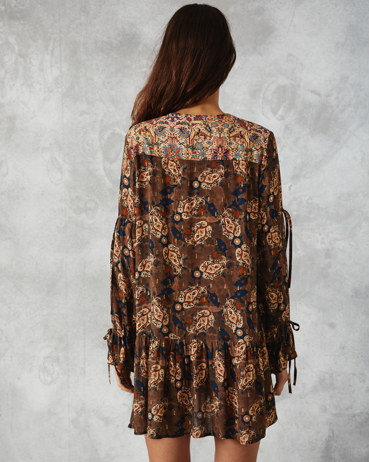 VESTIDO AMPLIO CONFECCIONADO EN VISCOSA ESTAMPADA CON DETALLES EN LUREX. COMBINACION DE ESTAMPAS. MANGAS BALLOON CON LAZOS PARA AJUSTAR.