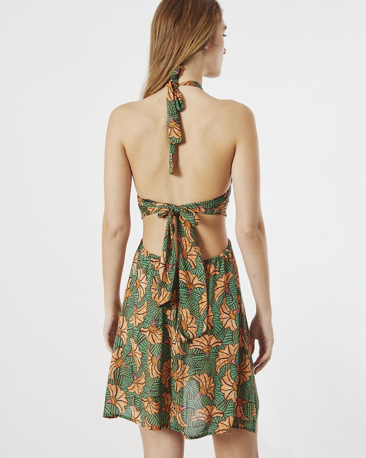VESTIDO CONFECCIONADO EN VISCOSA ESTAMPADA CON ESPALDA DESCUBIERTA Y REGULABLE. LAZO PARA ATAR EN CUELLO.